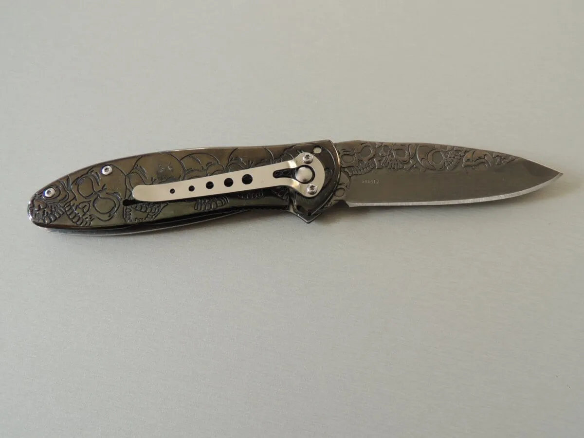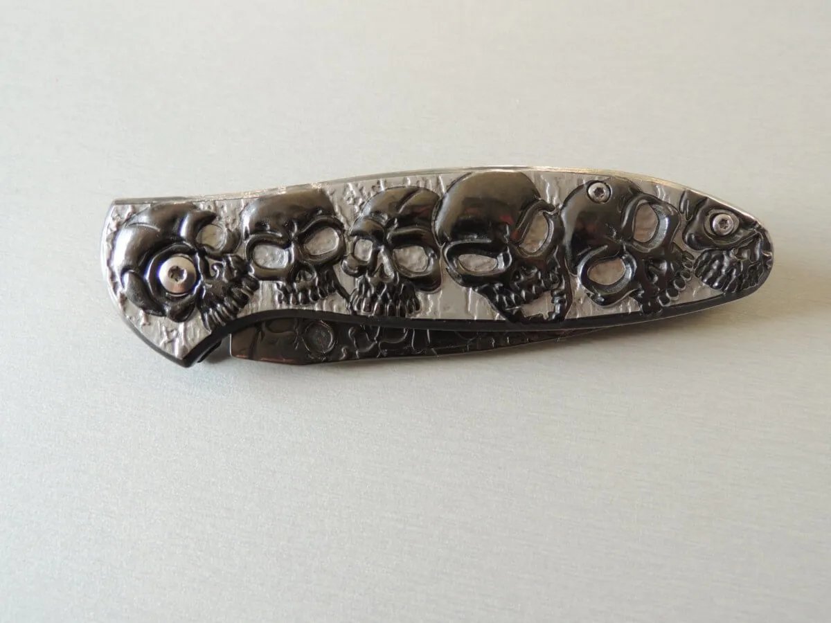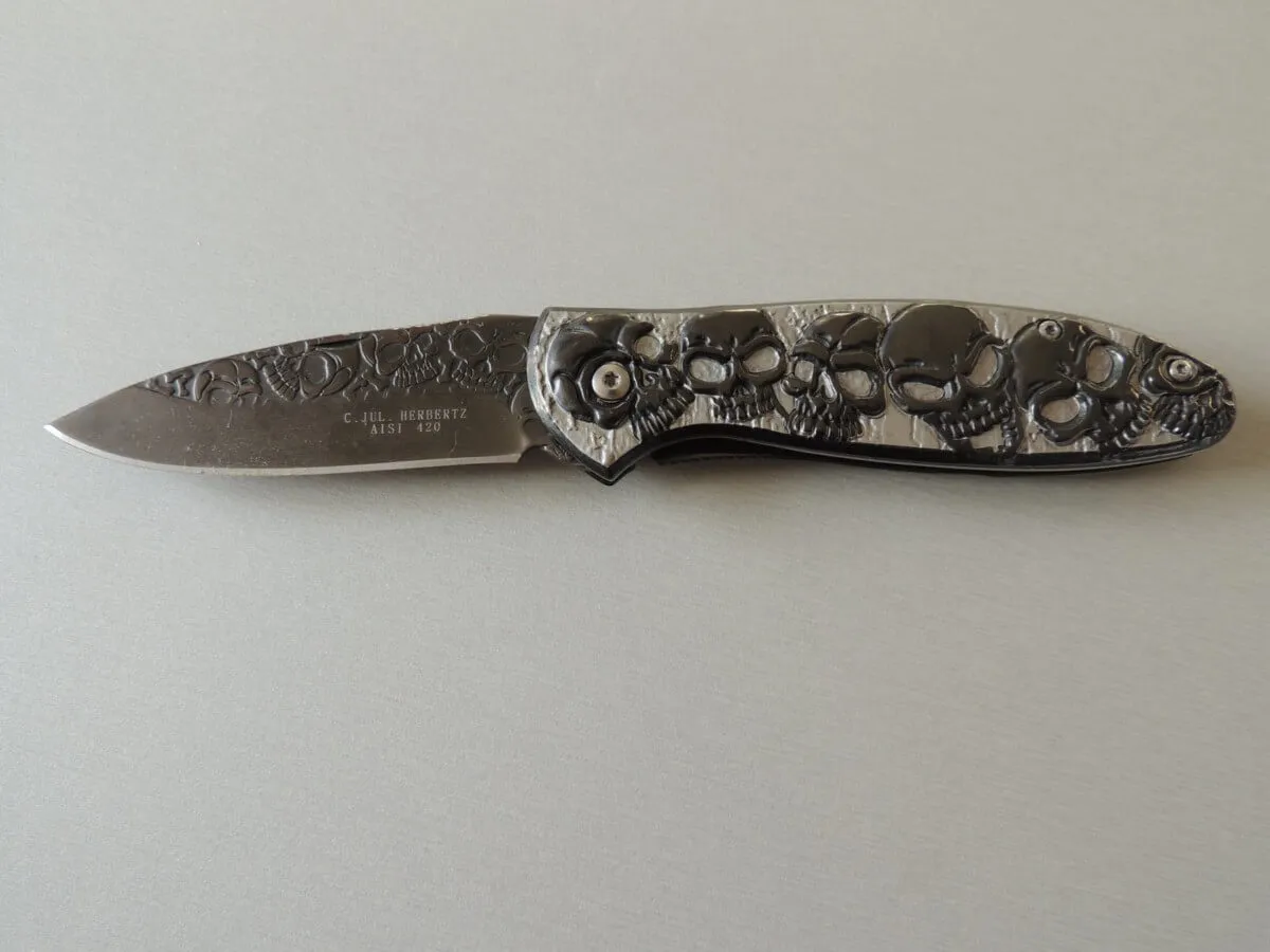 Couteaux de poche Herbertz 564612, manche alu motif tête de mort, lame inoxydable.