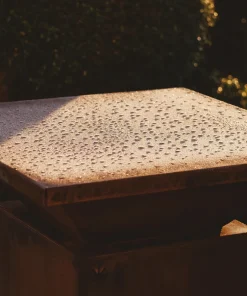 Le couvercle de protection en acier corten de ce brasero protège efficacement la plaque de cuisson contre les intempéries, assurant ainsi sa longévité et votre tranquillité d’esprit.