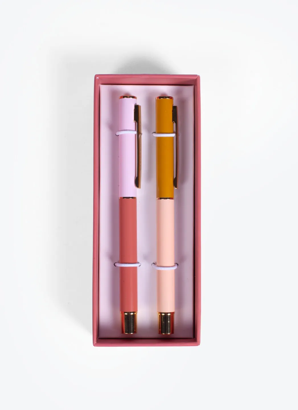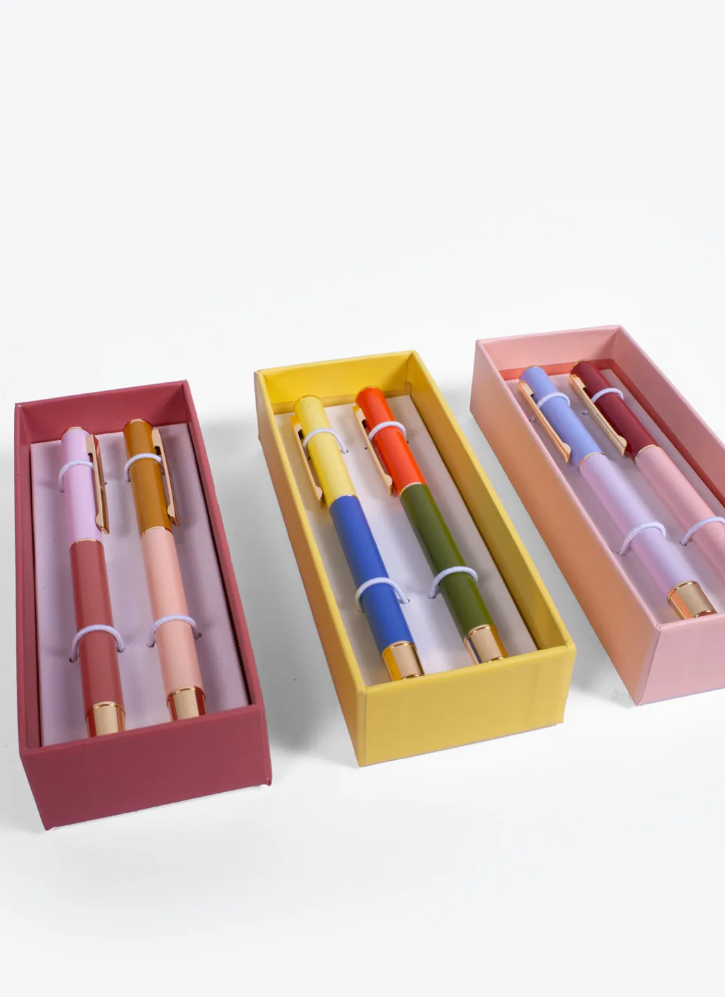 L’angoisse de la page blanche, ça craint. Vous savez ce qui ne l’est pas ? Le blocage de la couleur. Plus précisément : Stylos Color Block. Egayez votre quotidien avec nos ustensiles d’écriture aux couleurs vives. Chaque set comprend deux stylos, chacun rempli d’une riche encre noire et décoré de couleurs vives et contrastées avec une finition mate.