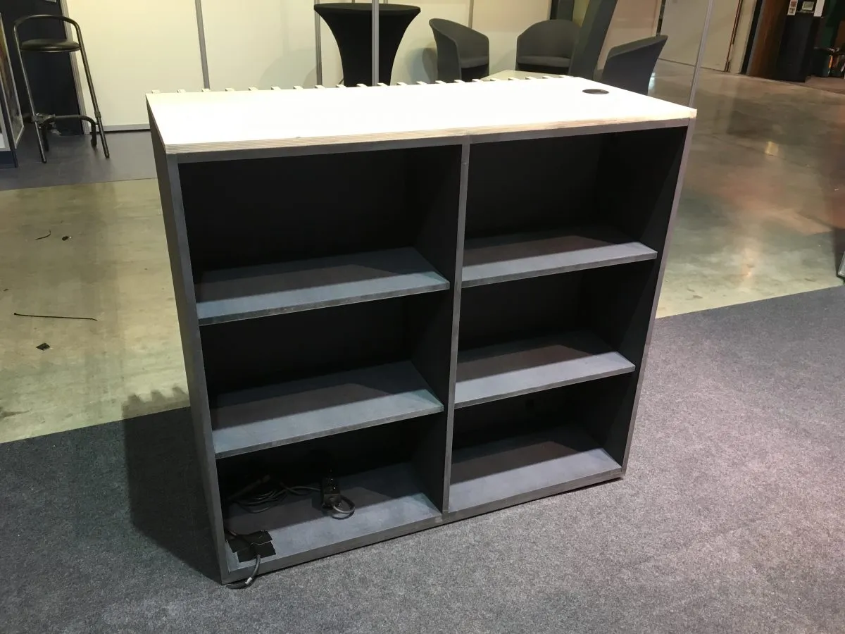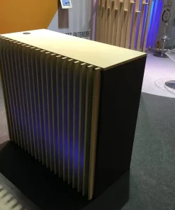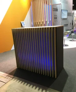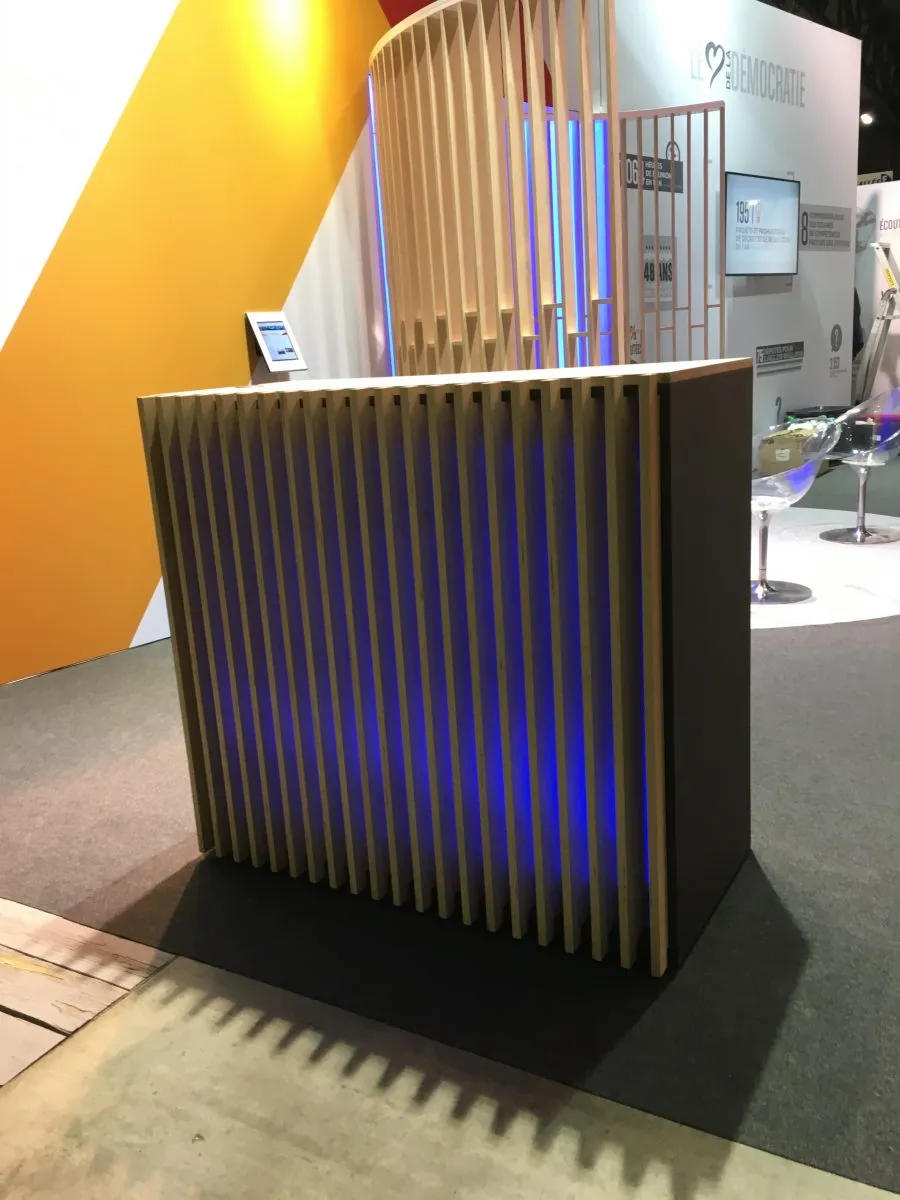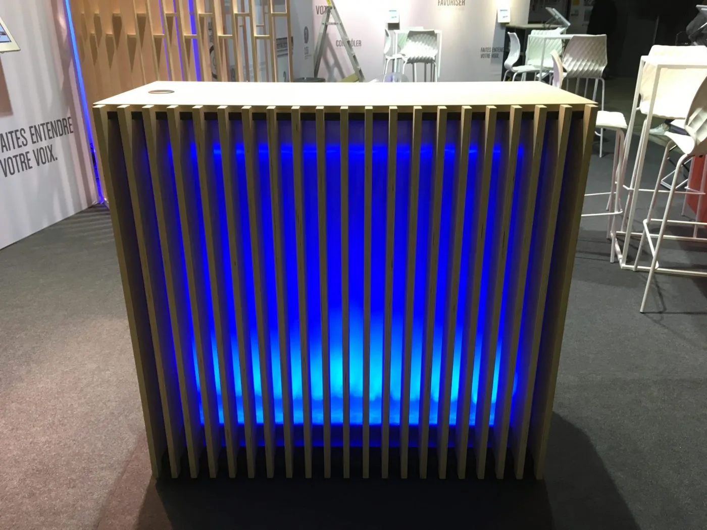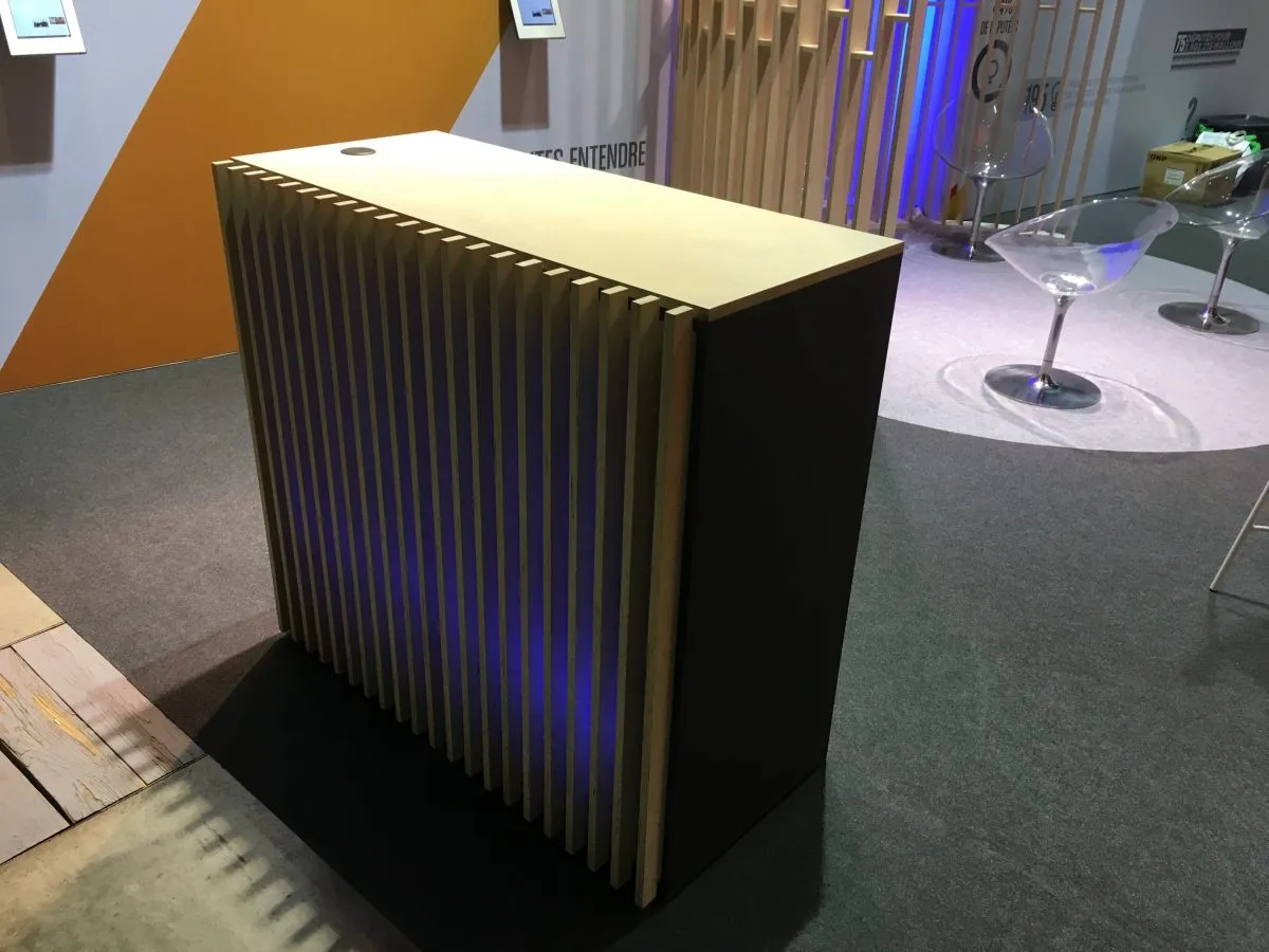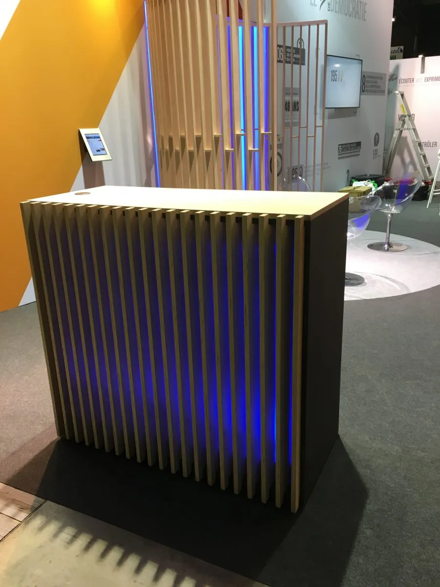 Desk en bois lumineux qui apportera une touche d’originalité et de chic à votre événement. Equipé d’un système de leds autonomes, ce meuble avec effet bardage bois ajouré diffuse un éclairage bleu.