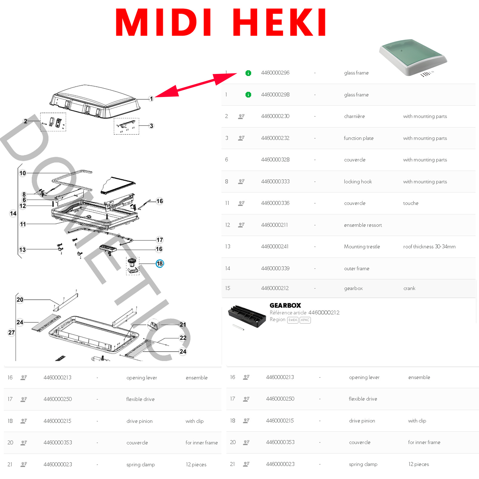 Pour vérifier si votre lanterneau Midi-heki comporte bien ce dome, merci de nous contacter tel 01.84.20.86.07 et munissez vous pour vérifier la compatibilité de votre numéro de produit de votre appareil Dometic (qui se trouve sur l’étiquette signalétique).
