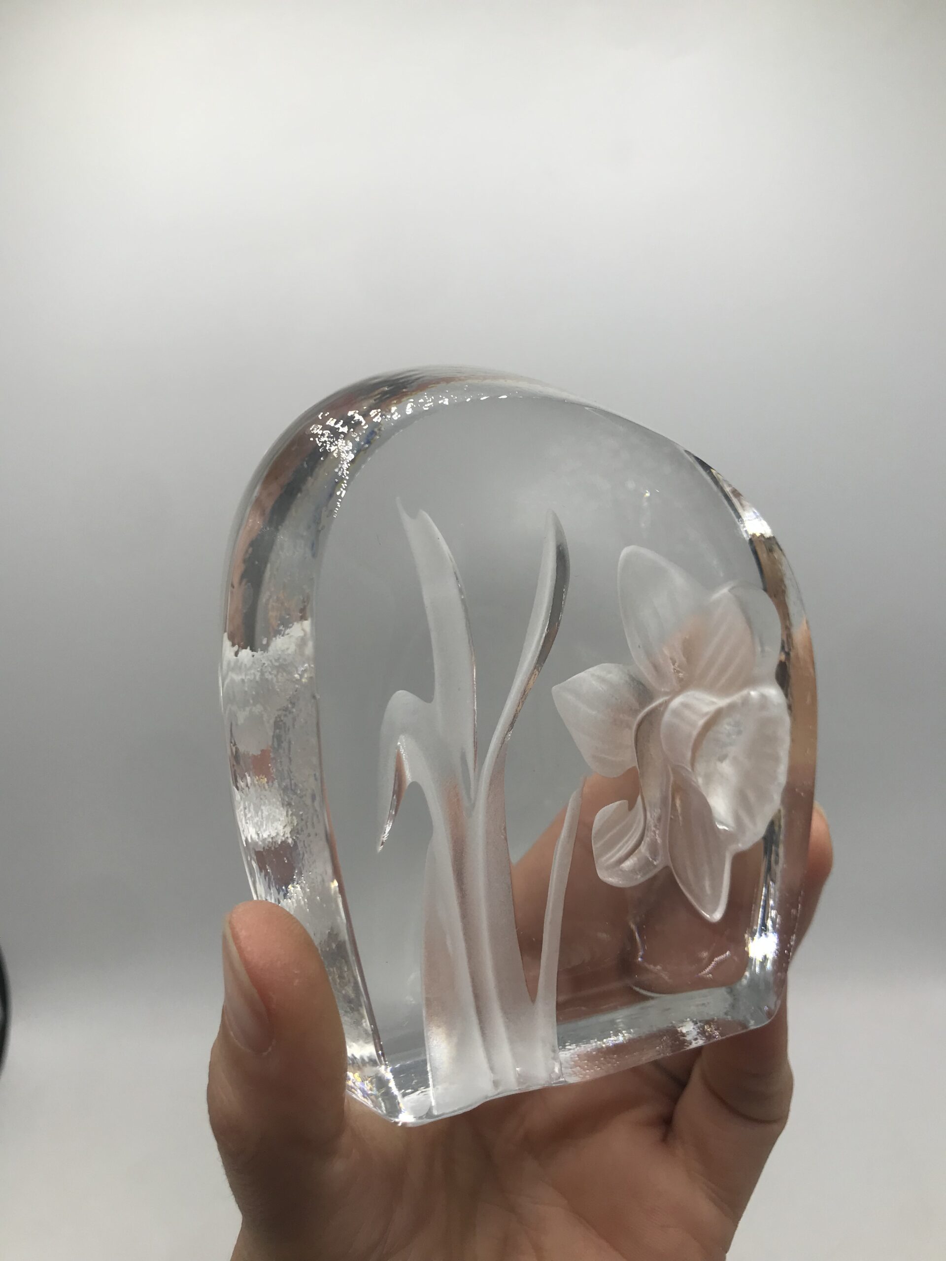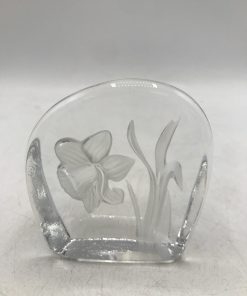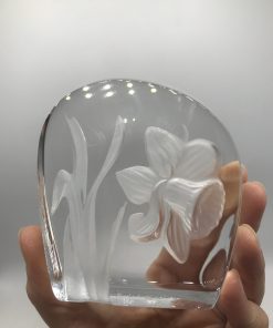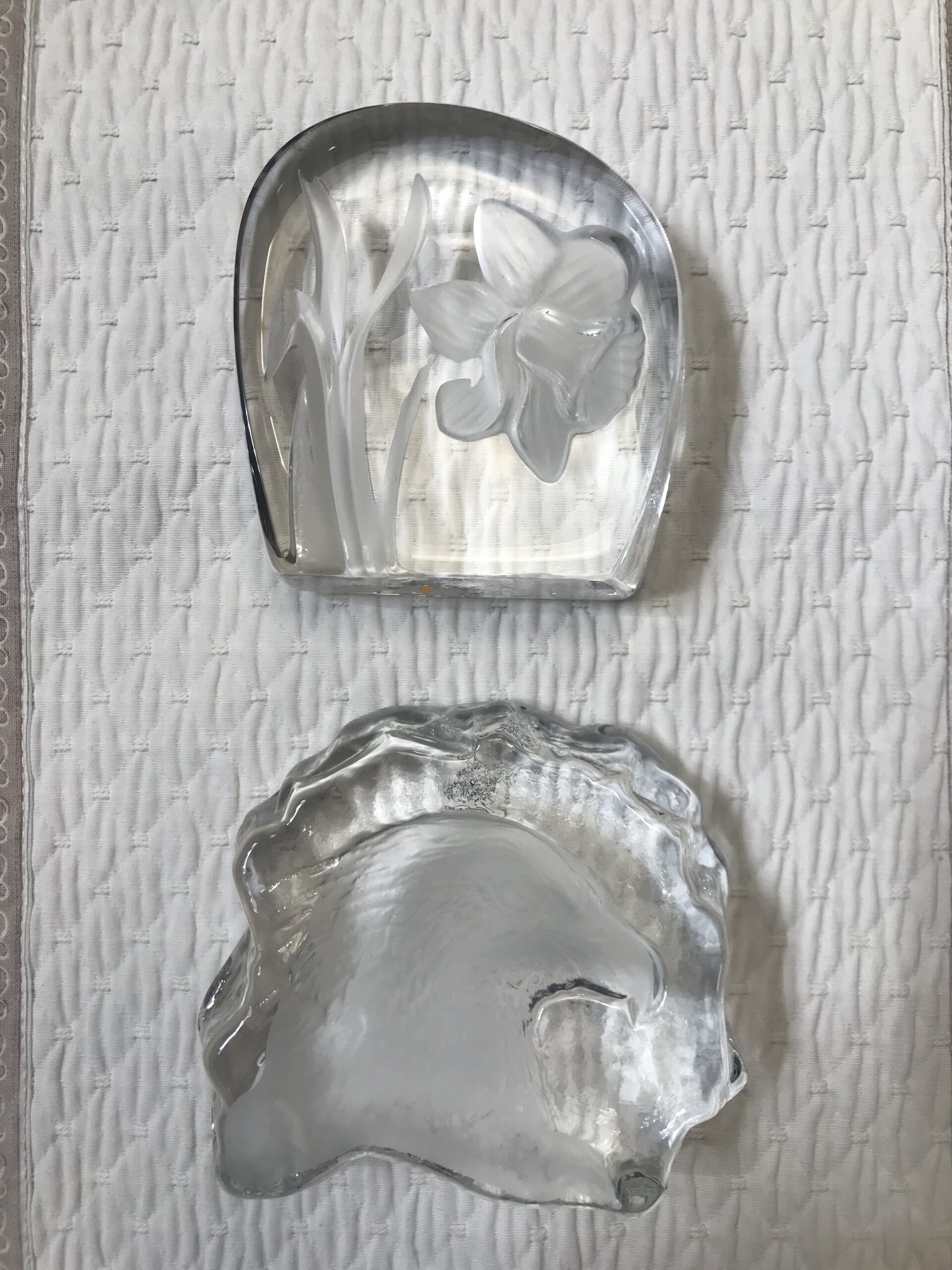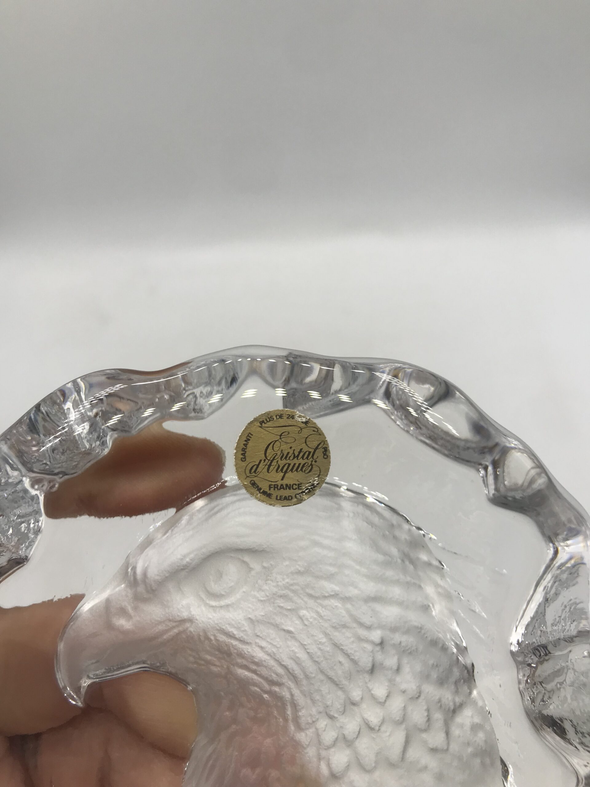 Duo de Cristal d’Arques. Amateurs de bibelots et décorations en Cristal vous allez craquer. Voici donc un duo explosif, il est composé d’un premier bloc ou à été sculpté une fleur, avec un aspect lisse celui ci inspire à la poésie et à la tranquillité. Le deuxième bloc lui et plus représenté par un fort caractère, représentant une tête d’aigle il a des aspérités plus irrégulières. Un duo qui marche à merveille ensemble d’un coté le doux et de l’autre la force. Des œuvres signées Cristal d’Arques. Elles sont en très bon état, prêtent à trôner sur vos meubles. Pour apporter une touche de pureté dans votre intérieur. Des pièces iconiques qui trouveront vite leur place. Fans de cristal vous allez être sous leur charme.