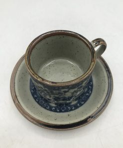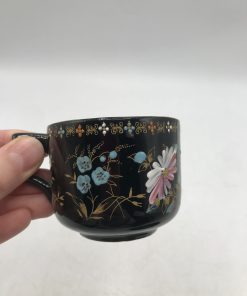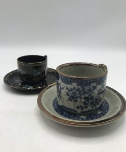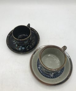 Coup de cœur pour ce duo de tasses vintage. Ce duo se compose d’une tasse et sa sous tasse sur fond noir, avec de magnifiques décors floraux. De marque Trilby made in England, elle à un diamètre de 7 cm pour une hauteur de 5,5 cm. Et la deuxième tasse et sa sous tasse également, présente des décors floraux de style japonais, elle a un diamètre de 8 cm pour une hauteur de 6 cm. Un ensemble atypique mais plein de charme. En bon état seules quelques marques d’usure légères.