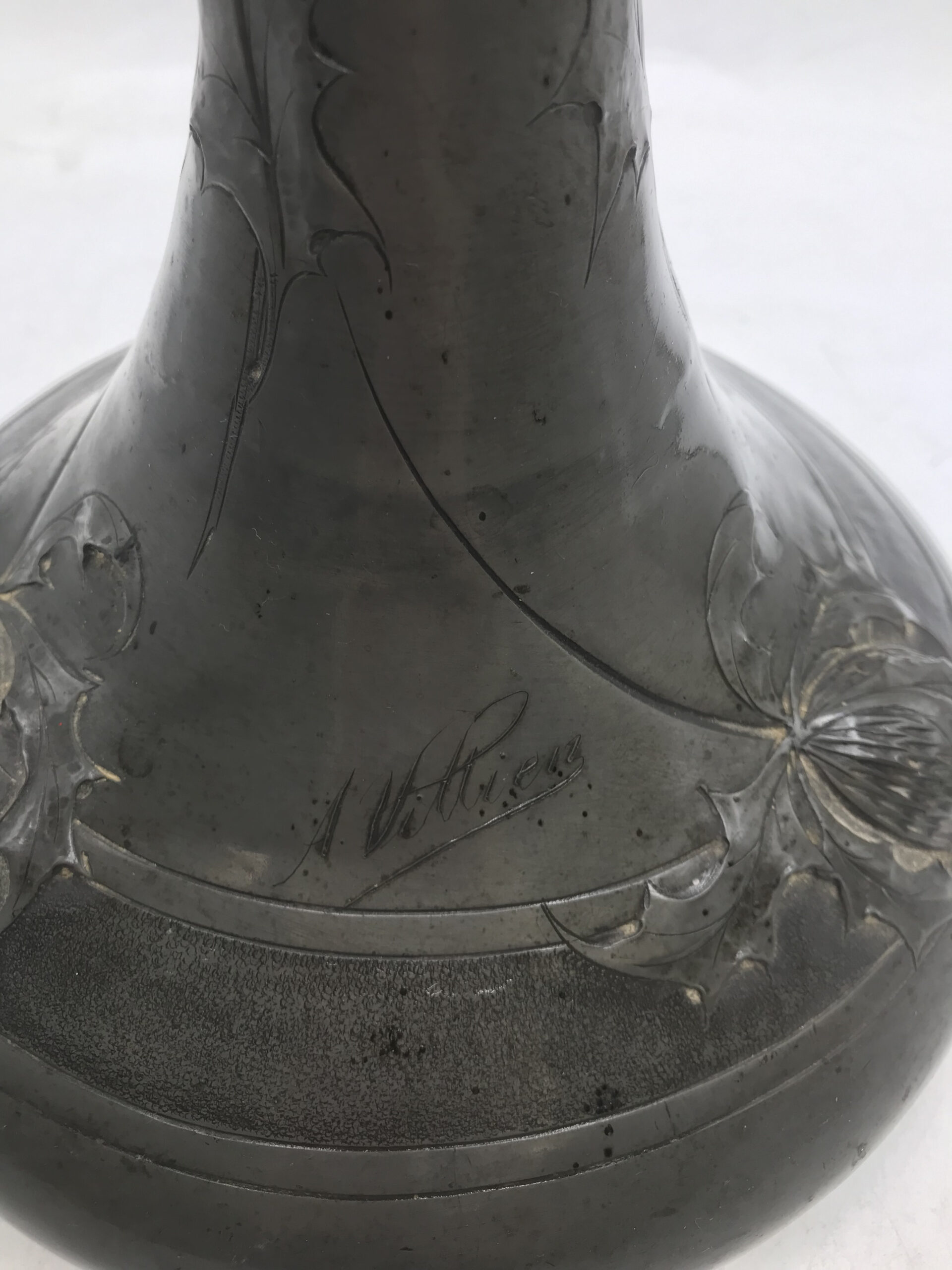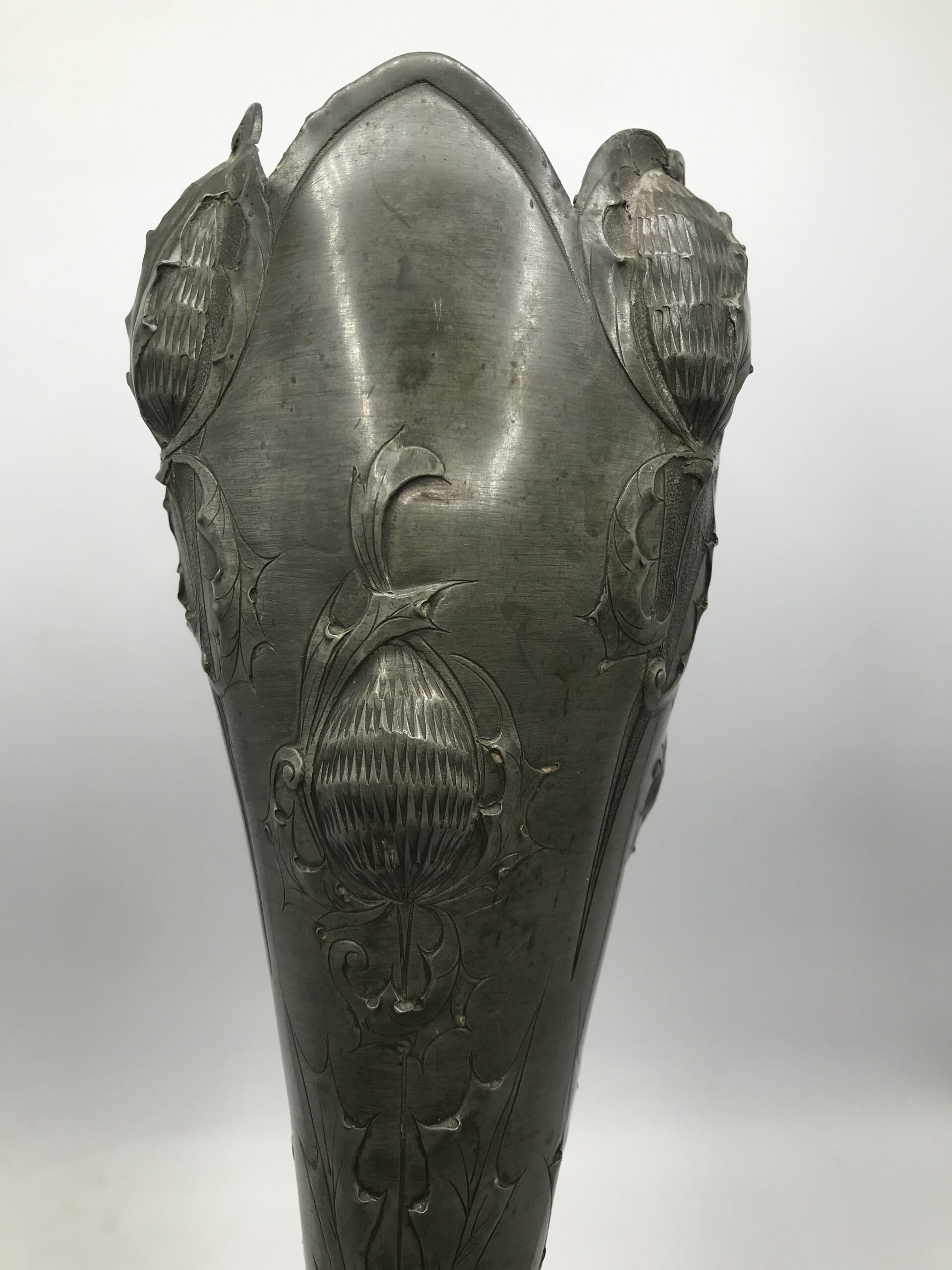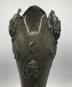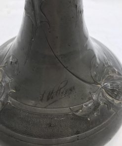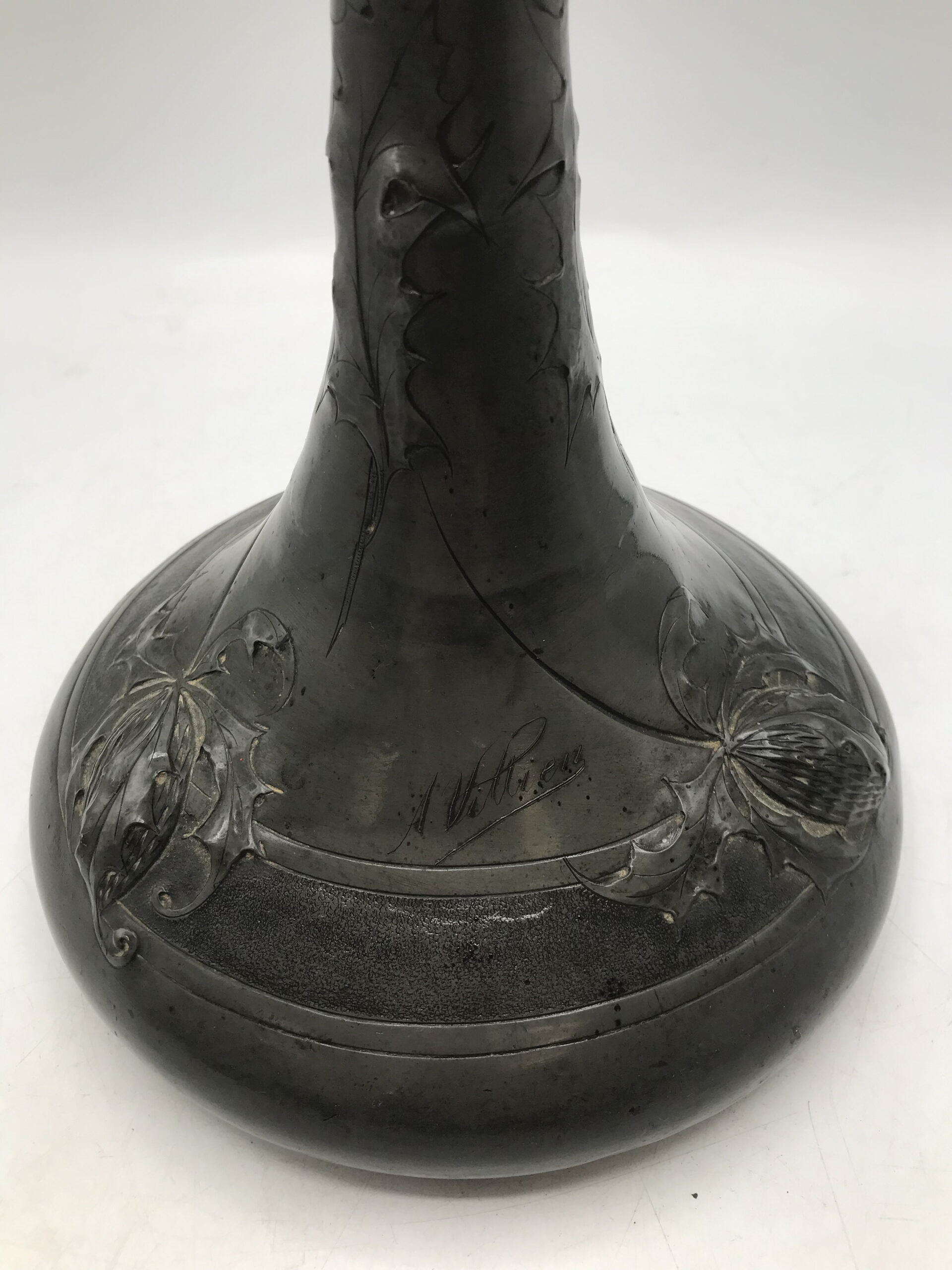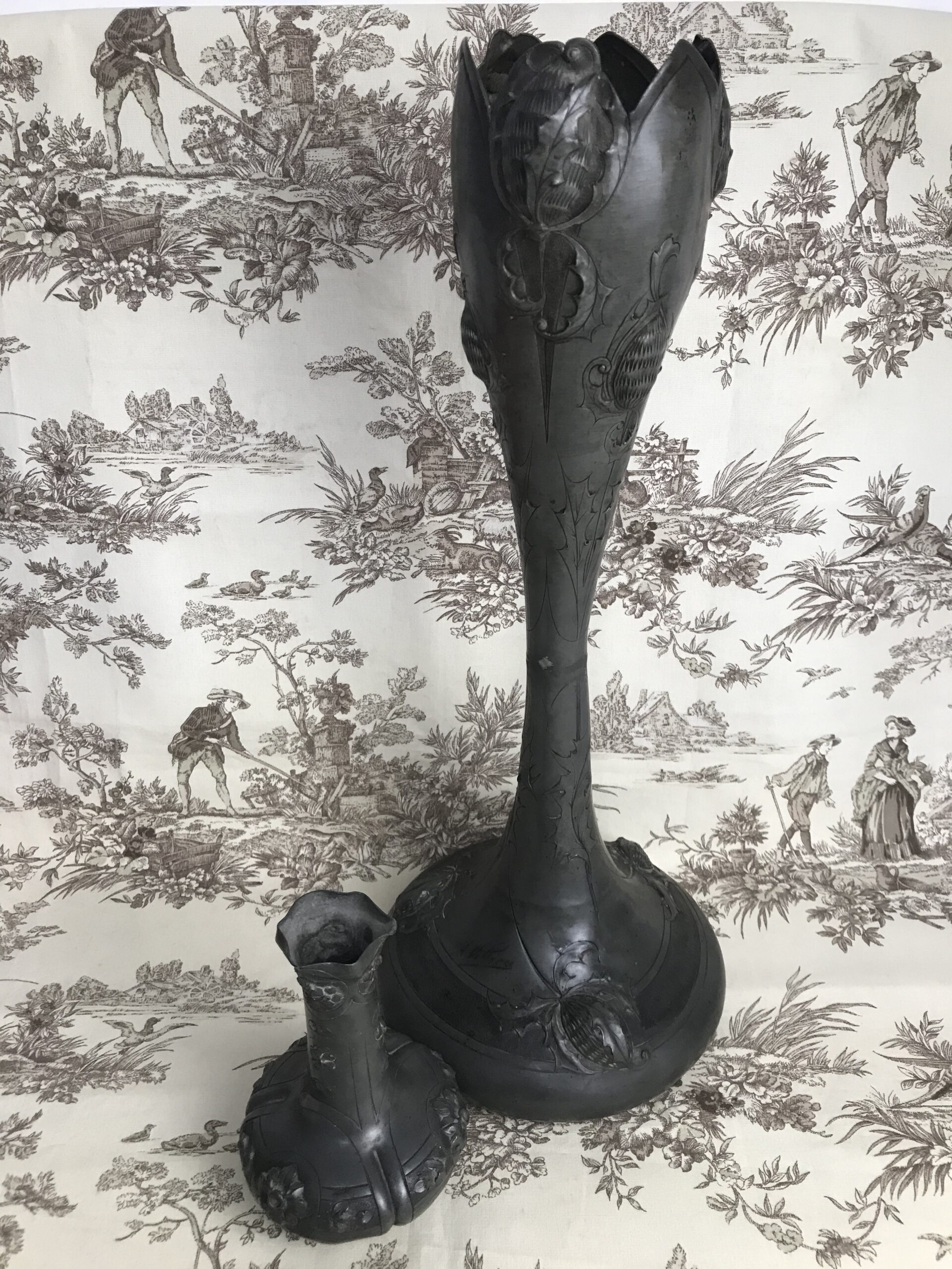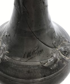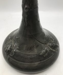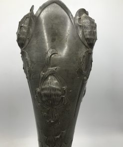 Alerte grosse pépite !!! Duo de vase étain Art nouveau . Voici un duo qui ne manque pas de nous impressionner. Il est composé d’un grand vase d’une hauteur de 50 cm signé André Villien. Ce modèle est parsemé de fleurs de chardons. Il présente de marques d’usure, surtout sur le milieu de vase ou l’étain à été comme ressoudé (cf photos). La signature de l’artiste est sur le coté du pied. Le deuxième plus petit a une hauteur de 17 cm, il est signé P. Chaumette, il présente une usure sur un coté (cf photos). De belles fleurs viennent se poser un peu partout pour lui donner une touche de finesse. Deux pièces signées des années 1900, une belle affaire pour les connaisseurs et les amateurs de ce type de vases. A noter qu’ils sont dans leur jus, un nettoyage sera nécessaire. Chineurs, chineuses à vous de jouer.