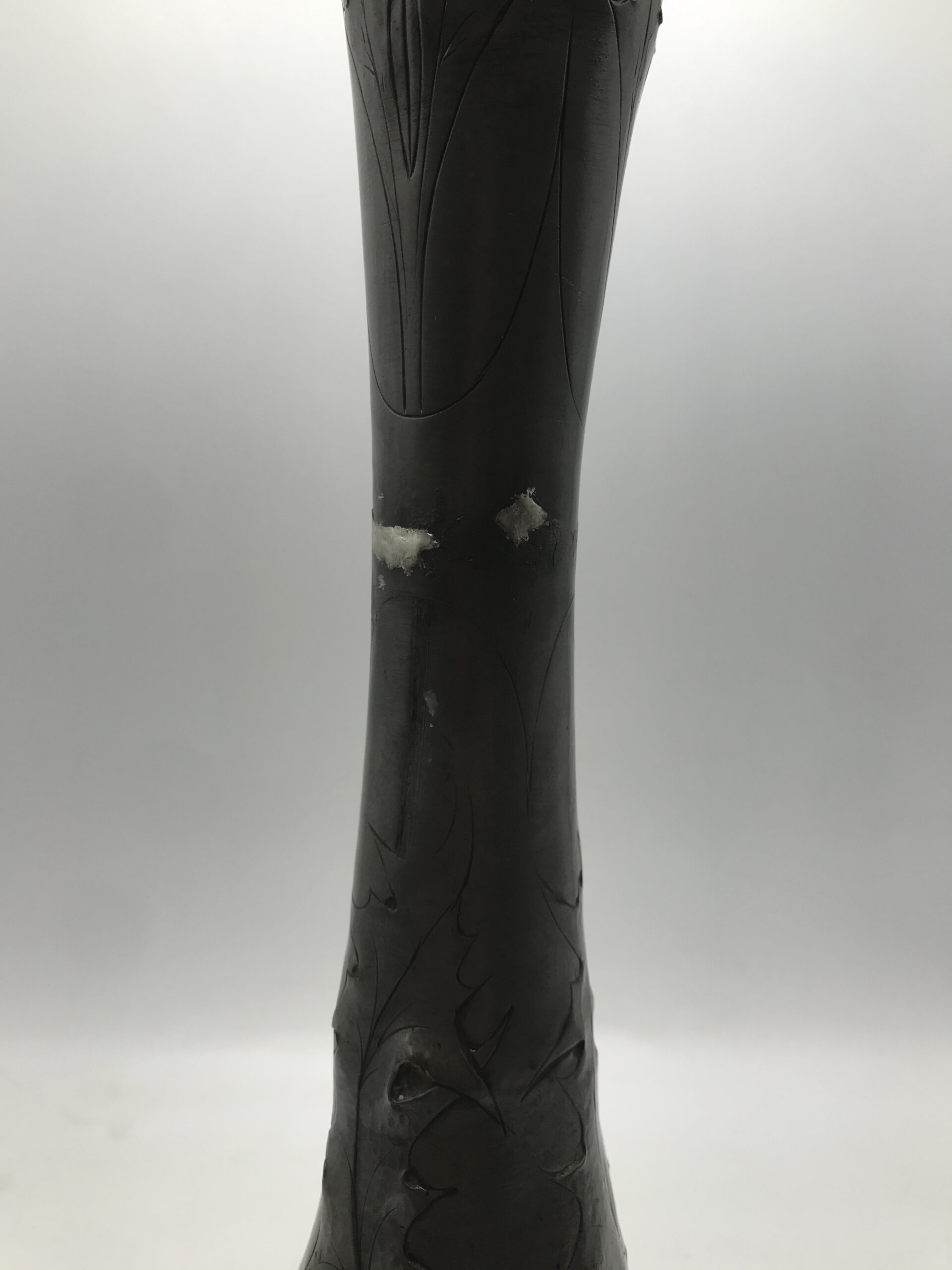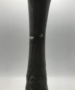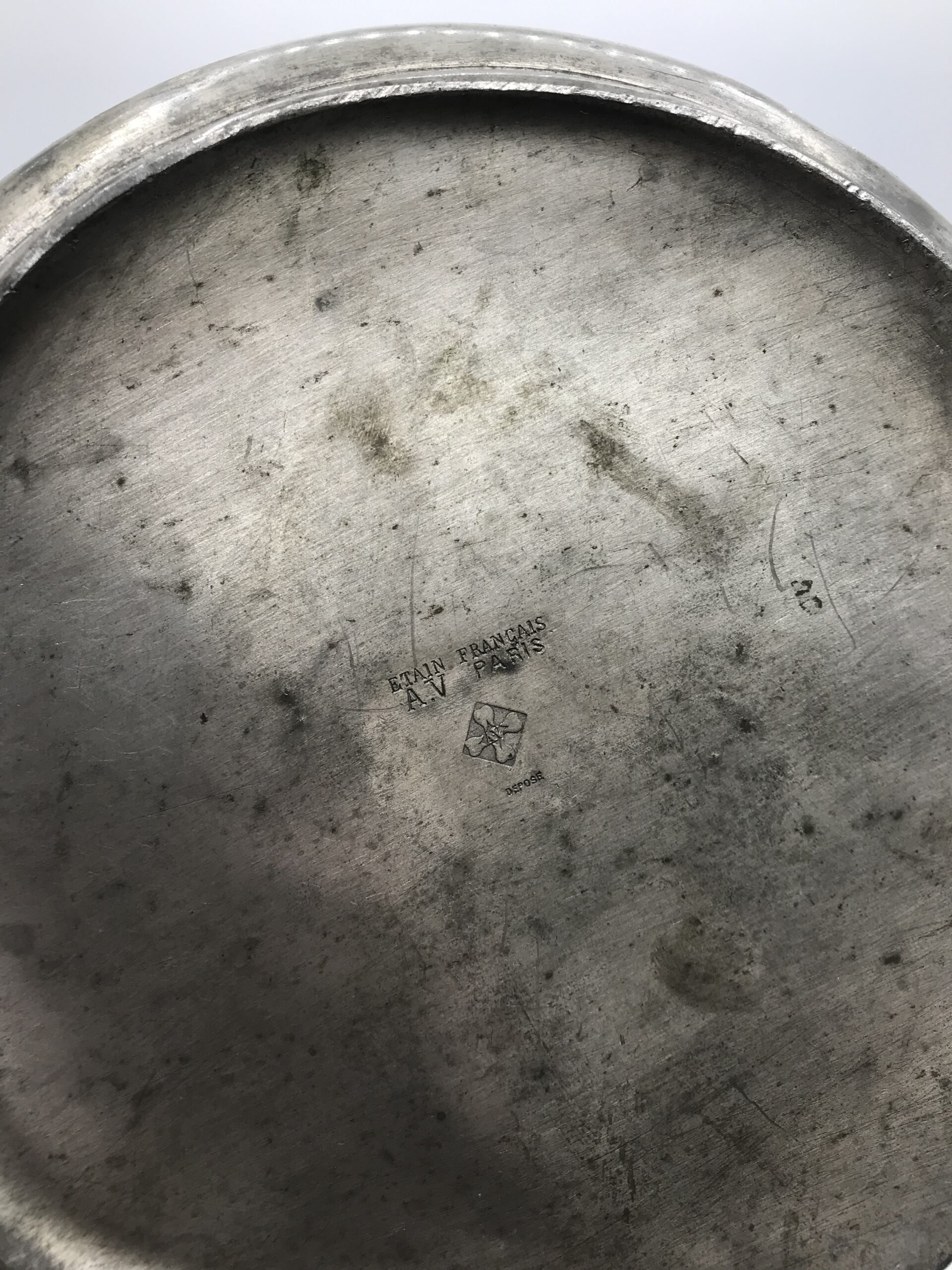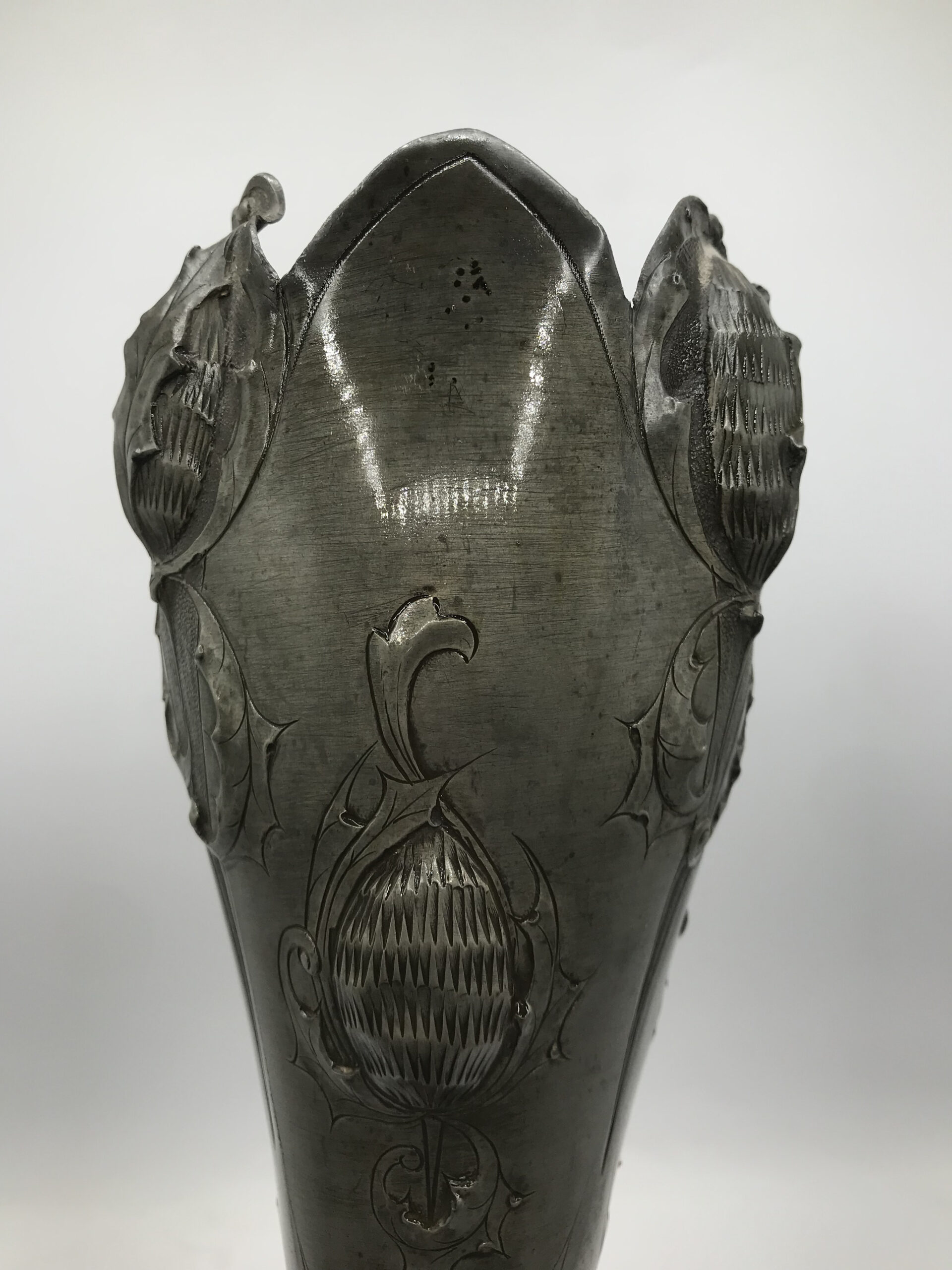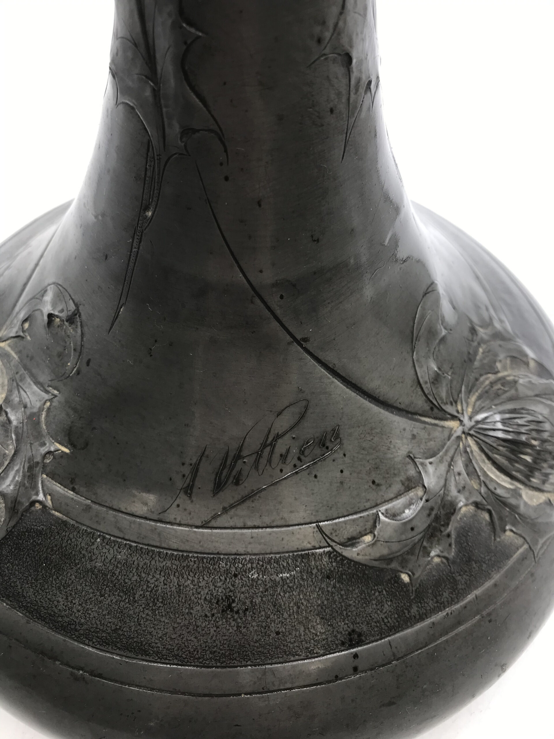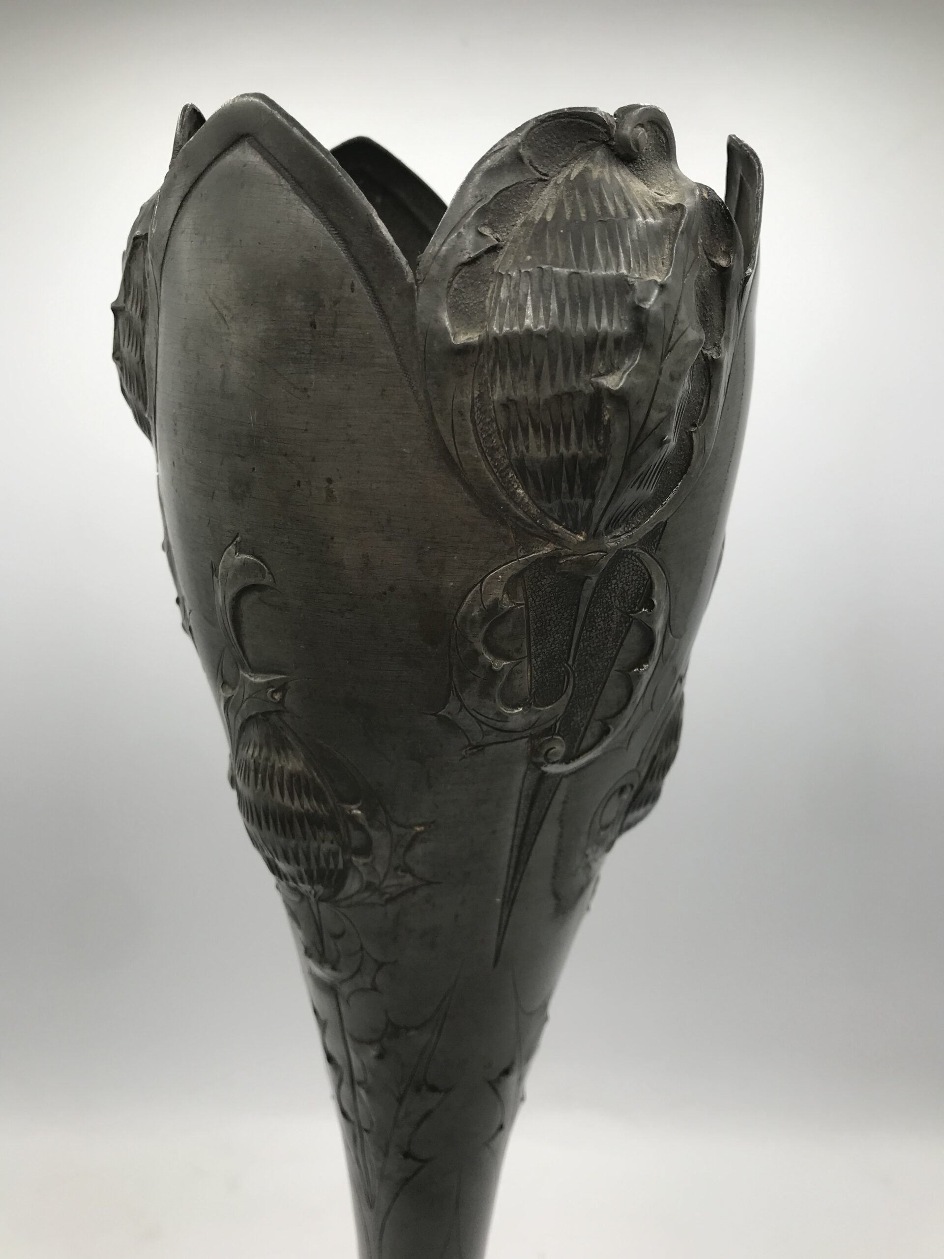 Alerte grosse pépite !!! Duo de vase étain Art nouveau . Voici un duo qui ne manque pas de nous impressionner. Il est composé d’un grand vase d’une hauteur de 50 cm signé André Villien. Ce modèle est parsemé de fleurs de chardons. Il présente de marques d’usure, surtout sur le milieu de vase ou l’étain à été comme ressoudé (cf photos). La signature de l’artiste est sur le coté du pied. Le deuxième plus petit a une hauteur de 17 cm, il est signé P. Chaumette, il présente une usure sur un coté (cf photos). De belles fleurs viennent se poser un peu partout pour lui donner une touche de finesse. Deux pièces signées des années 1900, une belle affaire pour les connaisseurs et les amateurs de ce type de vases. A noter qu’ils sont dans leur jus, un nettoyage sera nécessaire. Chineurs, chineuses à vous de jouer.