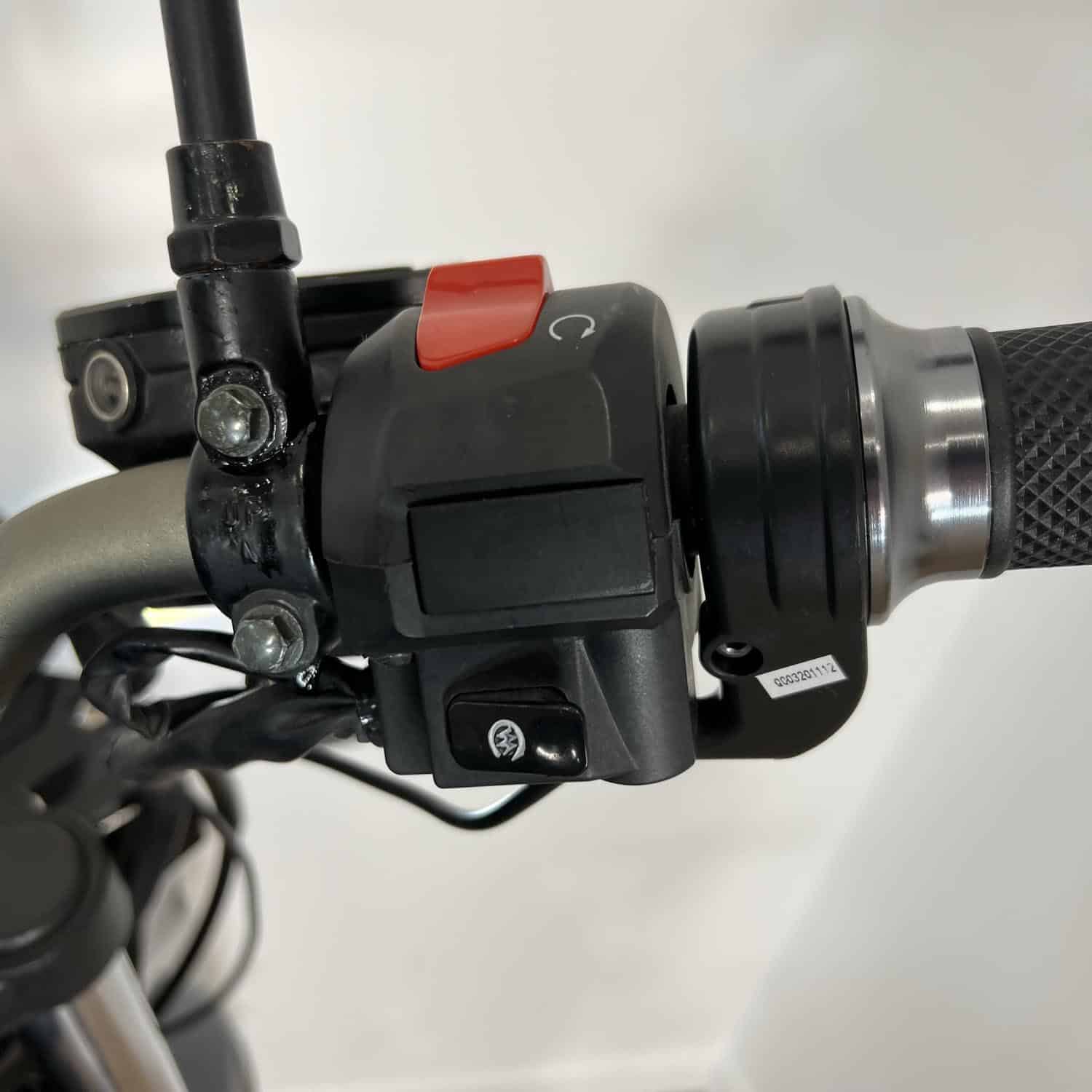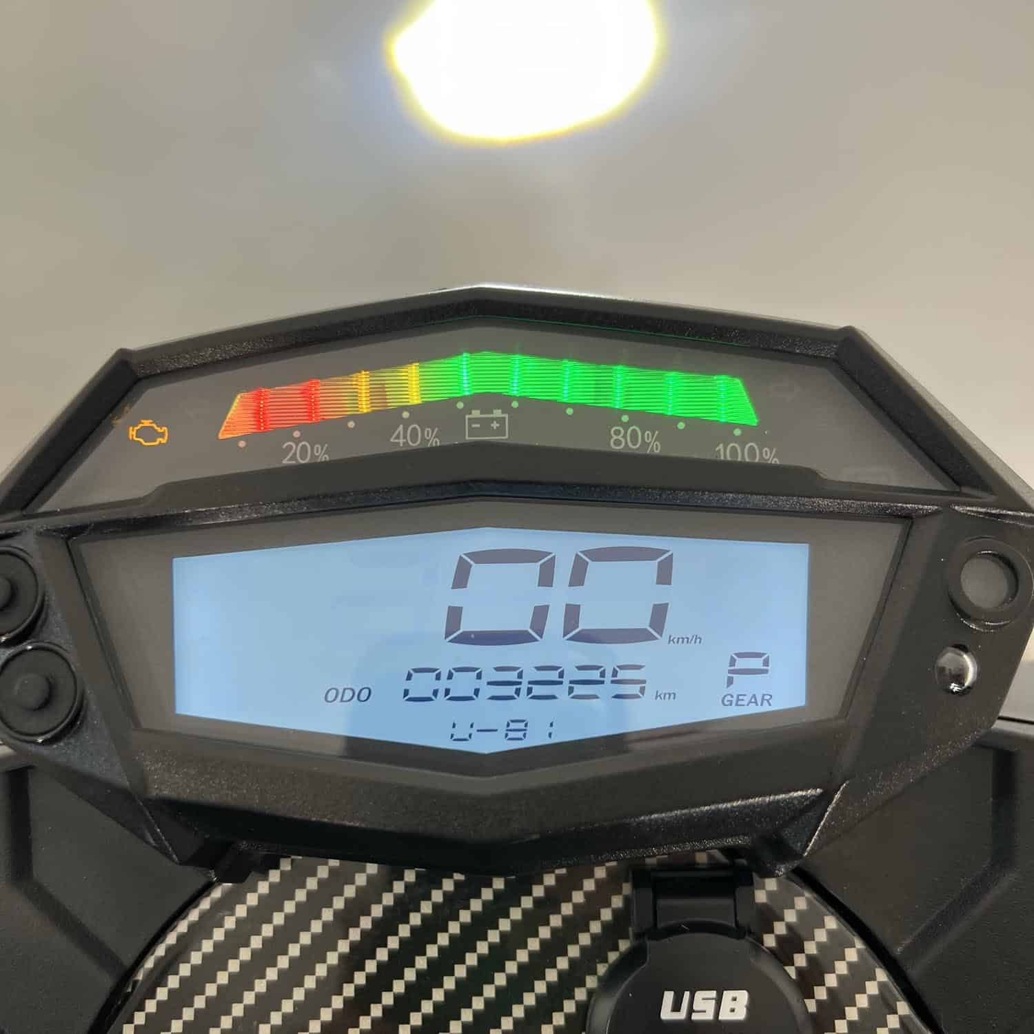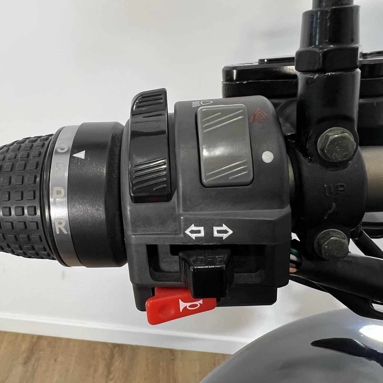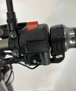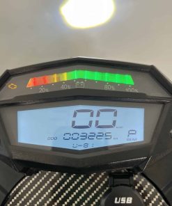 La fourche hydraulique est d’un diamètre de 35 mm débattant sur un confortable 125 mm. On aurait aimé voir une fourche d’un diamètre un peu plus gros. À l’arrière, la Ebroh Bravo GLE Pro est équipée d’un monoamortisseur qui débat sur 100 mm. Les jantes mesurent 17 pouces, et les pneus sont larges et tubeless. Les freins sont à double disque à l’avant et simple disque à l’arrière. C’est assez rare dans le petit monde des 2-roues électriques, félicitons Ebroh pour cette dotation sécurisante. Le freinage est couplé, dit « CBS ». Le tableau de bord de la Ebroh Bravo GLE Pro est équipé d’une horloge numérique centrale avec indicateur de vitesse, odomètre, état de charge de la batterie, clignotants et mode de conduite sélectionné. L’intégralité des feux de cette moto électrique est à LED.
