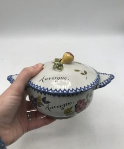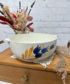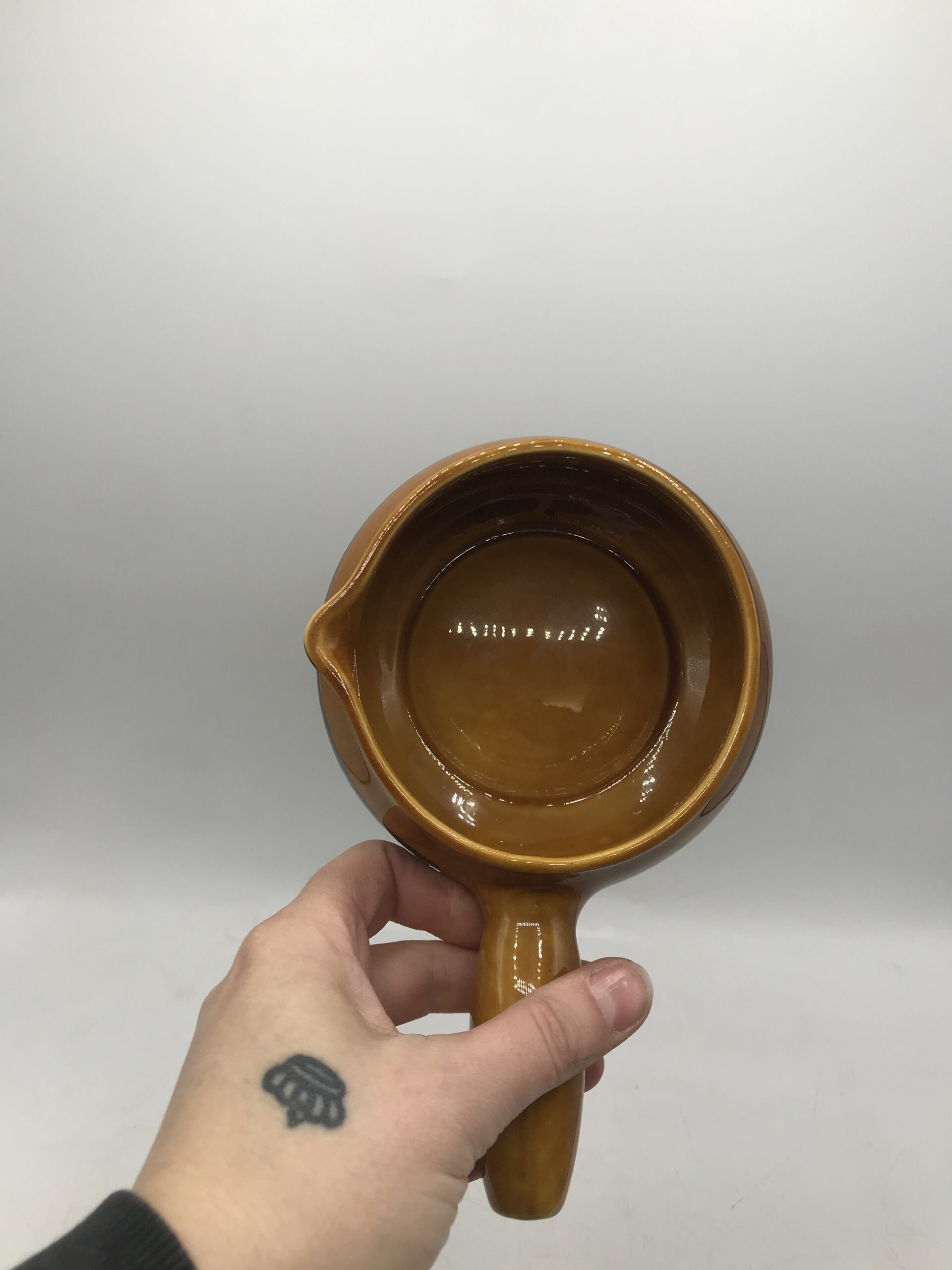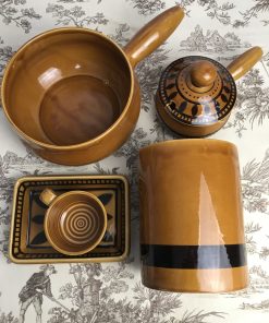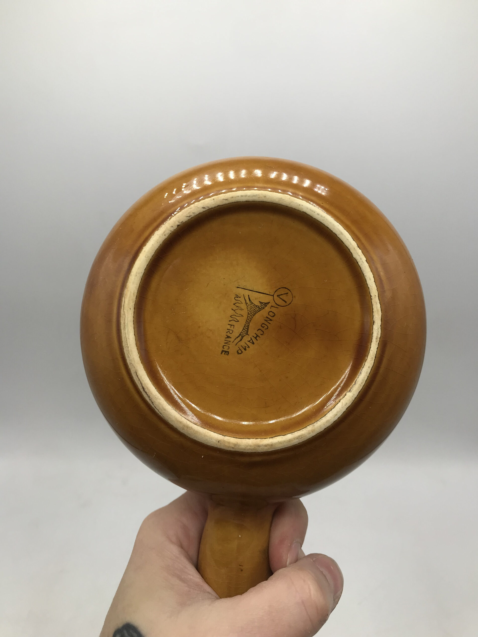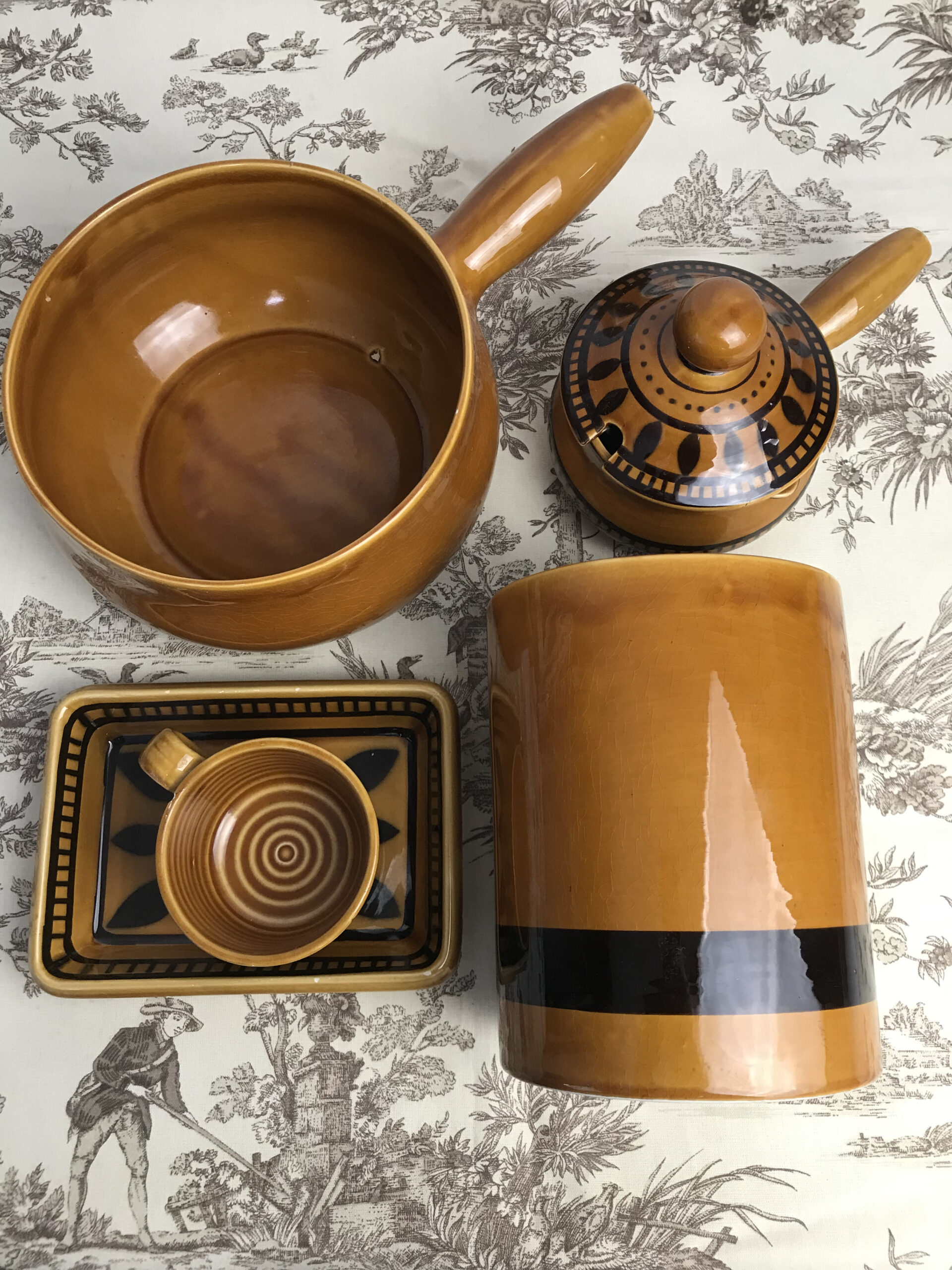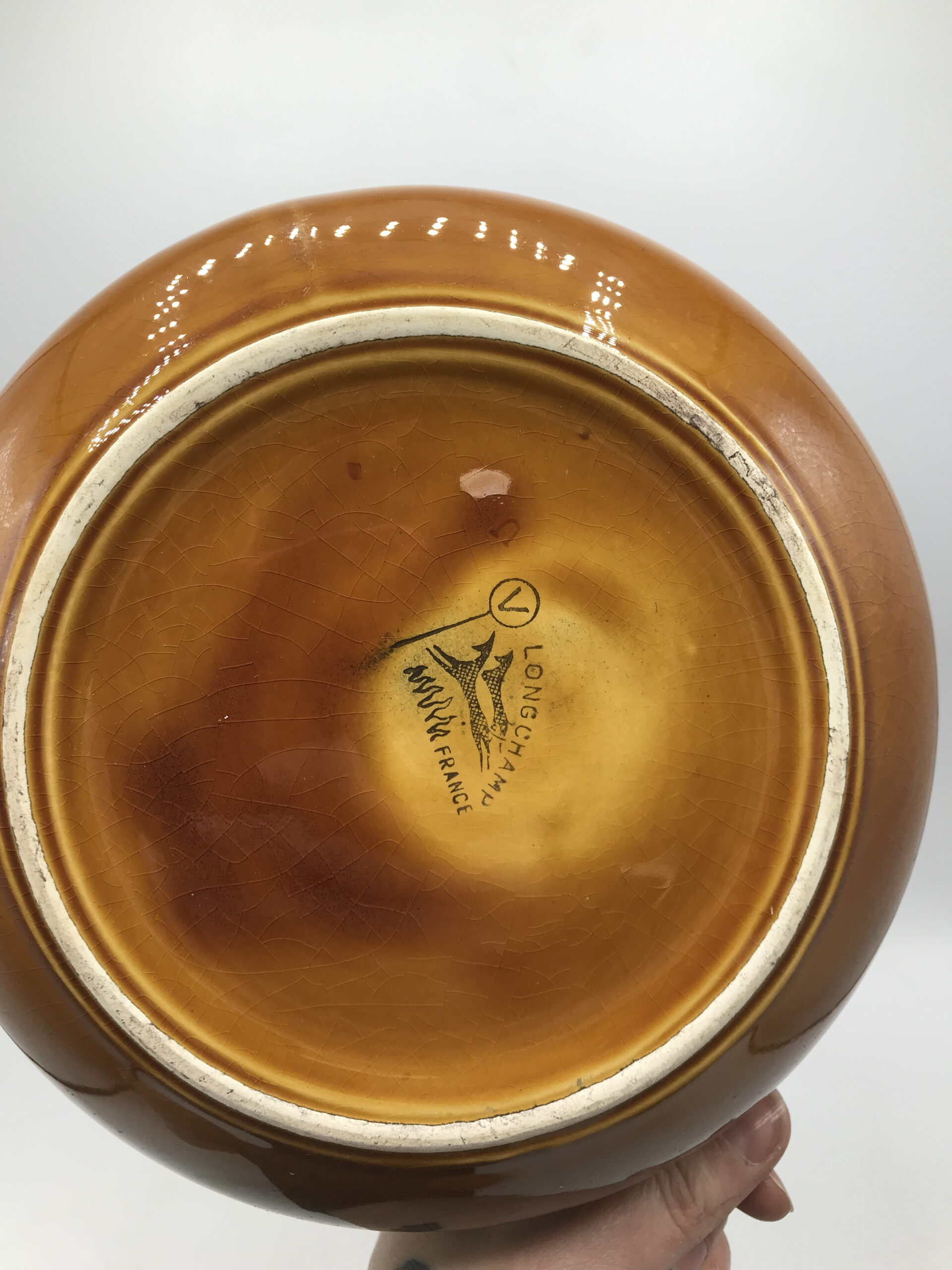 Alerte pépite !!! Ensemble 5 pièces Longchamp. Le lot est composé d’un présentoir à bouteille, d’un grand caquelon et son modèle réduit avec un petit couvercle. Pour les accompagner nous avons également un petit plateau rectangulaire avec une petite tasse. Le tout est en bon état, à noter que la petite tasse présente un petit éclat sur le bord ( cf photos). Les pièces de cette collection sont de couleur marron glacé et chocolat. Signées à l’arrière Longchamp France. Une vaisselle qui donnera le tempo à votre table. Étonnez vos amis avec ces pièces de seconde main qui en charmeront plus d’un. Avis aux amoureux de vaisselle vintage ancienne.