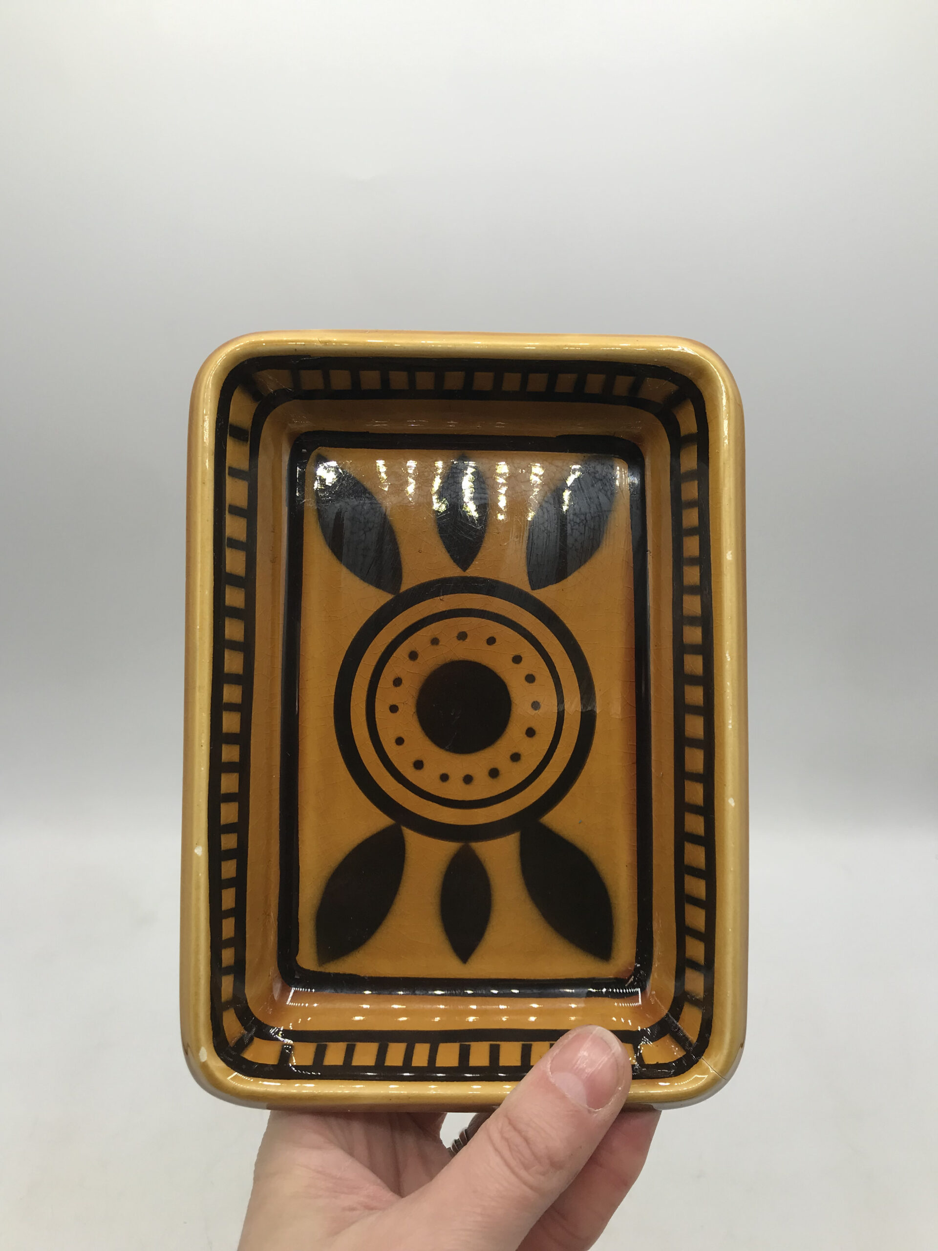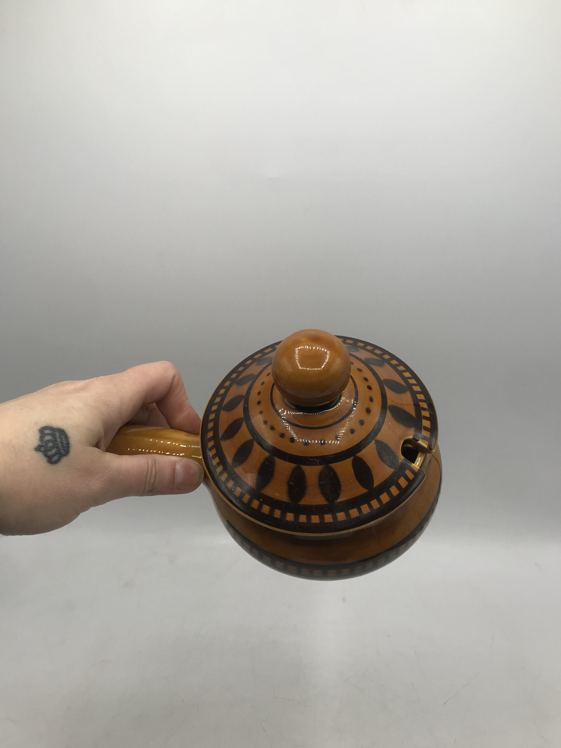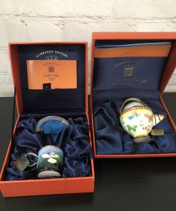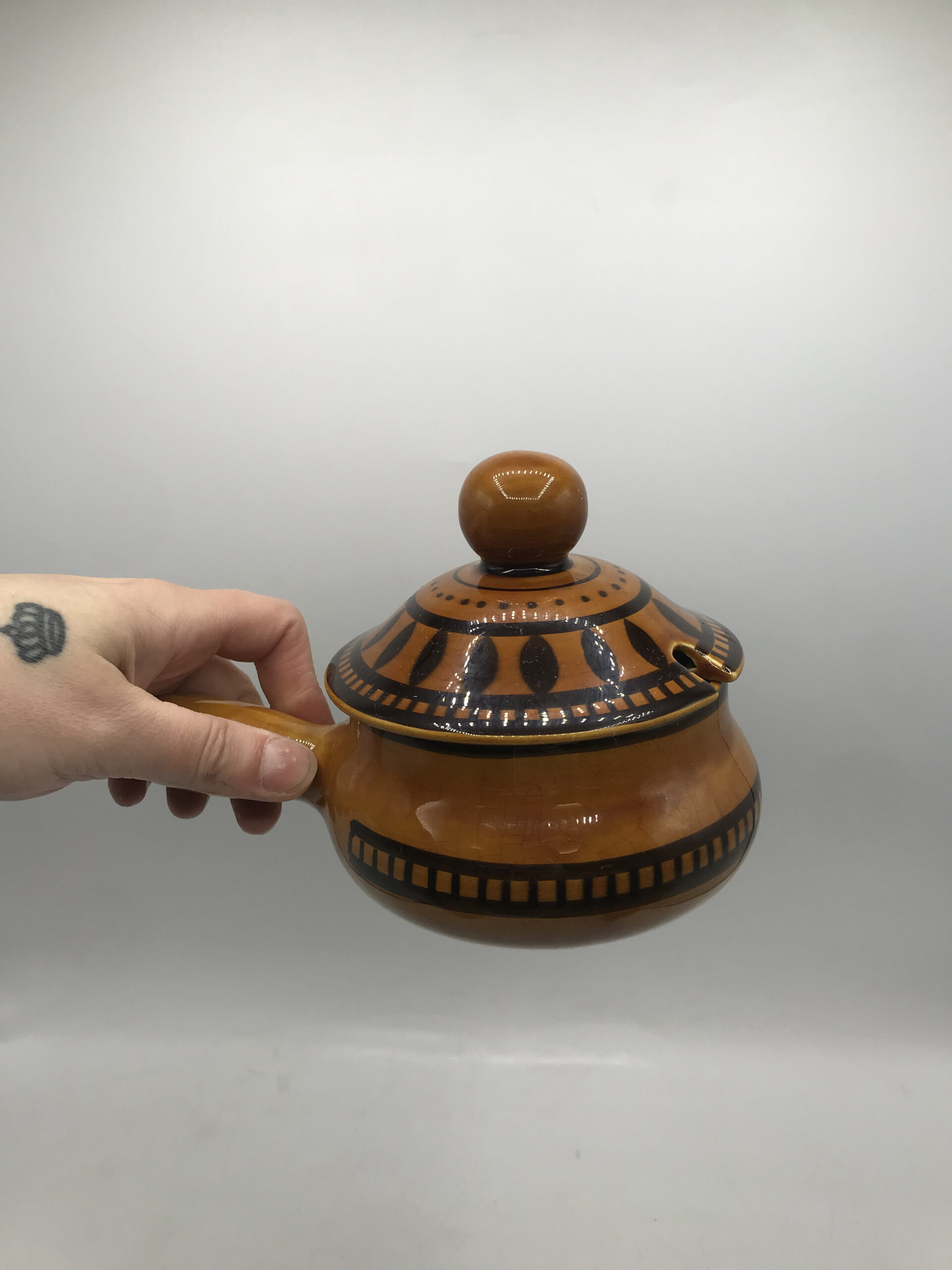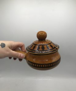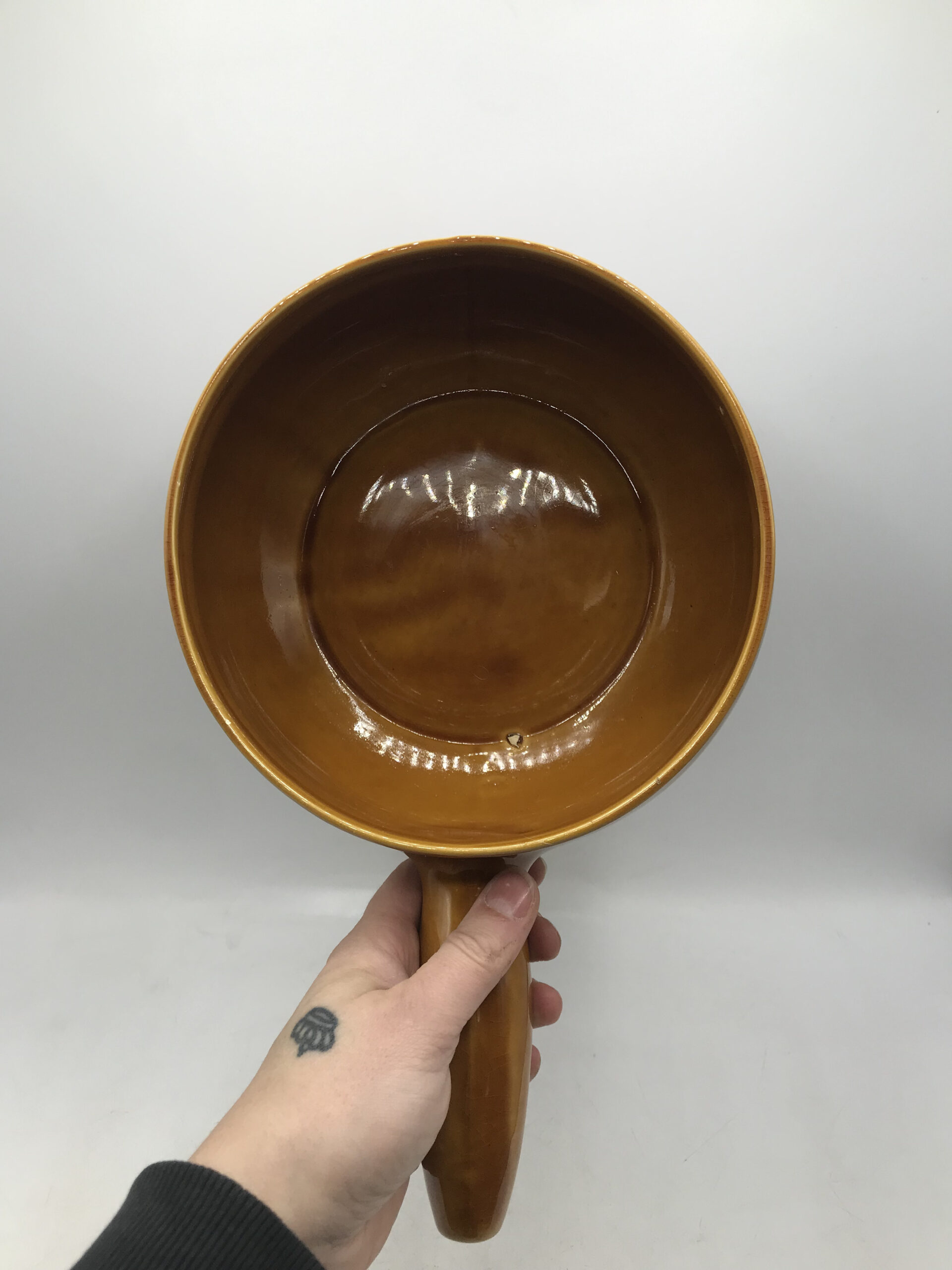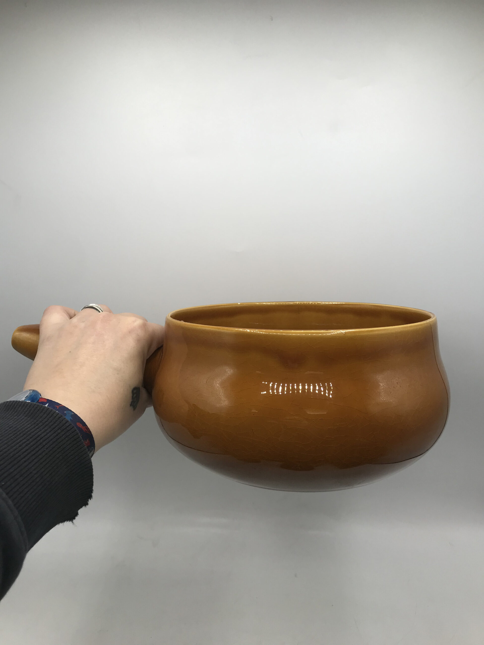 Alerte pépite !!! Ensemble 5 pièces Longchamp. Le lot est composé d’un présentoir à bouteille, d’un grand caquelon et son modèle réduit avec un petit couvercle. Pour les accompagner nous avons également un petit plateau rectangulaire avec une petite tasse. Le tout est en bon état, à noter que la petite tasse présente un petit éclat sur le bord ( cf photos). Les pièces de cette collection sont de couleur marron glacé et chocolat. Signées à l’arrière Longchamp France. Une vaisselle qui donnera le tempo à votre table. Étonnez vos amis avec ces pièces de seconde main qui en charmeront plus d’un. Avis aux amoureux de vaisselle vintage ancienne.