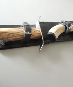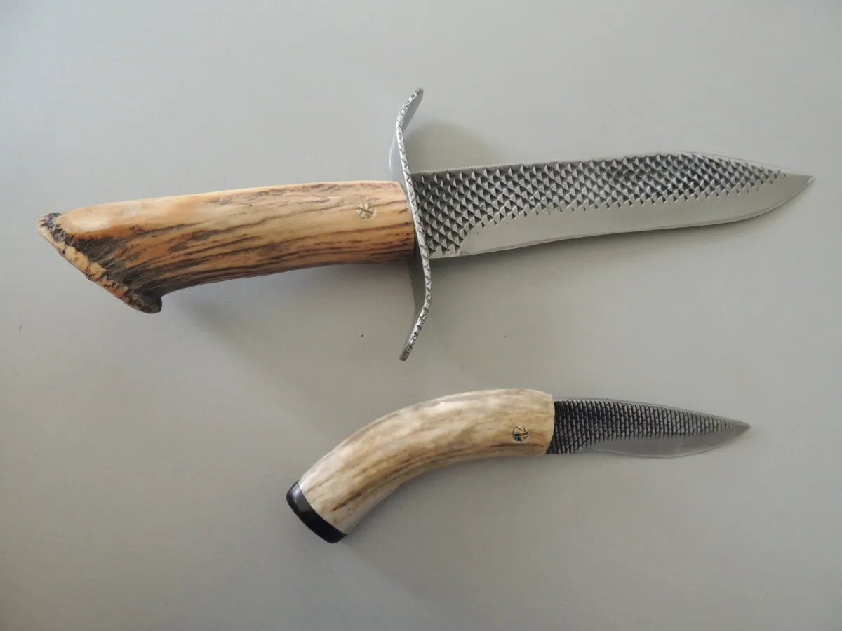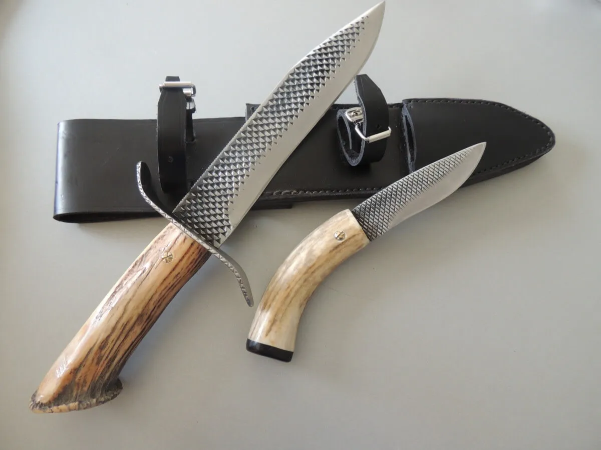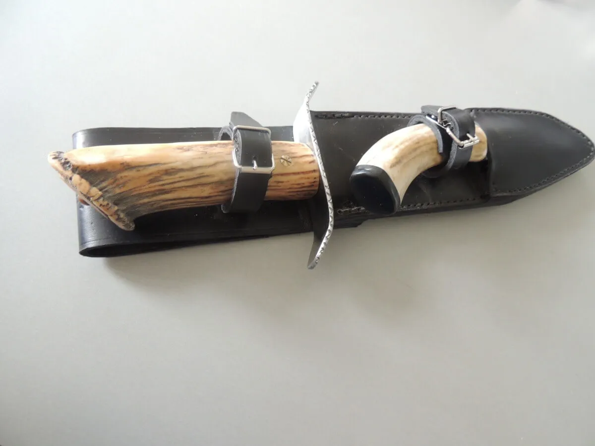 Couteau par Marcel Lambotte, lame carbone, ensemble en bois de cerf comprenant une dague et un poignard.