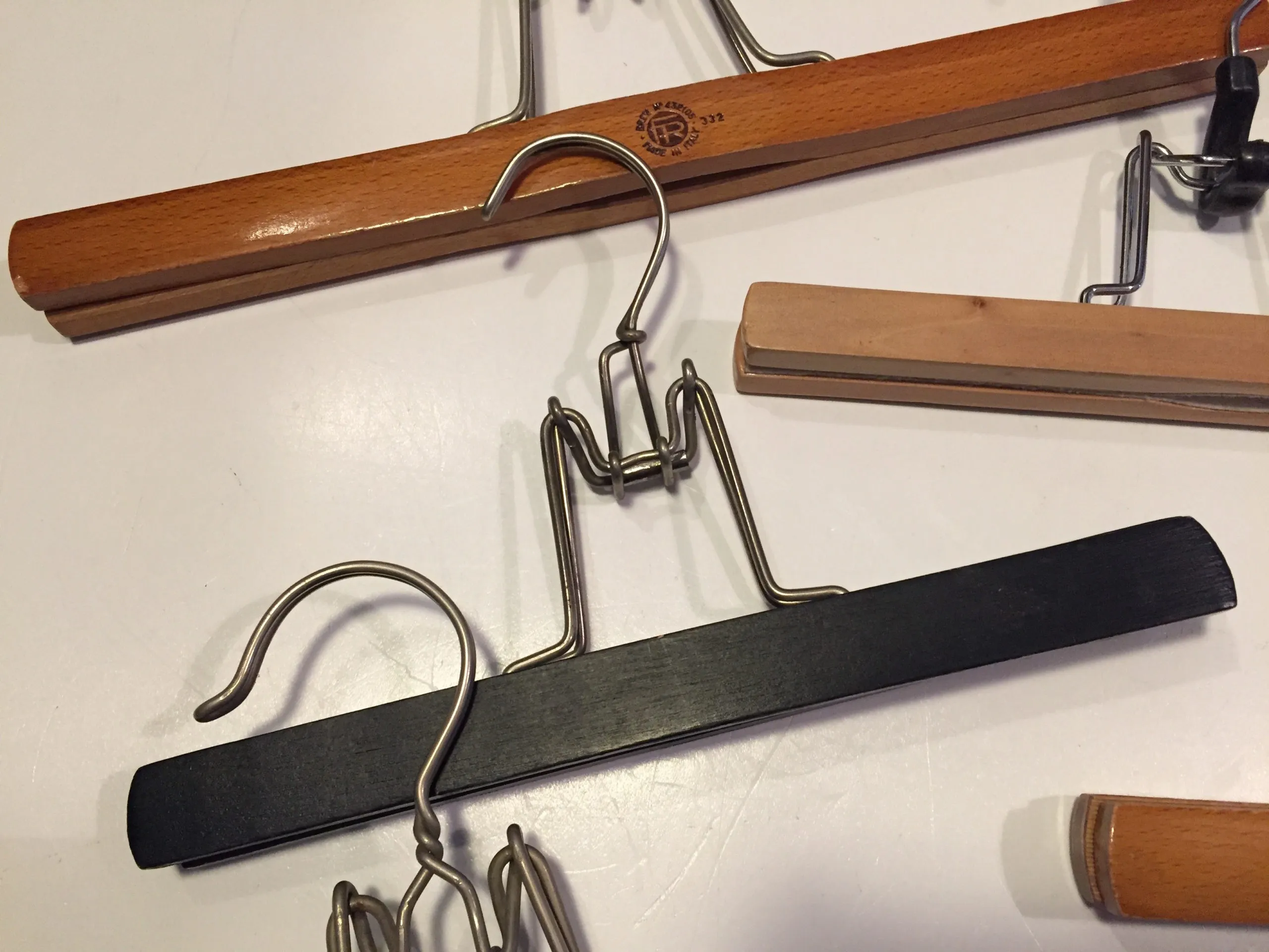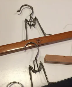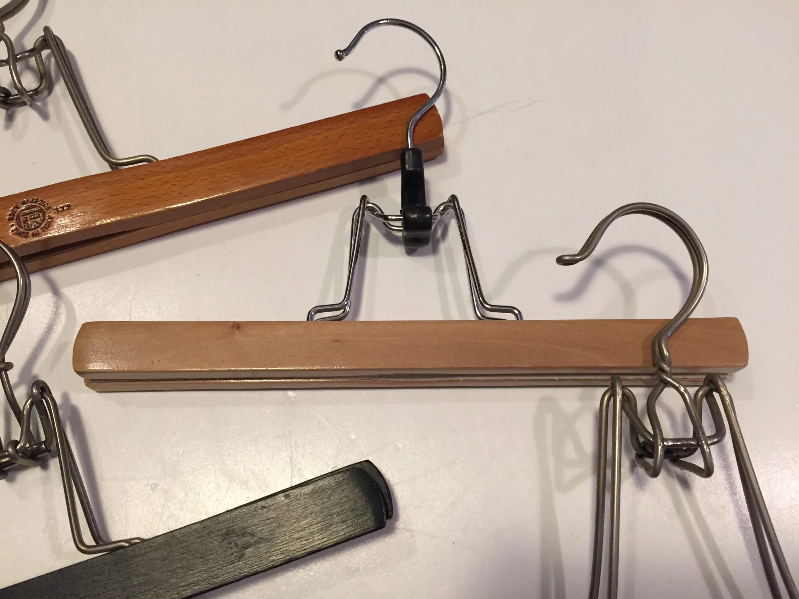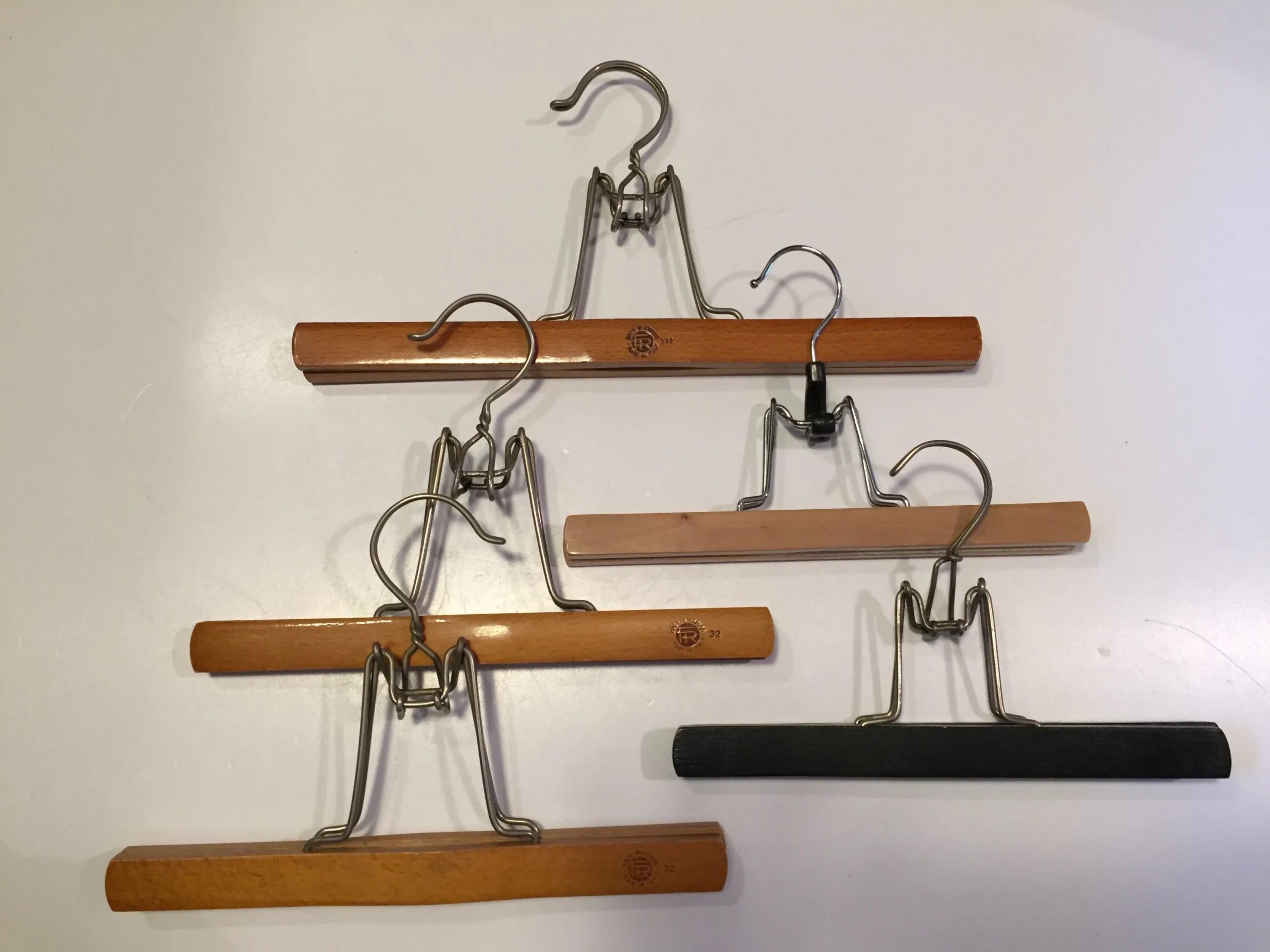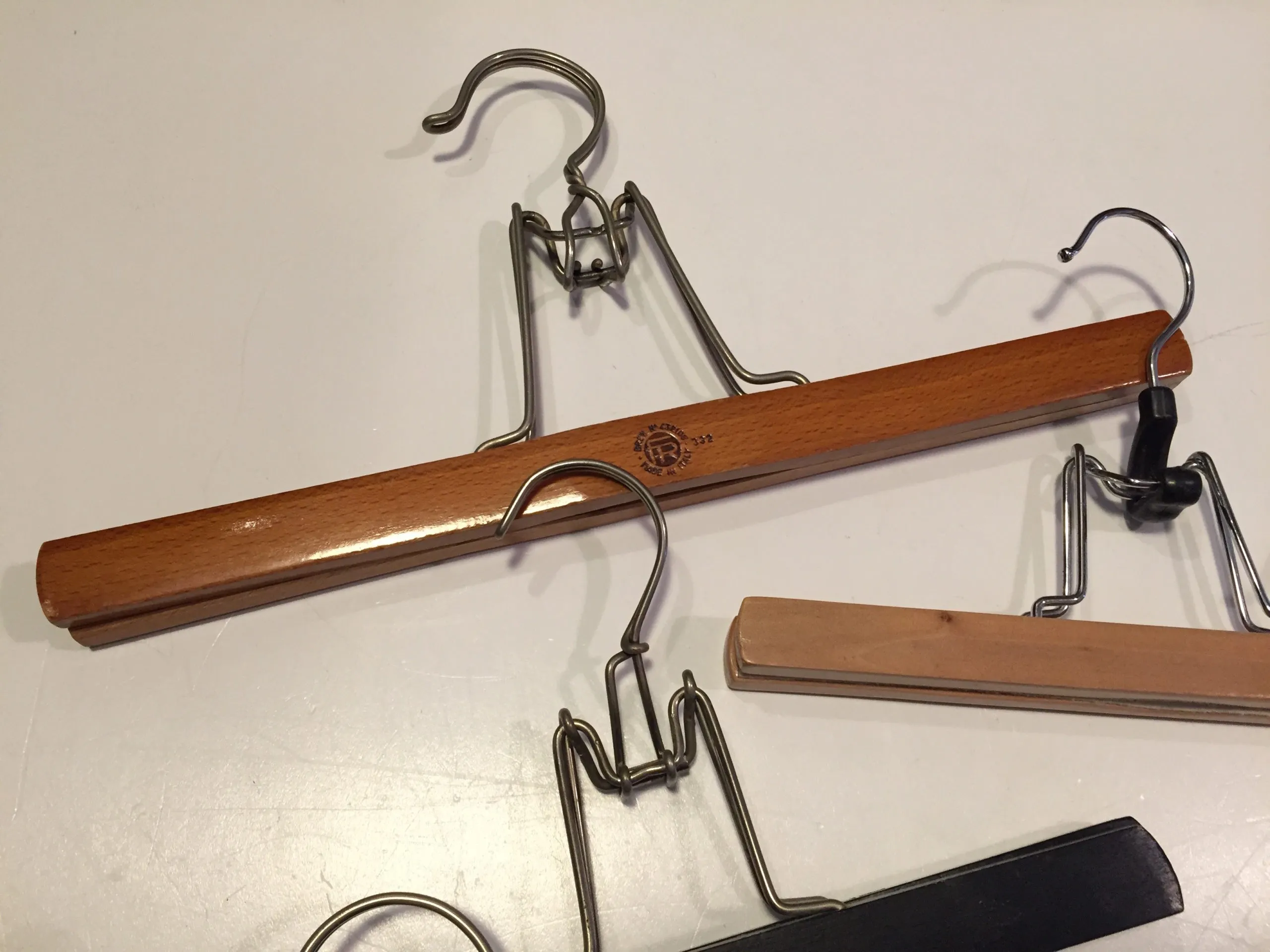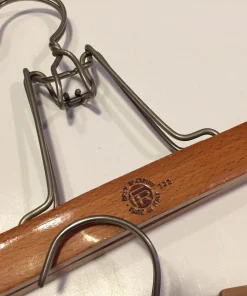 Joli Ensemble de Ensemble de 5 CINTRES à Pince en Bois VINTAGE dont 3 estampillés “FR – Brev – Made in Italy”, des Cintres pour le Rangement !