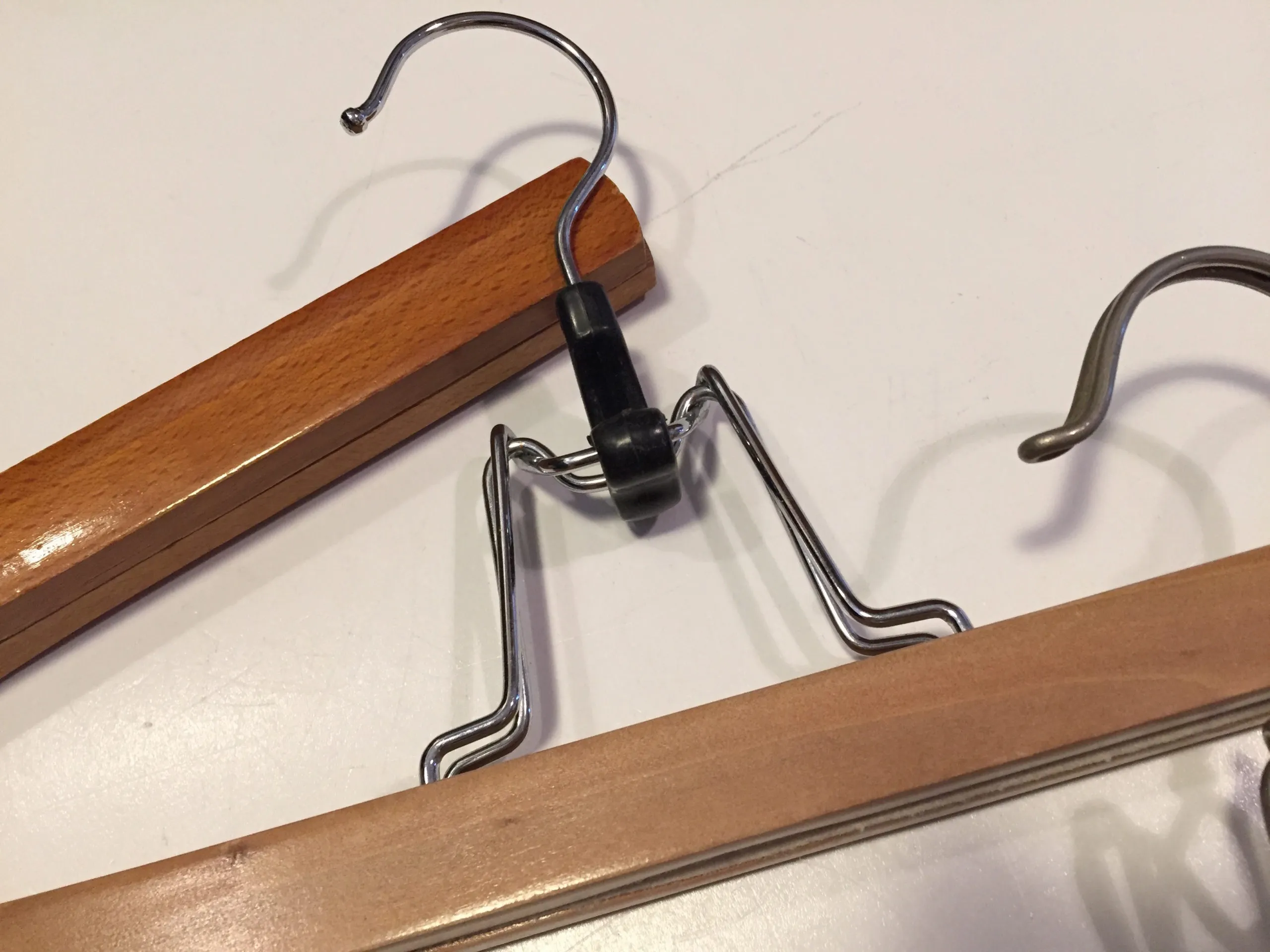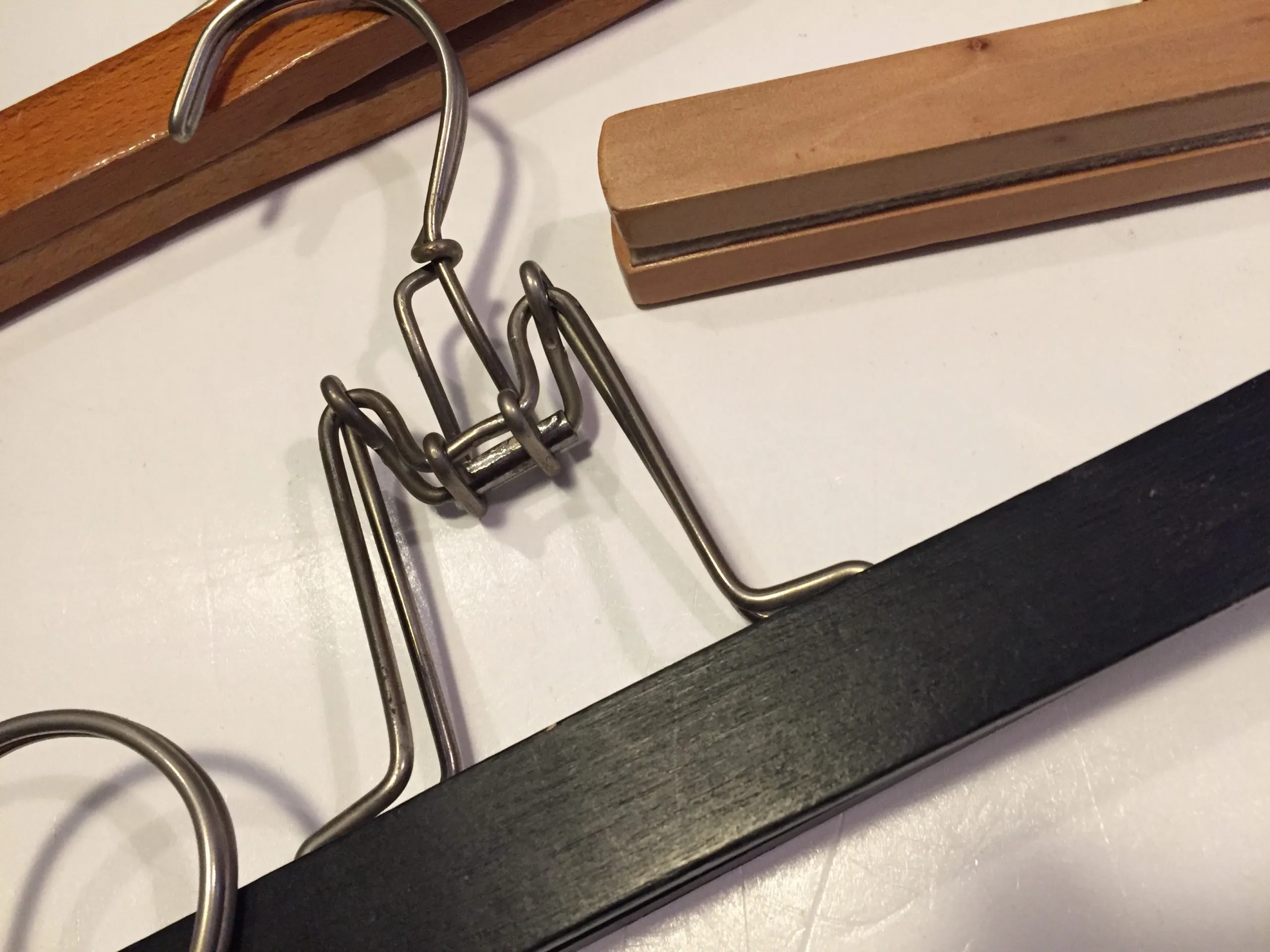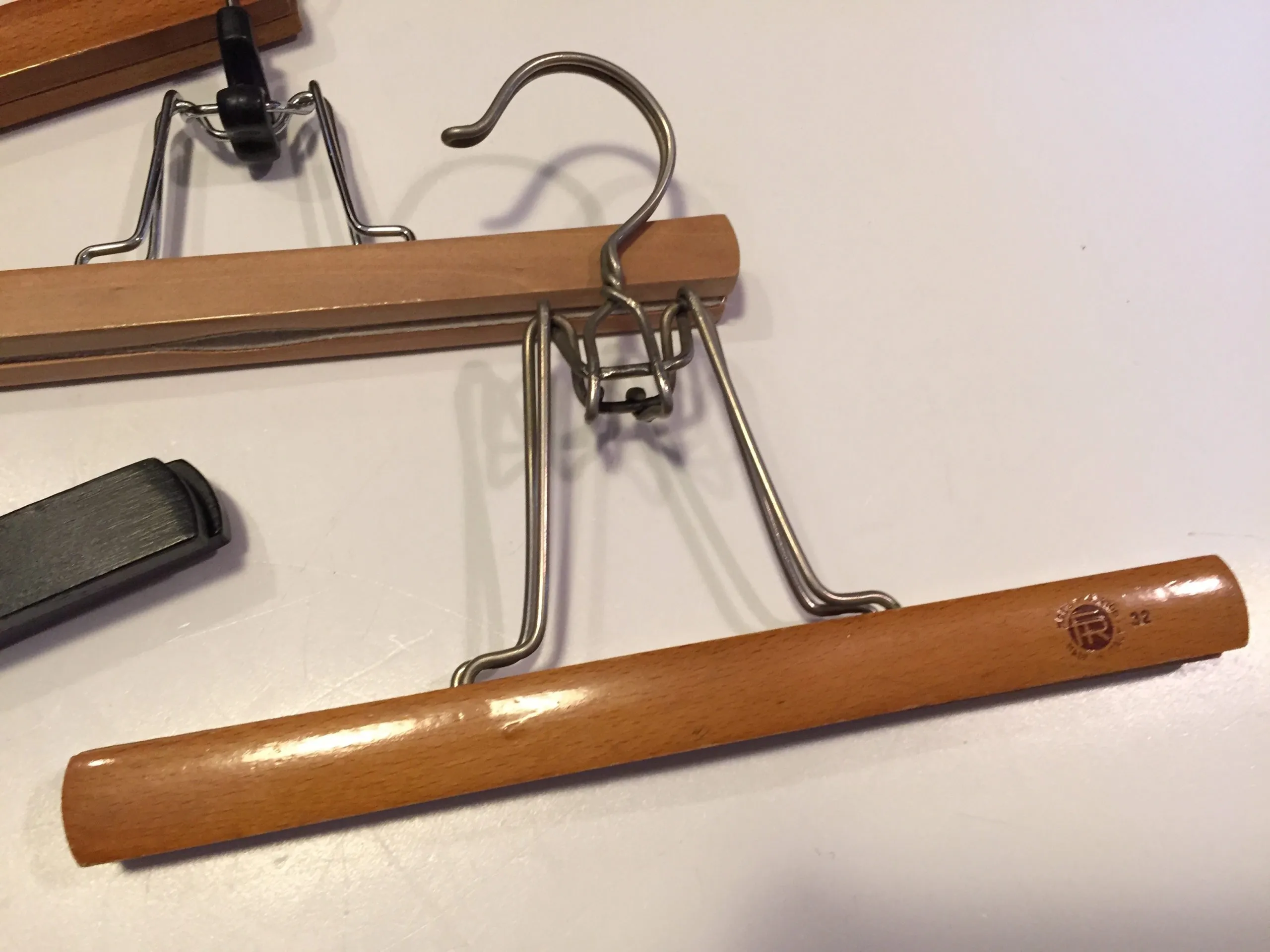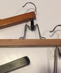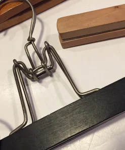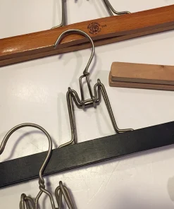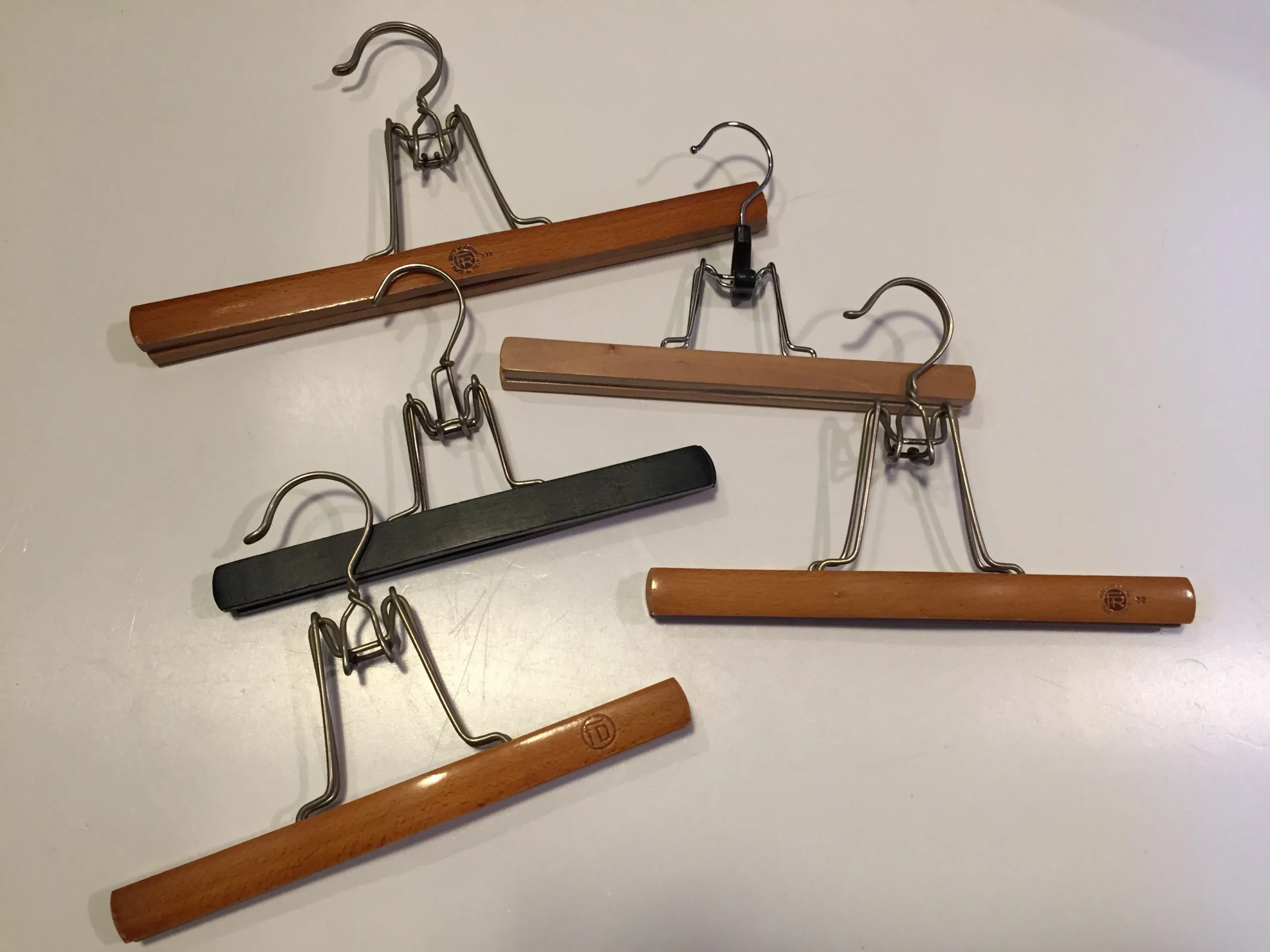 Joli Ensemble de Ensemble de 5 CINTRES à Pince en Bois VINTAGE dont 3 estampillés “FR – Brev – Made in Italy”, des Cintres pour le Rangement !
