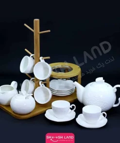 Ensemble théière, tasses de thé et café plus soucoupes en céramiques de haute qualité avec supports en bois