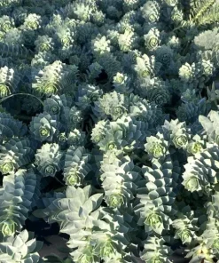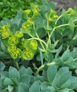 L’Euphorbia myrsinites forme une touffe compacte, de laquelle partent des tiges tapissantes. En fin de printemps, elle se pare de magnifiques fleurs vert chartreuses, disposées en spirales, qui persistent jusqu’en été.