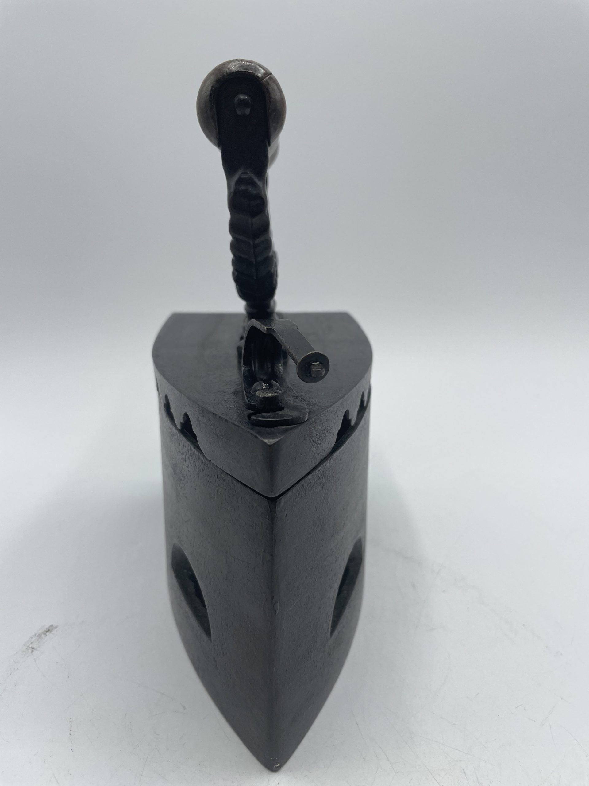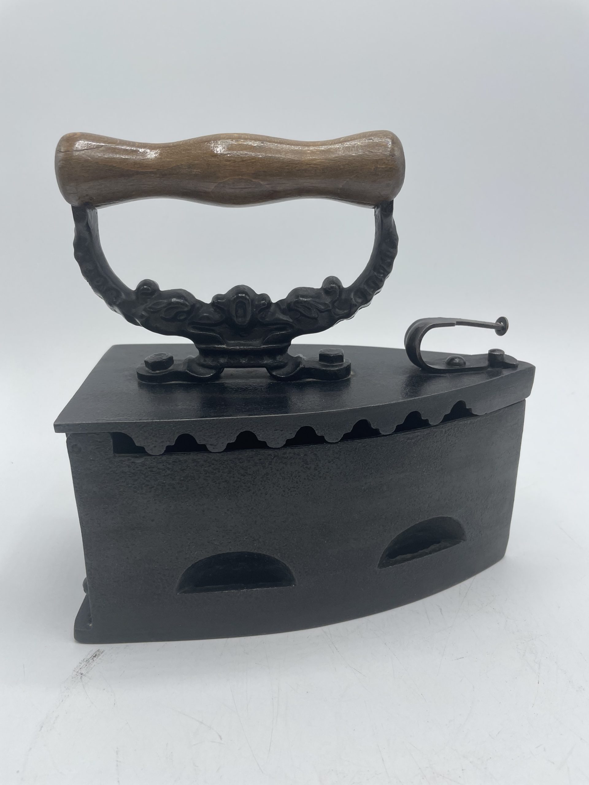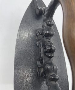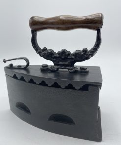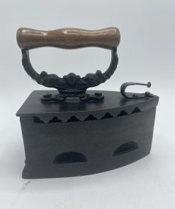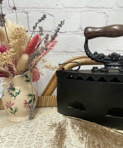 Comment ne pas craquer face à ce beau fer à repasser vintage. En fonte, on plaçait à l’intérieur du fer des braises chaudes pour pouvoir repasser le linge et on tenait le fer grâce à la poignée en bois qui arrêtait la chaleur. Le fer est décoré sur sa poignée de motifs en relief ornementaux. A l’intérieur, le fer est marqué KKO 3. Vintage, des traces d’usure et de la rouille sont à prévoir (cf photos) mais le fer reste en très bon état général. Un magnifique fer vintage pour une belle déco vintage et industrielle.