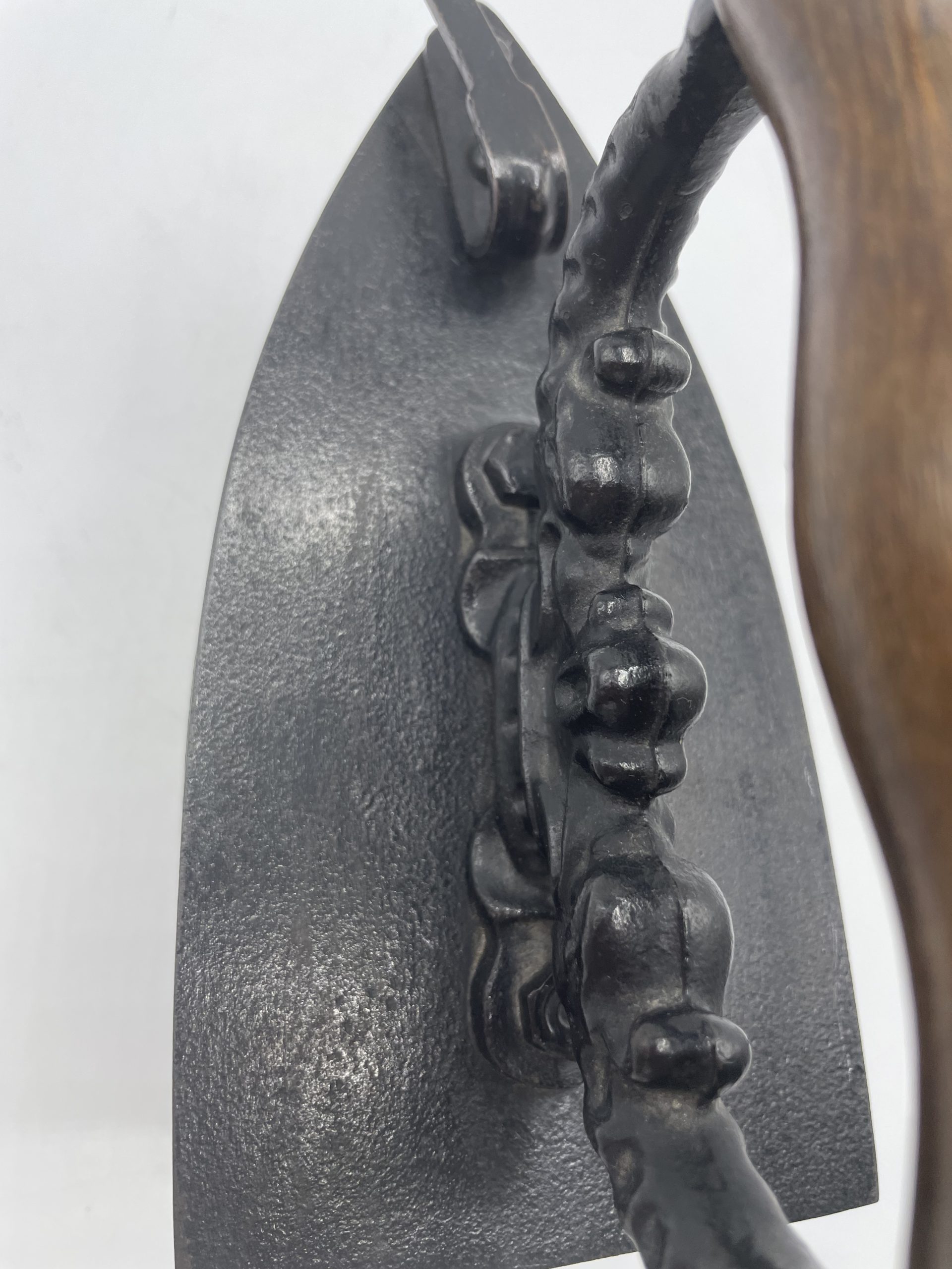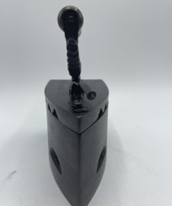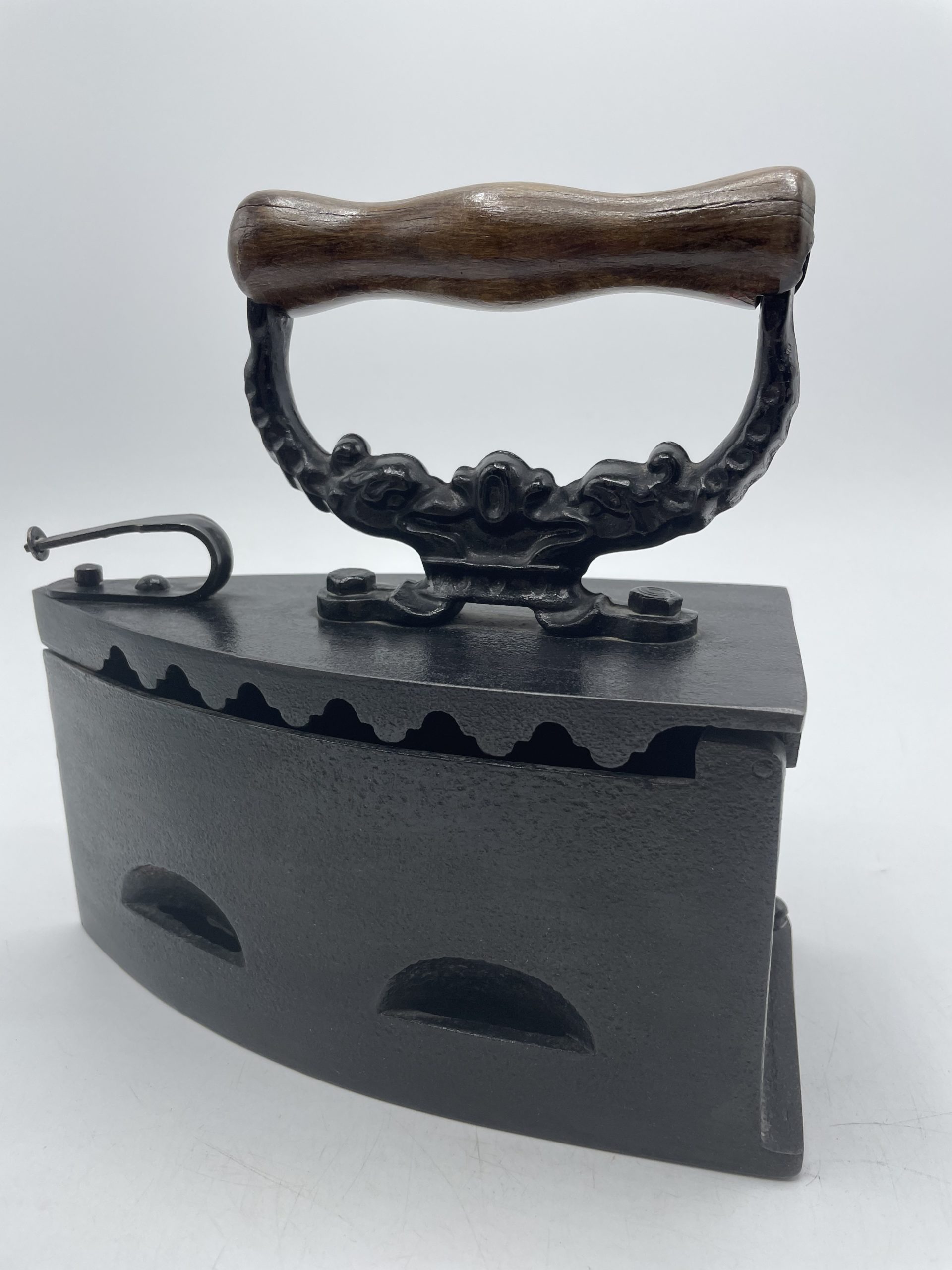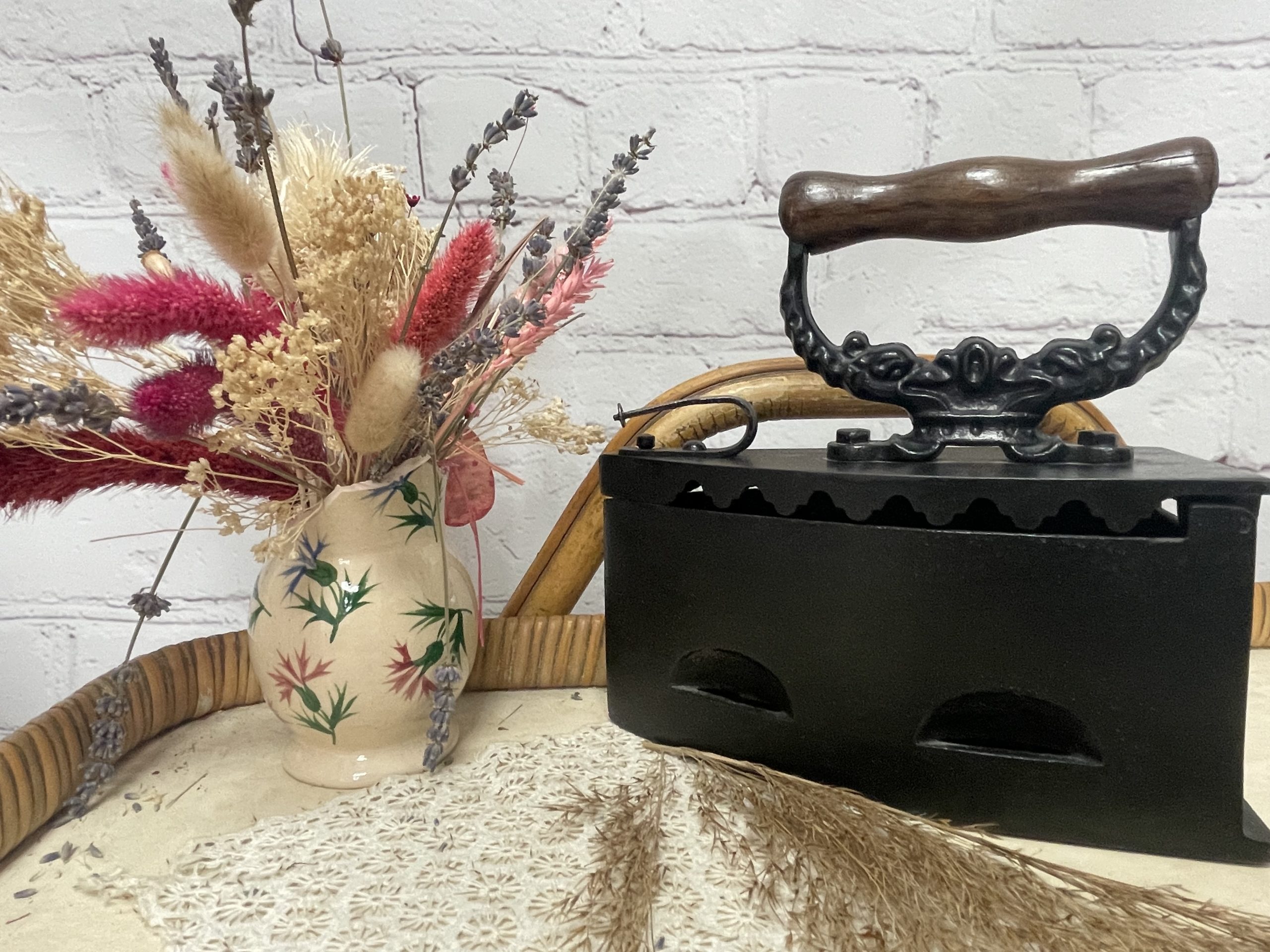 Comment ne pas craquer face à ce beau fer à repasser vintage. En fonte, on plaçait à l’intérieur du fer des braises chaudes pour pouvoir repasser le linge et on tenait le fer grâce à la poignée en bois qui arrêtait la chaleur. Le fer est décoré sur sa poignée de motifs en relief ornementaux. A l’intérieur, le fer est marqué KKO 3. Vintage, des traces d’usure et de la rouille sont à prévoir (cf photos) mais le fer reste en très bon état général. Un magnifique fer vintage pour une belle déco vintage et industrielle.
