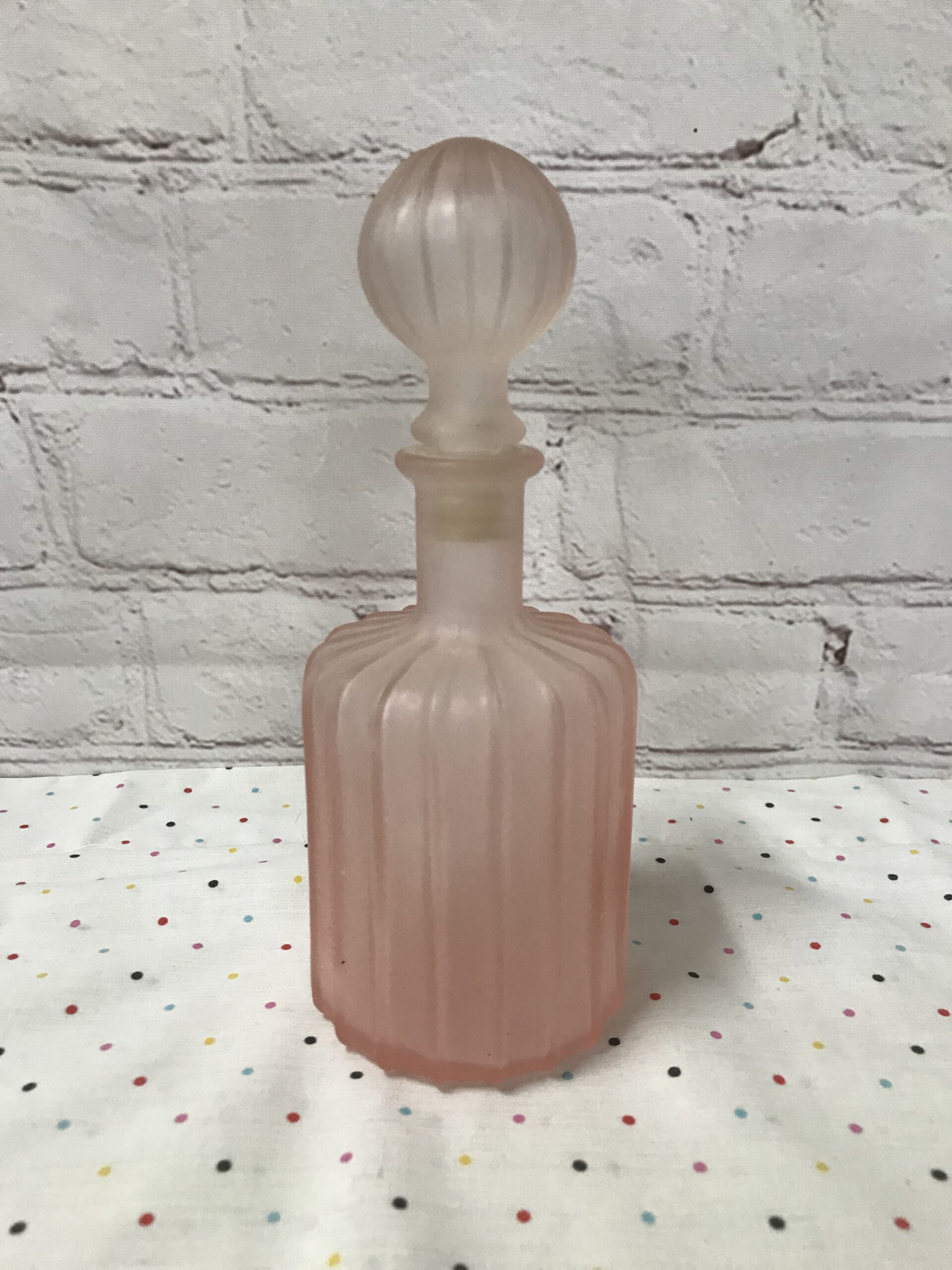 Petit coup de cœur pour ce flacon. D’une couleur vieux rose qui nous fait craquer. Il a une taille de 8 cm de largeur pour une hauteur de 15 cm sans bouchon et de 22 cm avec bouchon. Il a une forme originale côtelée. Un beau design pour cette pièce déco. Il peut aussi bien être mis dans une salle de bain, un salon ou une autre pièce. Vintage comme il faut, il sera vous plaire. Très bon état rein a déclaré si ce n’est que le joint du bouchon est abimé, il est en plastique.