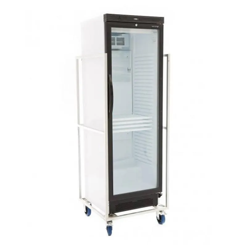 Frigo en location : réfrigérateur vitré blanc idéal pour garder vos aliments et boissons au frais tout au long de votre événement. Ce frigo vitrine en location est modulable grâce à ses 5 étagères. Nous louons également des comptoirs réfrigérés. Livraison possible du frigo vitrine sur le lieu de vos événements. Nos frigos vitrines en location sont placés dans une armature métallique à roulettes, ce qui en facilite grandement la mise en place.