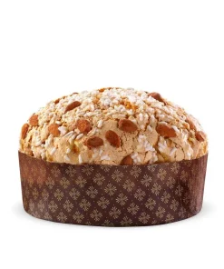 Originaire de la région de Milan, cette brioche traditionnelle, moelleuse & parfumée, est fourrée de raisins secs, d’écorces d’oranges et de cédrats confits. La panettone est recouverte d’un glaçage de sucre et d’amandes grillées.