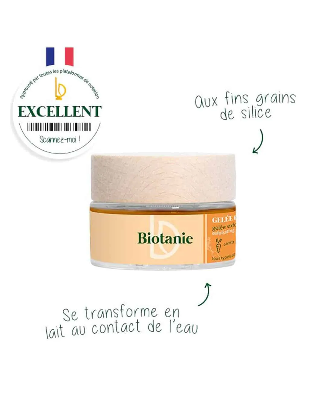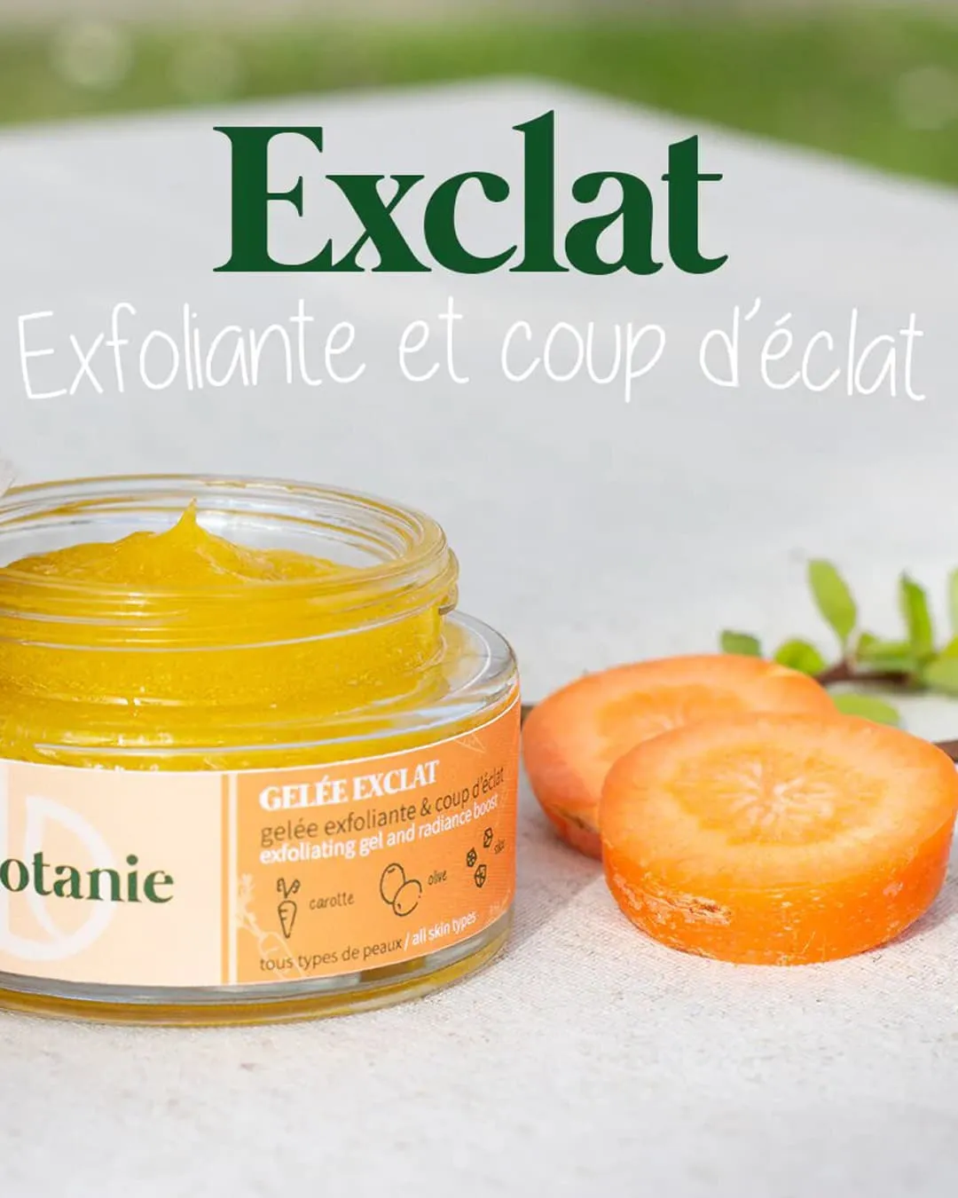 La gelée Exclat® donnera un véritable coup d’éclat à votre peau grâce au macérât de carotte. Tous les bons ingrédients sont réunis pour une expérience unique : l’huile d’olive pour nourrir la peau et des grains de silice pour l’exfolier en douceur. Grâce à sa galénique innovante, dites au revoir à la sensation de tiraillement souvent présente après le gommage : sa texture onctueuse se transforme en lait nourrissant au contact de l’eau. Libérée des impuretés, la peau sera douce, nourrie et éclatante.