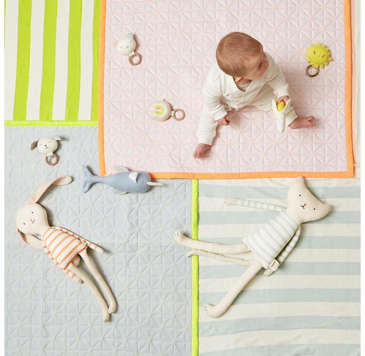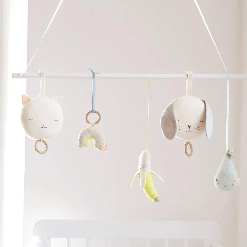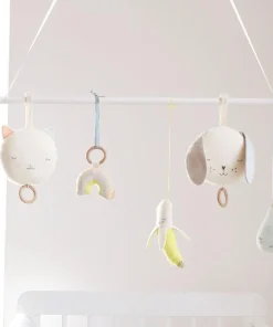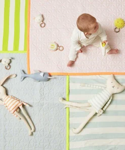 Offrez à votre bébé un jouet d’éveil premier âge tout doux, confectionné en coton biologique et orné de surpiqûres brodées et de maille or brillante.