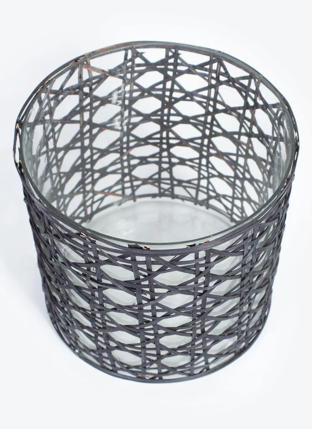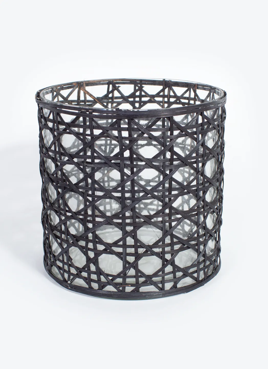 Photophore en verre de Hoff qui sert également de pot pour les plantes. Décoré de tresses de rotin pour ajouter une touche d’ambiance estivale.