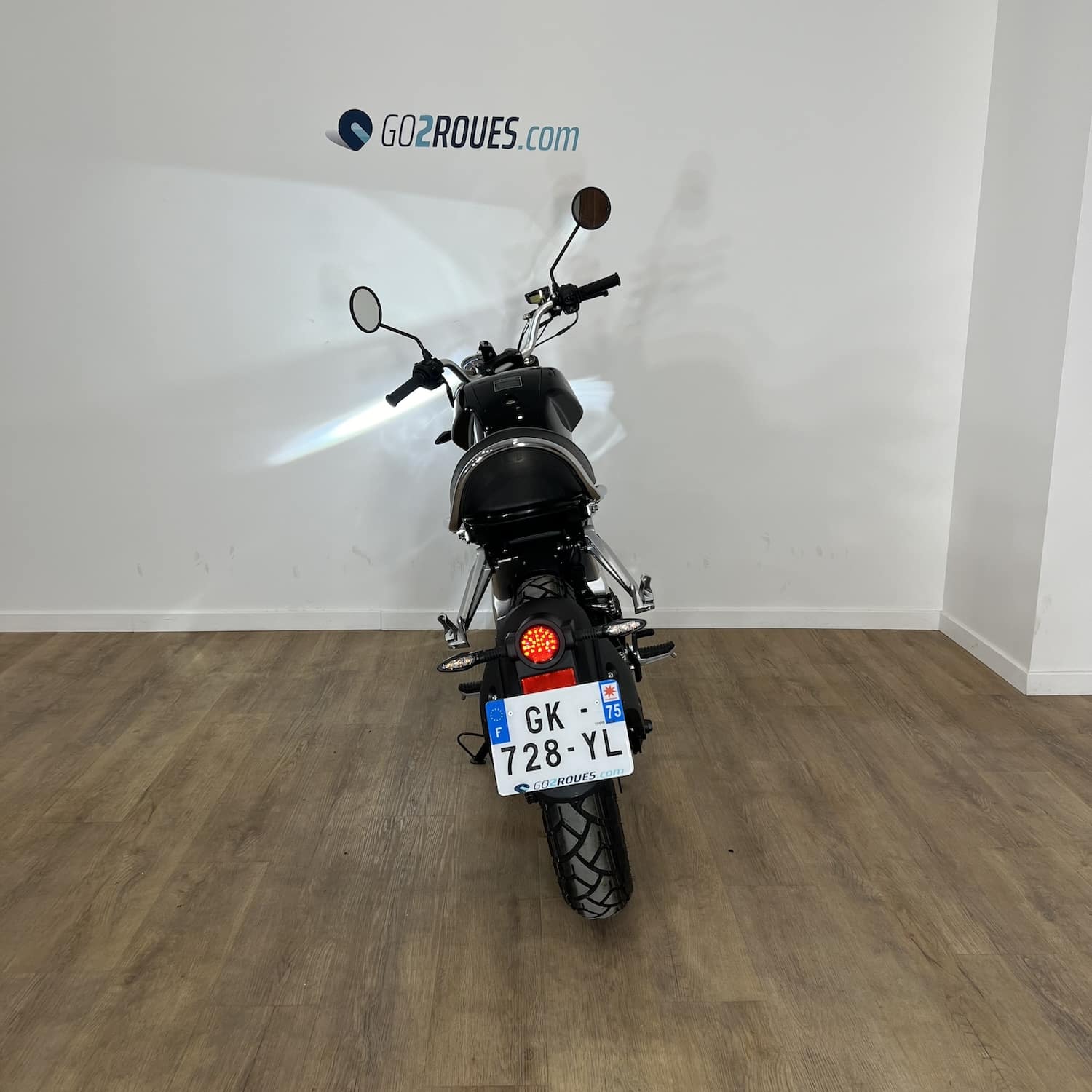 On note également la présence du CBS, pour des distances de freinage réduites ainsi qu’un système d’éclairage full LED et un dispositif de mise en route sans clé, « keyless ». Puis, un port USB. Sous le faux réservoir, un petit coffre. Il y a suffisamment de place pour loger le câble de charge fourni, et une paire de gants. Pratique !