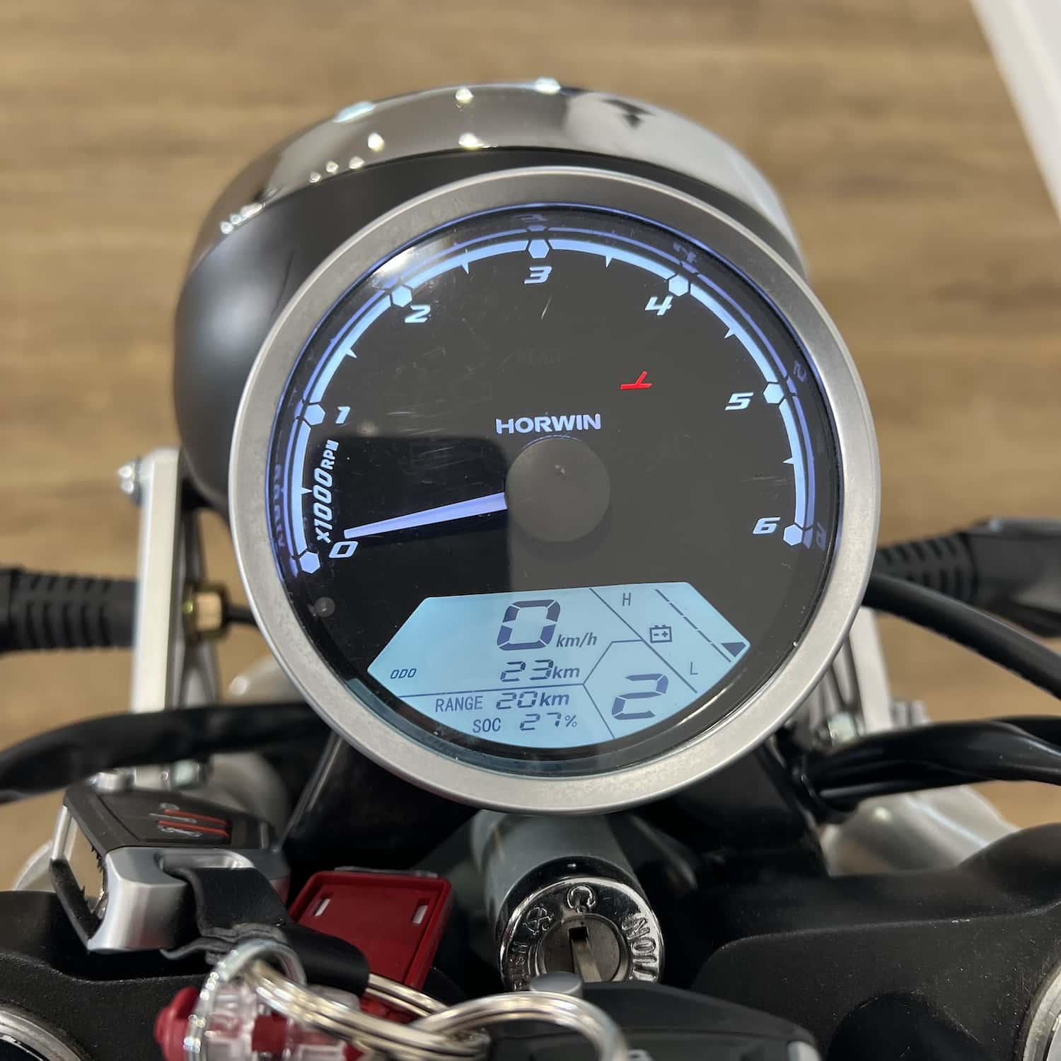 La Horwin CR6 se recharge plutôt rapidement : le 0 à 80 % s’effectue en trois heures seulement. Cette charge s’effectue via une prise domestique de 220 V classique. Le chargeur est intégré à la moto : concrètement, pour effectuer la recharge de la batterie, il suffit de brancher le câble fourni à la moto et à la prise secteur. Il n’y a donc pas de chargeur externe à emporter avec soi. La marque annonce également qu’en seulement vingt minutes de recharge, vous pourrez déjà parcourir entre 20 et 30 kilomètres, de quoi vous satisfaire en cas d’imprévu. La seule chose que nous regrettons est que cette batterie n’est pas amovible et contraint donc son propriétaire à disposer d’un lieu fermé dans laquelle la charger.