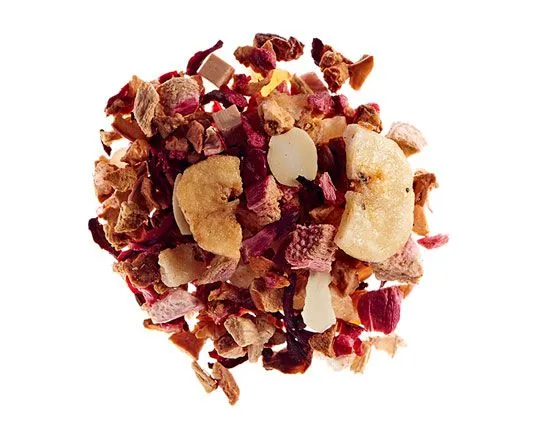 Morceaux de pomme, de banane, feuilles d’hibiscus, morceaux de caramel, amandes effilées, canneberge, morceaux de rhubarbe.