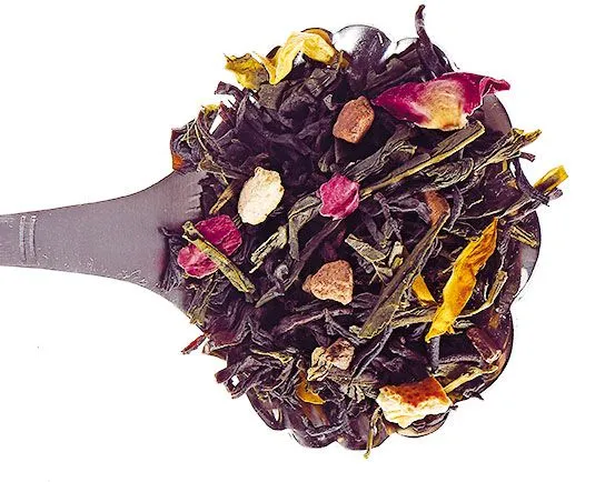 Thé noir, thé vert, cannelle, gingembre, clou de girofle, écorces d’orange, cardamome, anis, fenouil, écorces de citron, pétales de souci, pétales de rose, fleurs d’oranger.