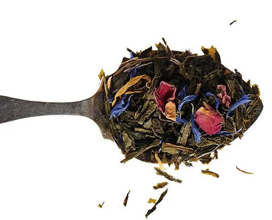 Thé vert fruité aux notes dominantes de pêche et d’abricot, pétales de bleuet, pétales de rose, pétales de souci.