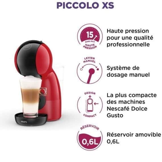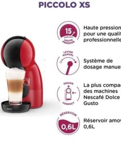 Caractéristiques Une pression qui fait la différence, XS : compact et design, Fonction eau chaude / eau froide, Simplicité d’utilisation, Système multi-boissons, Capsule intelligente, Porte tasse amovible deux niveaux, La machine la plus compacte des Nescafé Dolce Gusto, Manipulation facile, Éco-énergétique