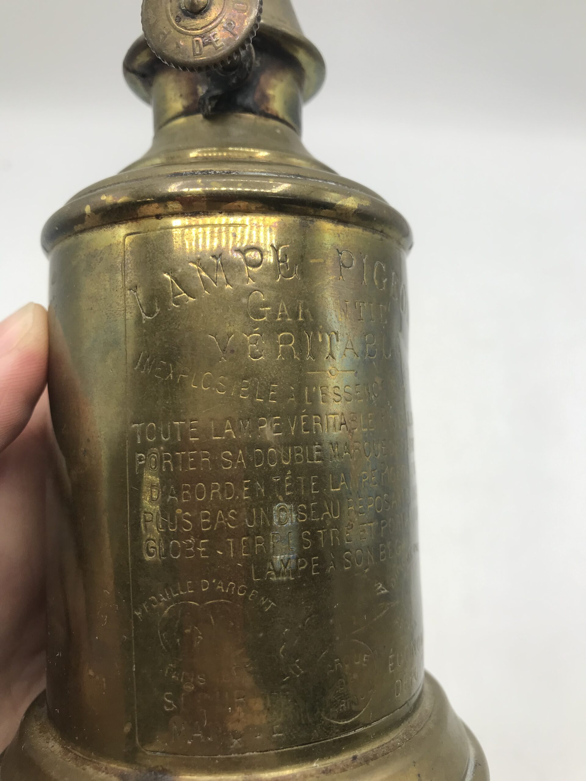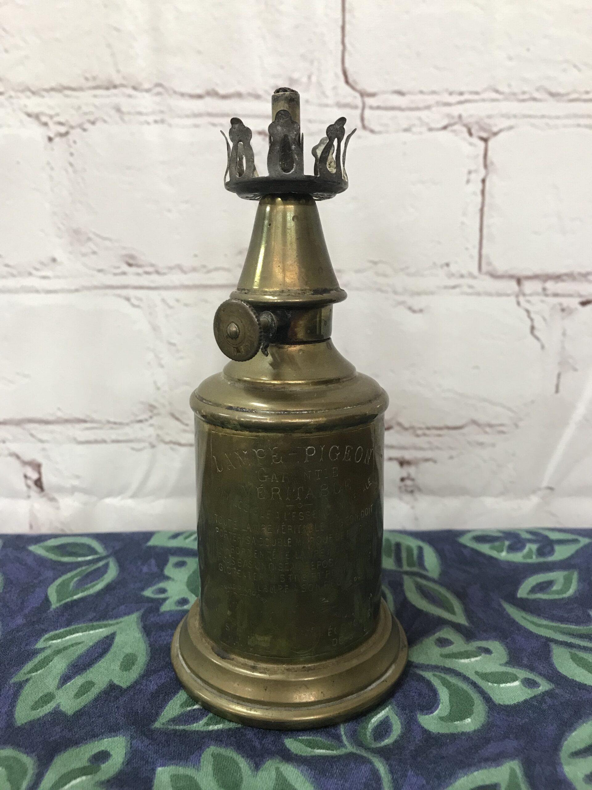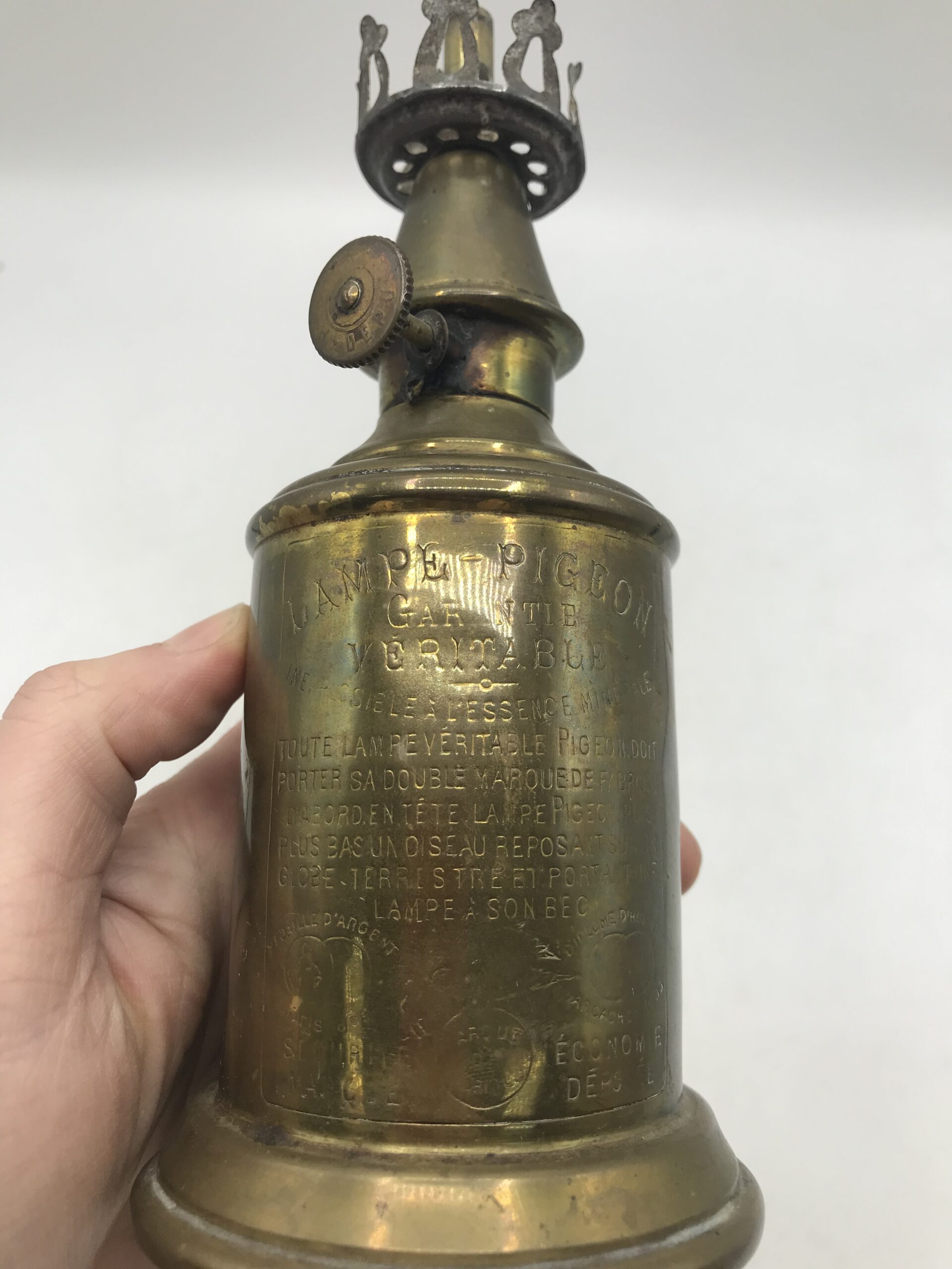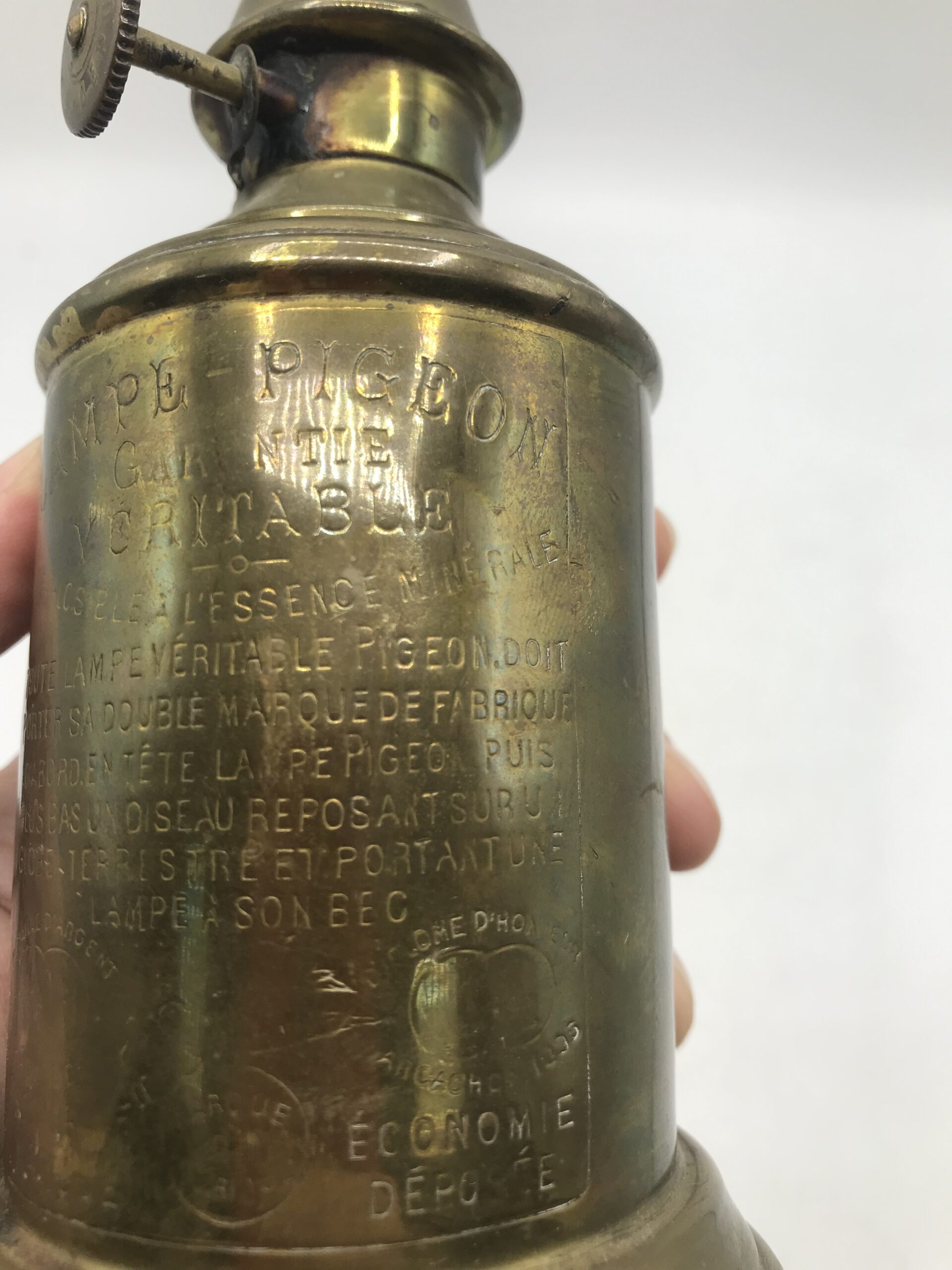 lampe à pétrole Lampe-Pigeon « Garantie véritable ». Lampe à pétrole ancienne qui porte les inscriptions Garantie véritable, inexplosible à l’essence minérale. Toute lampe véritable Pigeon, doit porter sa double marque de fabrique. D’abord en tête lampe Pigeon puis plus bas un oiseau reposant sur un globe terrestre et portant une lampe à son bec. La lampe mérite un bon nettoyage pour lui redonner ses lettres de noblesse. Un bel objet déco, avis aux amateurs. Elle est vendue sans la partie en verre.