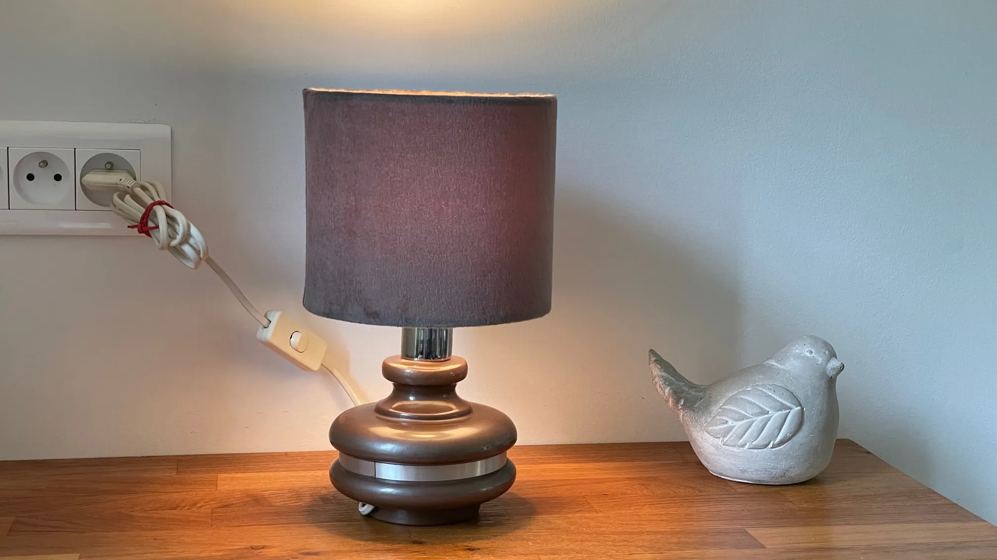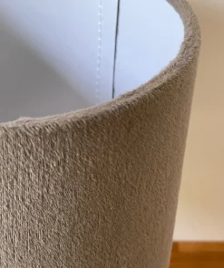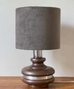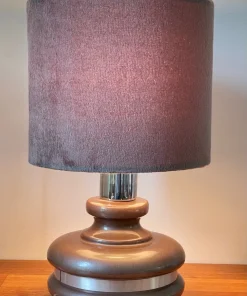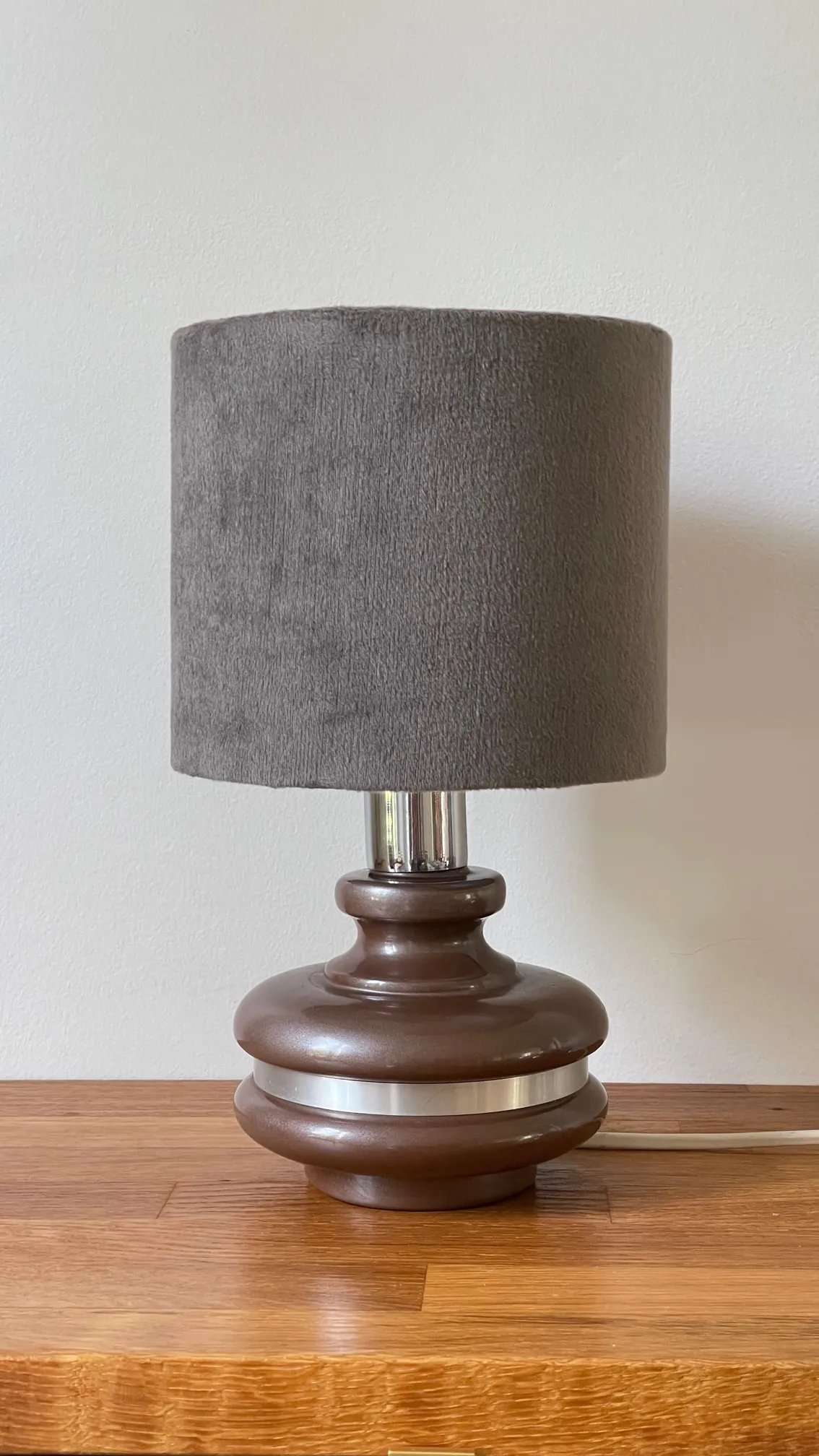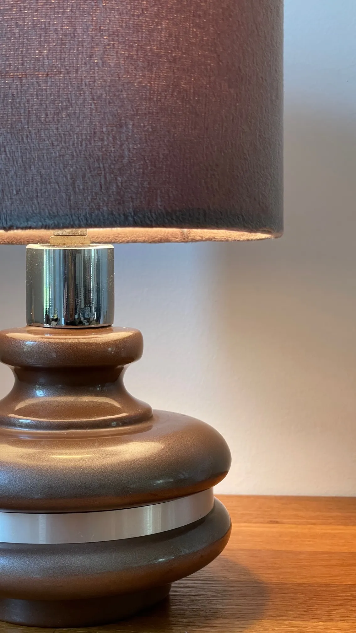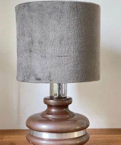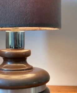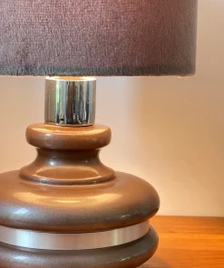 Pieds en céramique émaillée couleur chocolat Pailleté argenté, cerclé d’une tige d’aluminium brossé, abat jour de belle qualité en Velours couleur Gris-taupe.
