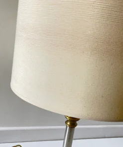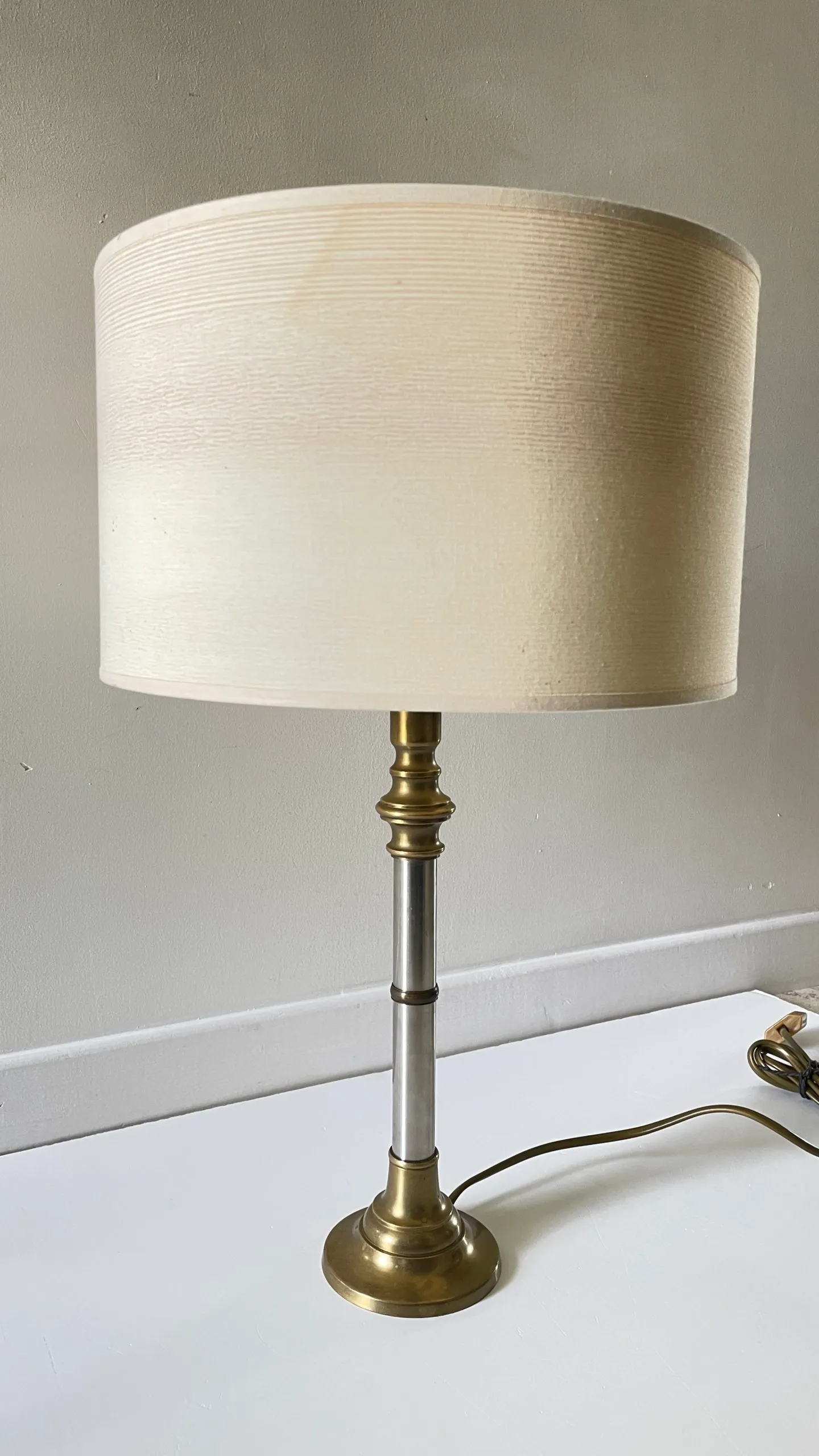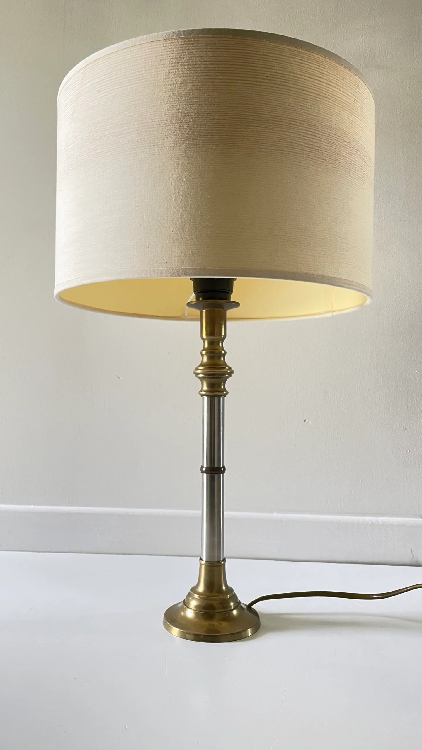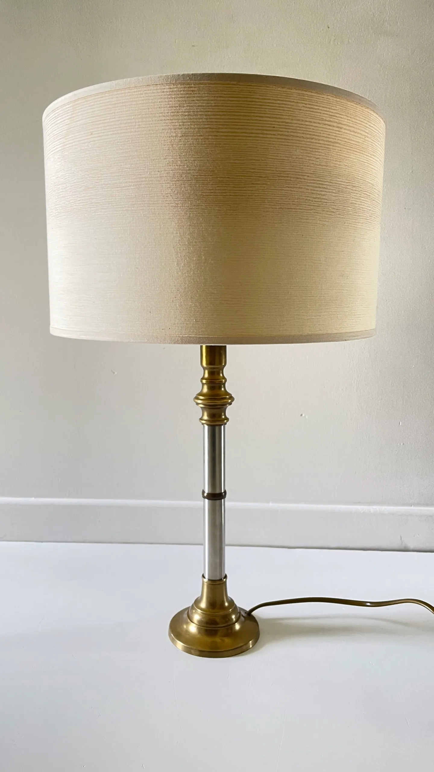Belle lampe chic en acier et laiton des années 70, et son abat-jour crème effet bois, une pièce élégante et minimale.