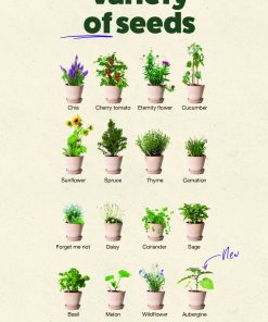 - Variétés de graines disponibles : Basilic, Œillet, Tomate Cerise, Chia, Coriandre, Marguerite, Ne m’oublie pas, Sauge, Épicéa, Tournesol, Thym, Concombre, Melon, Persil, Fraise, Roquette. Ces différentes graines permettent de choisir selon vos préférences ou celles de vos clients.