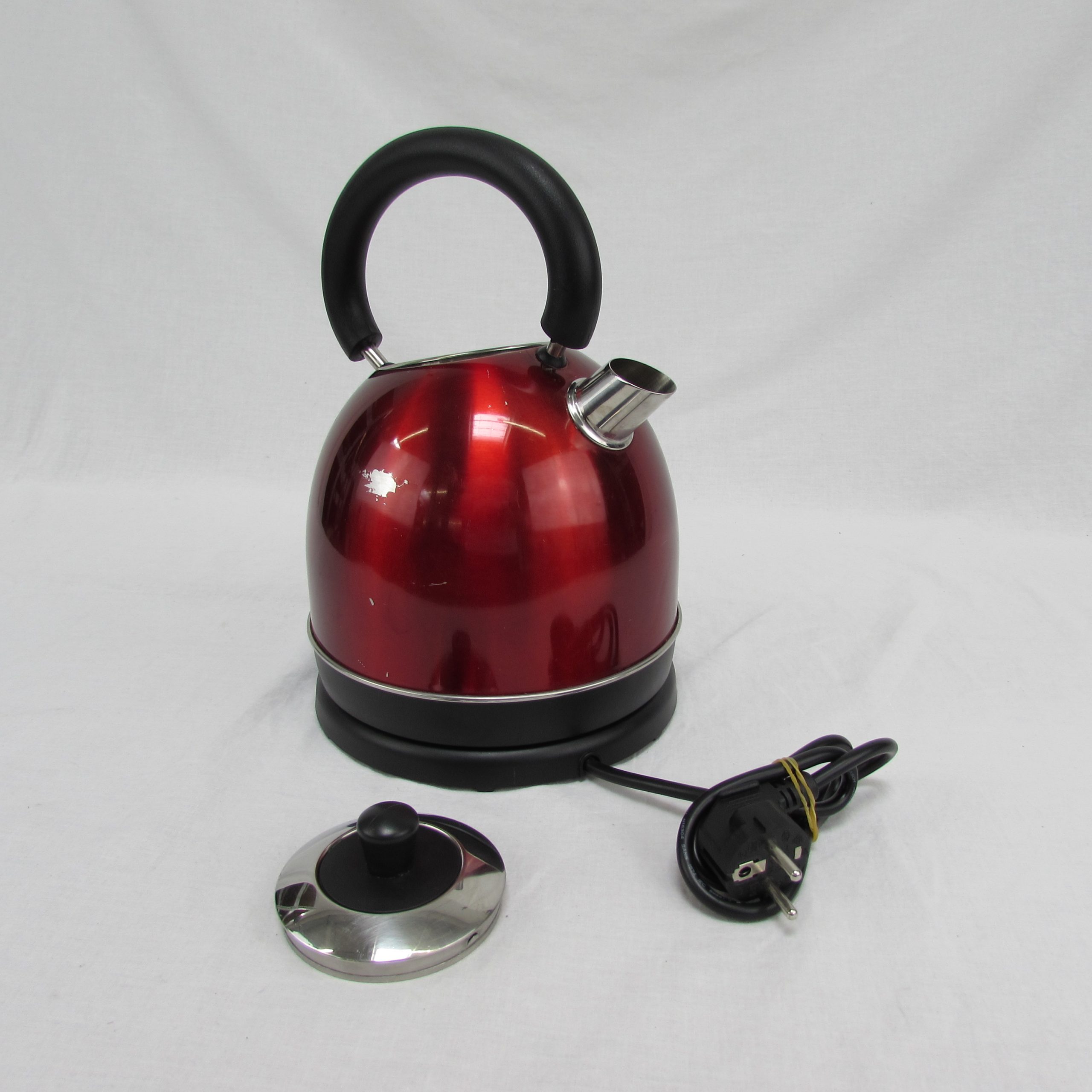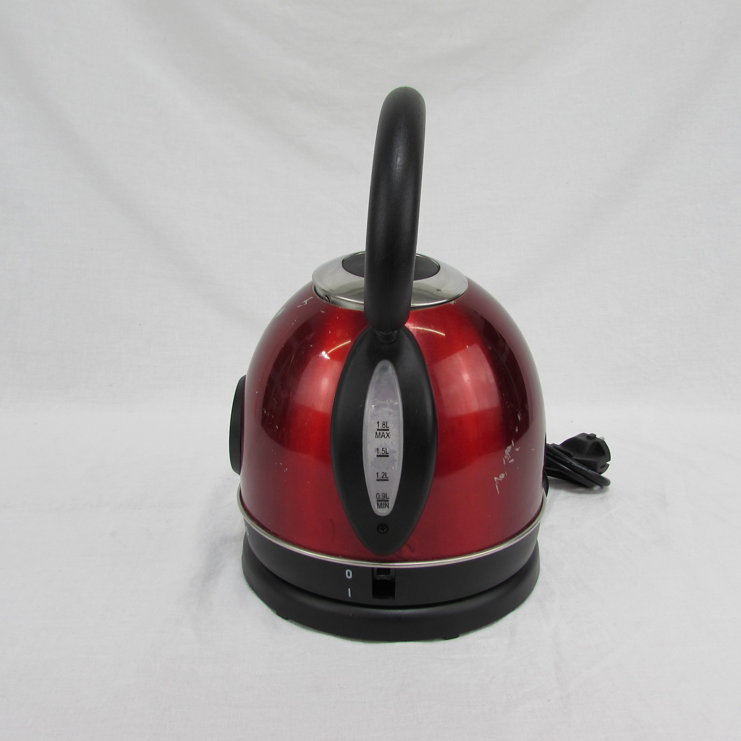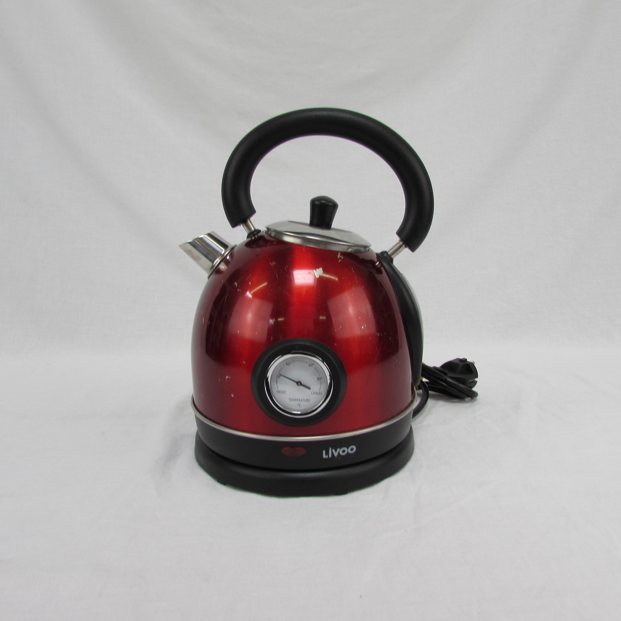 La bouilloire d’occasion Livoo DOD157 Rouge est un appareil pratique malgré quelques marques et rayures visibles, reflétant son état esthétique moyen.