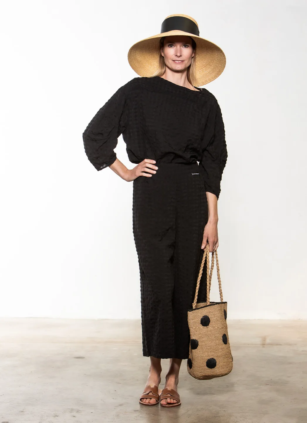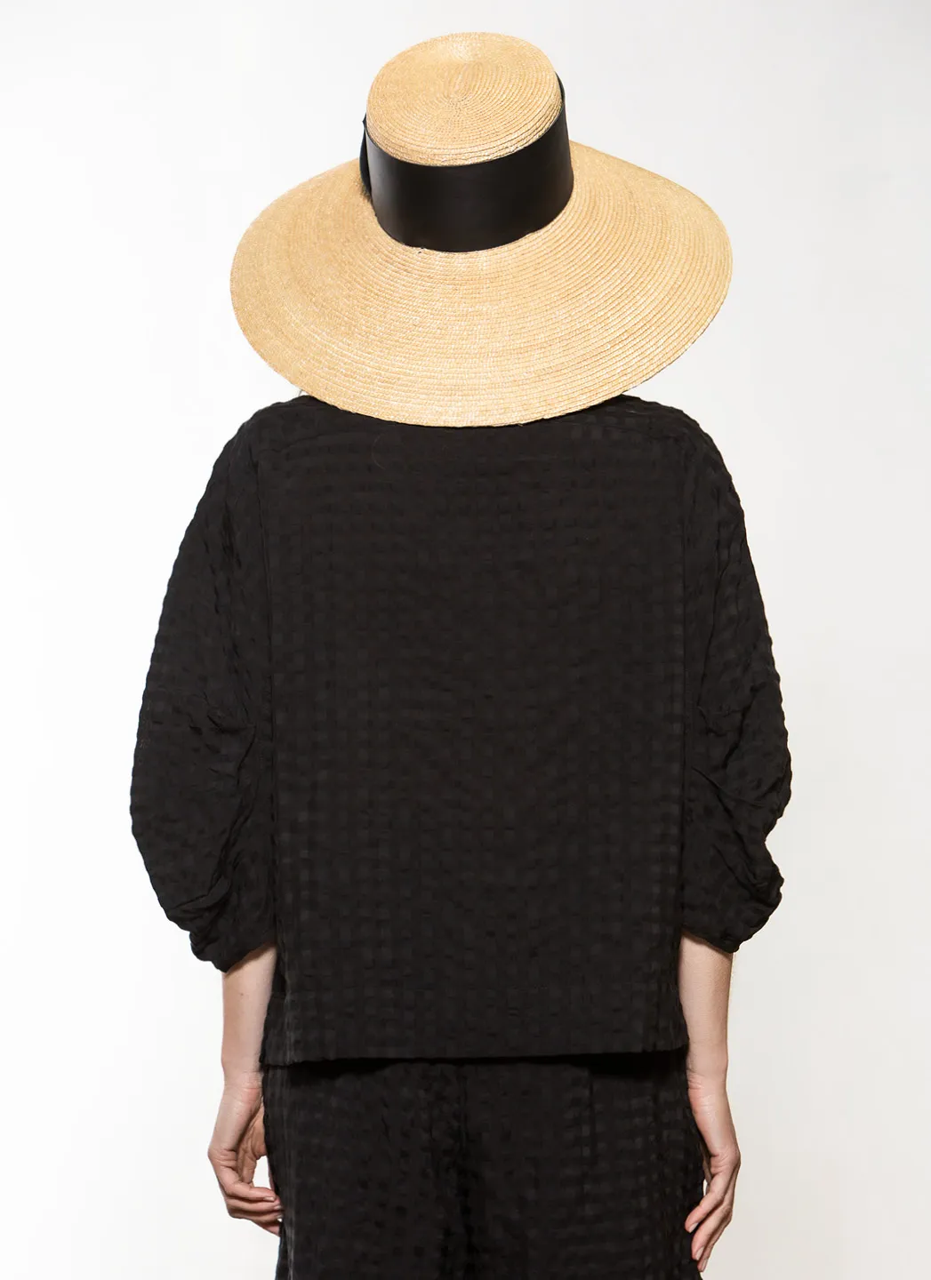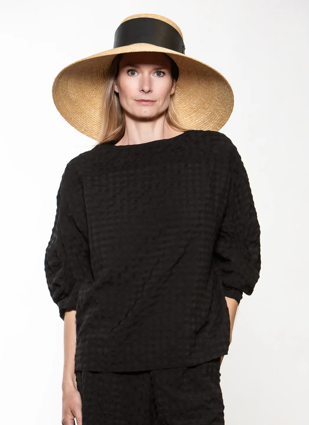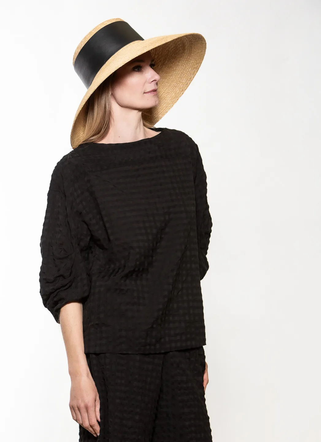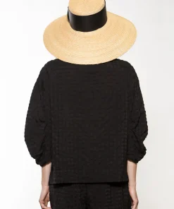 – Silhouette carrée et ample avec épaules tombantes et manches bouffantes
