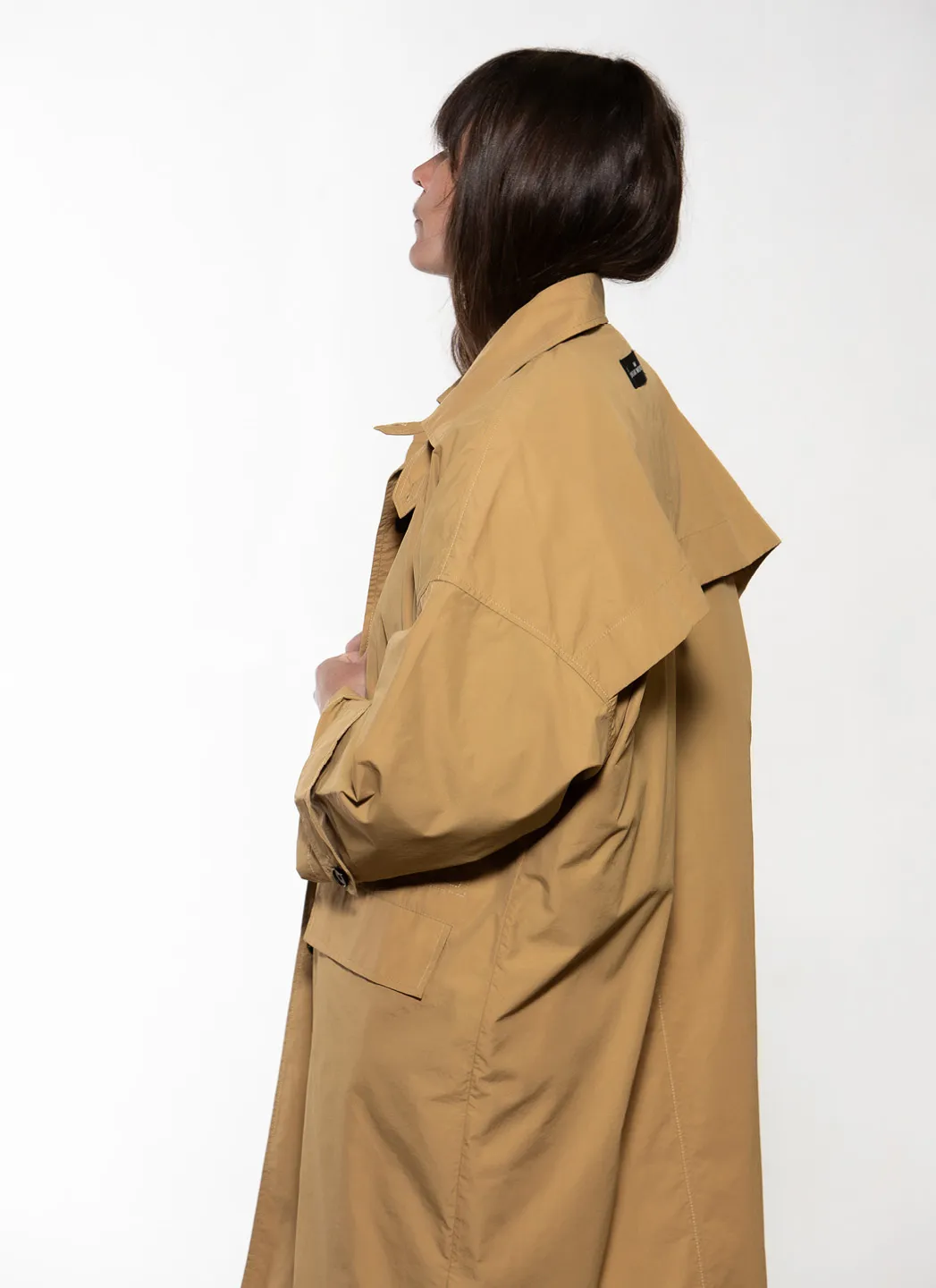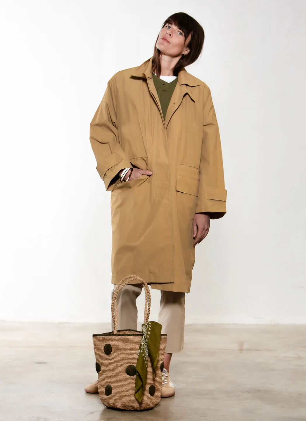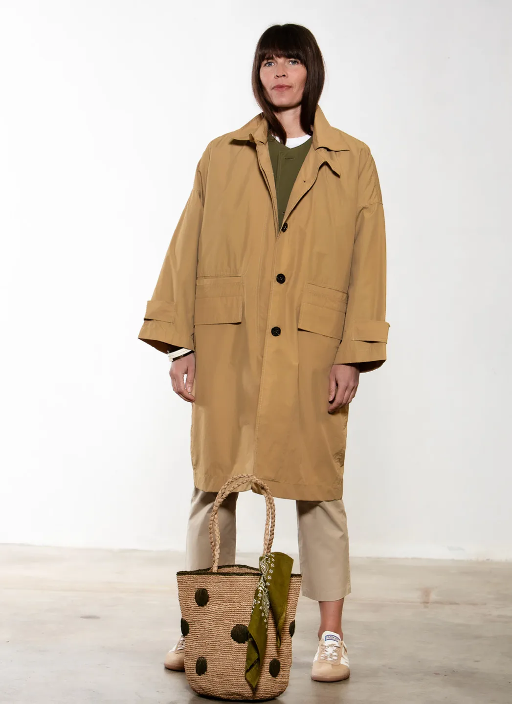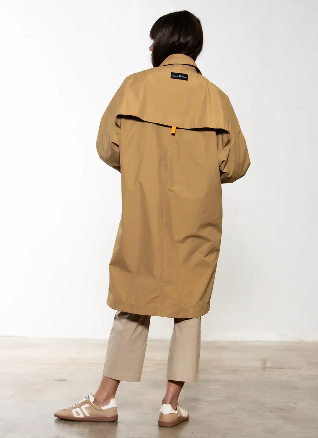 Superbe imperméable en gabardine de nylon et de coton. Un indispensable à avoir dans sa garde-robe et pour toutes les saisons. Col à rabat et poches sur le devant. Un ruban orange fluo est disposé en haut du dos, ce qui apporte une touche de modernité et d’avant gardisme.