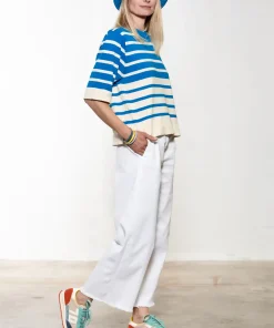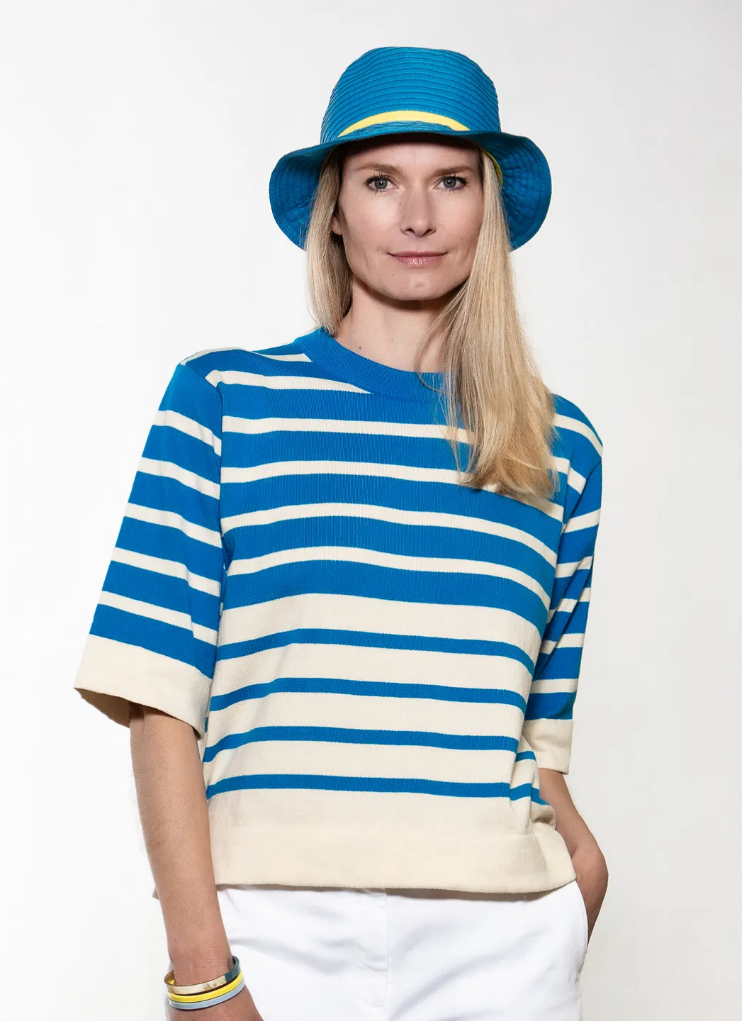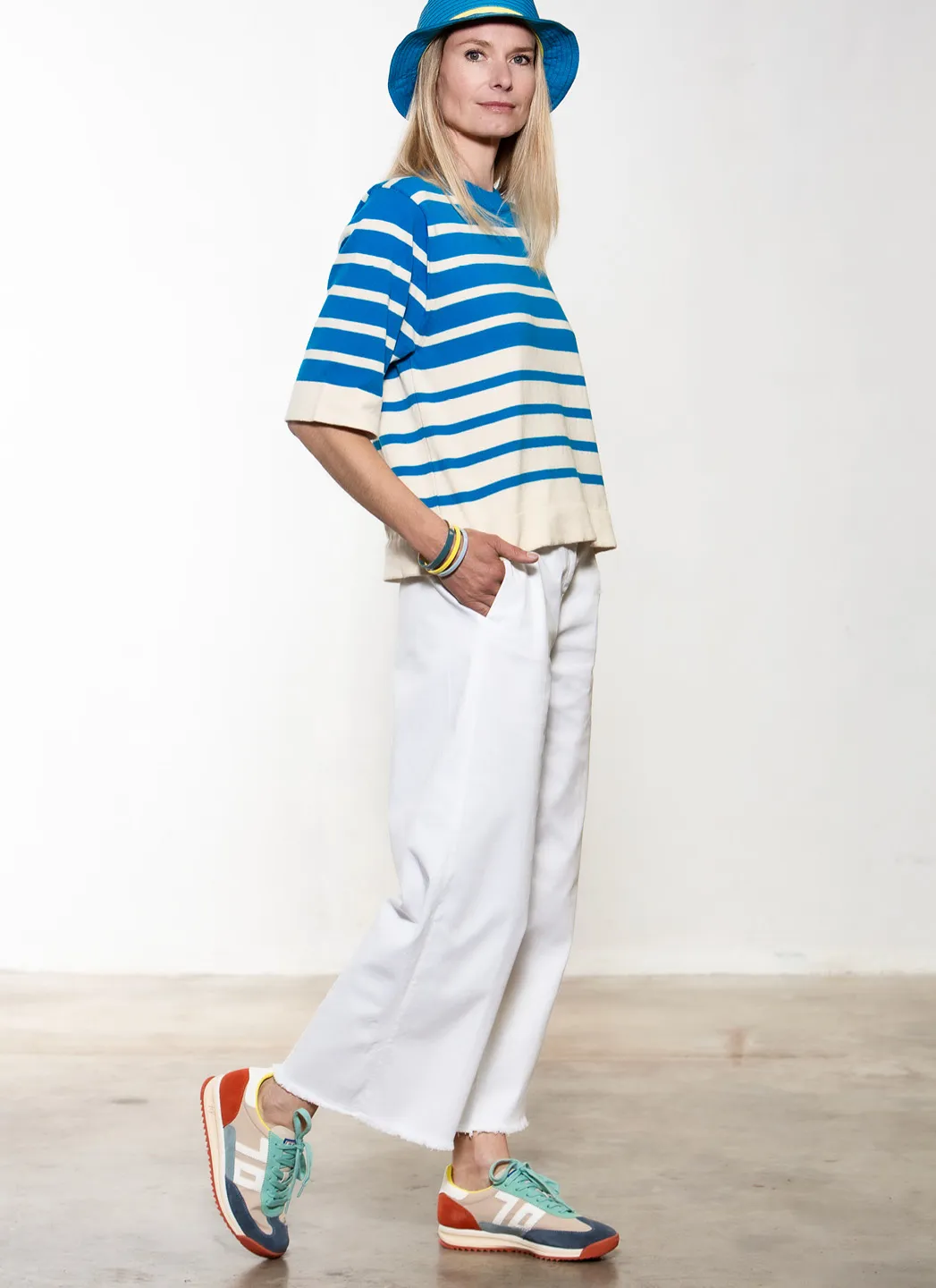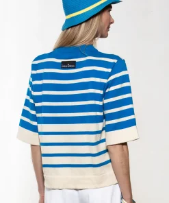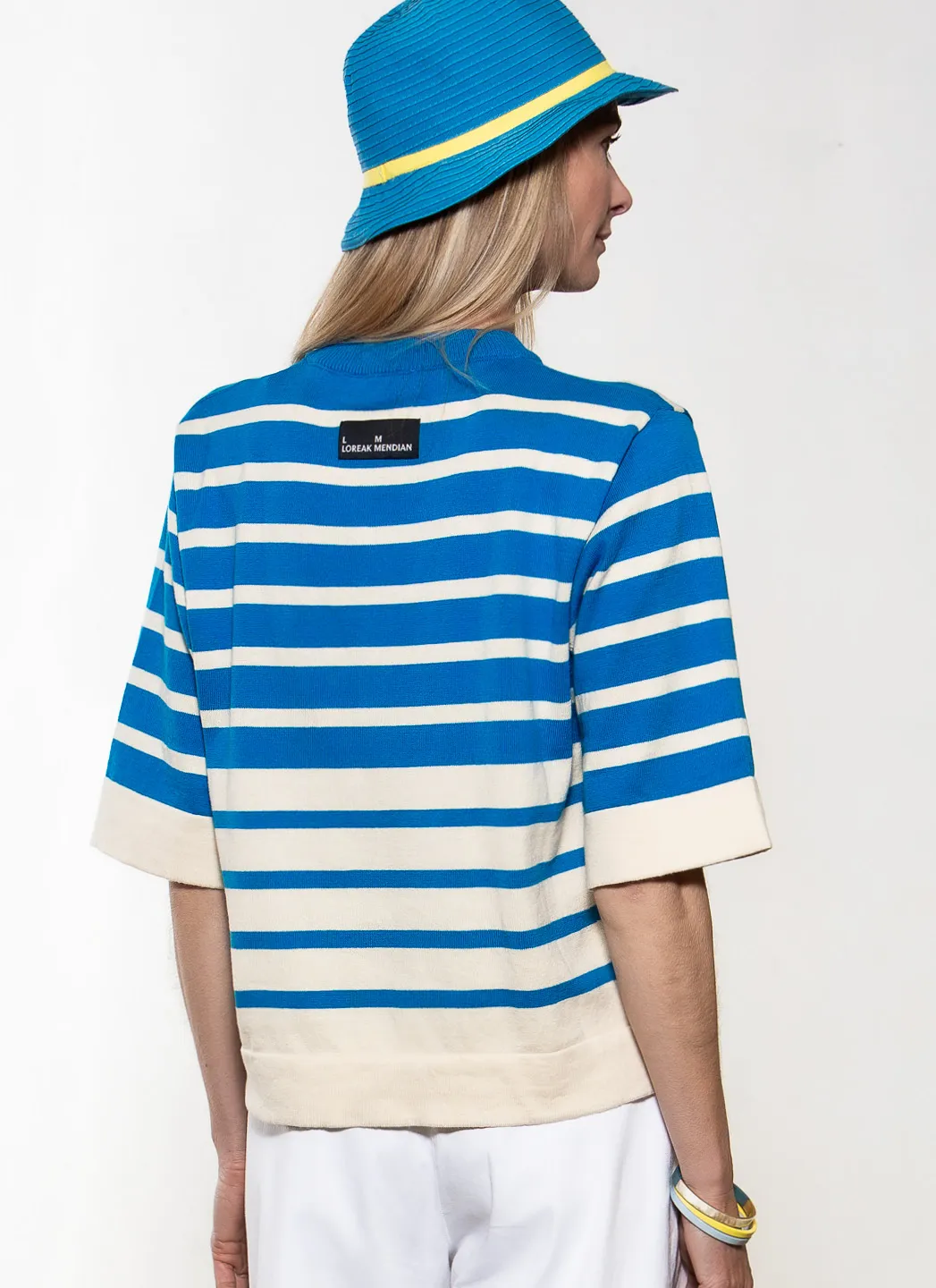 Pull en maille au motif rayé et manches 3/4, qui peut être porté à même la peau ou superposé à une chemise ou un tee-shirt blanc. Une pièce amusante qui rehausse n’importe quelle tenue.