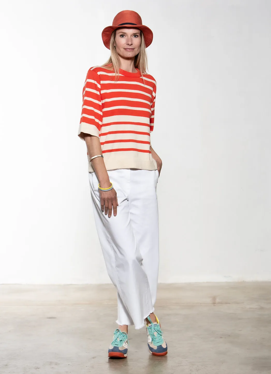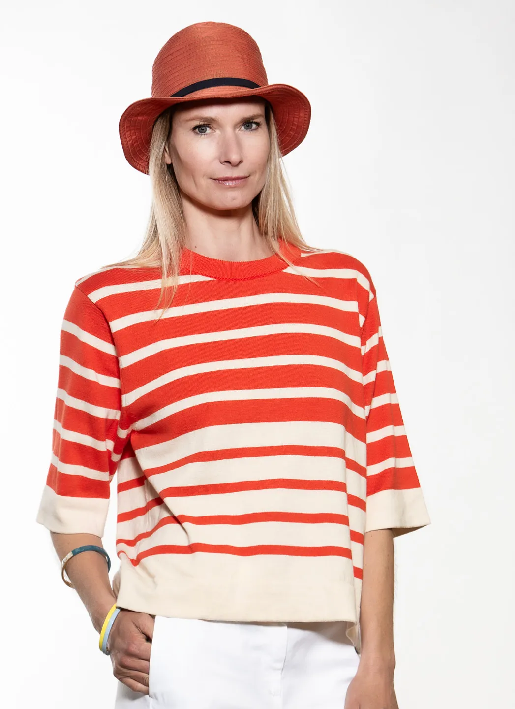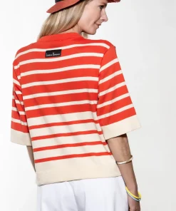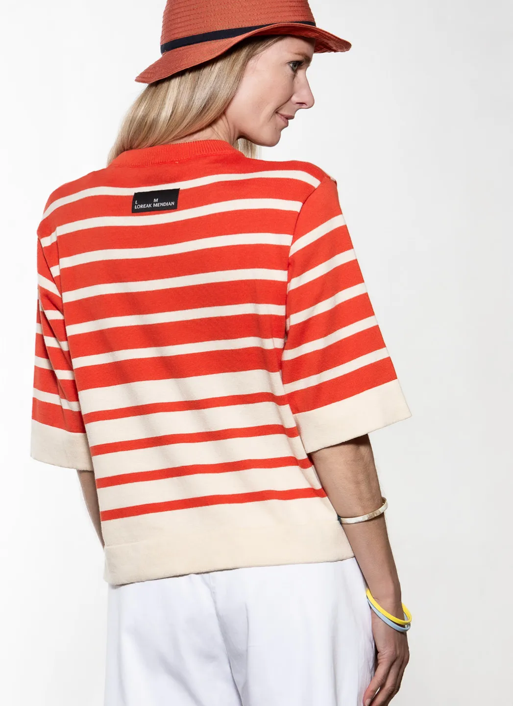 Pull en maille au motif rayé et manches 3/4, qui peut être porté à même la peau ou superposé à une chemise ou un tee-shirt blanc. Une pièce amusante qui rehausse n’importe quelle tenue.