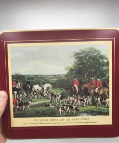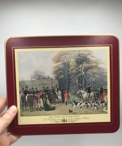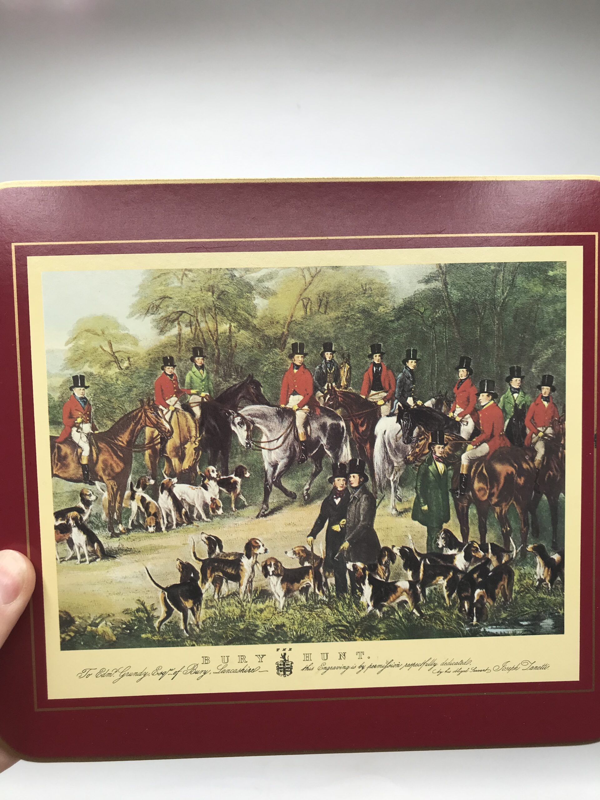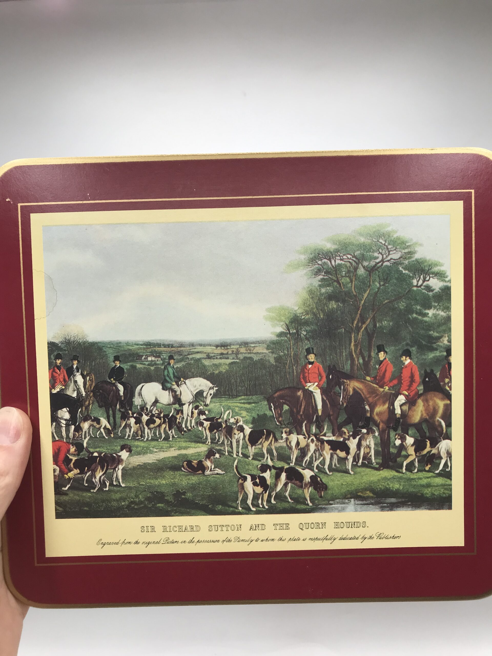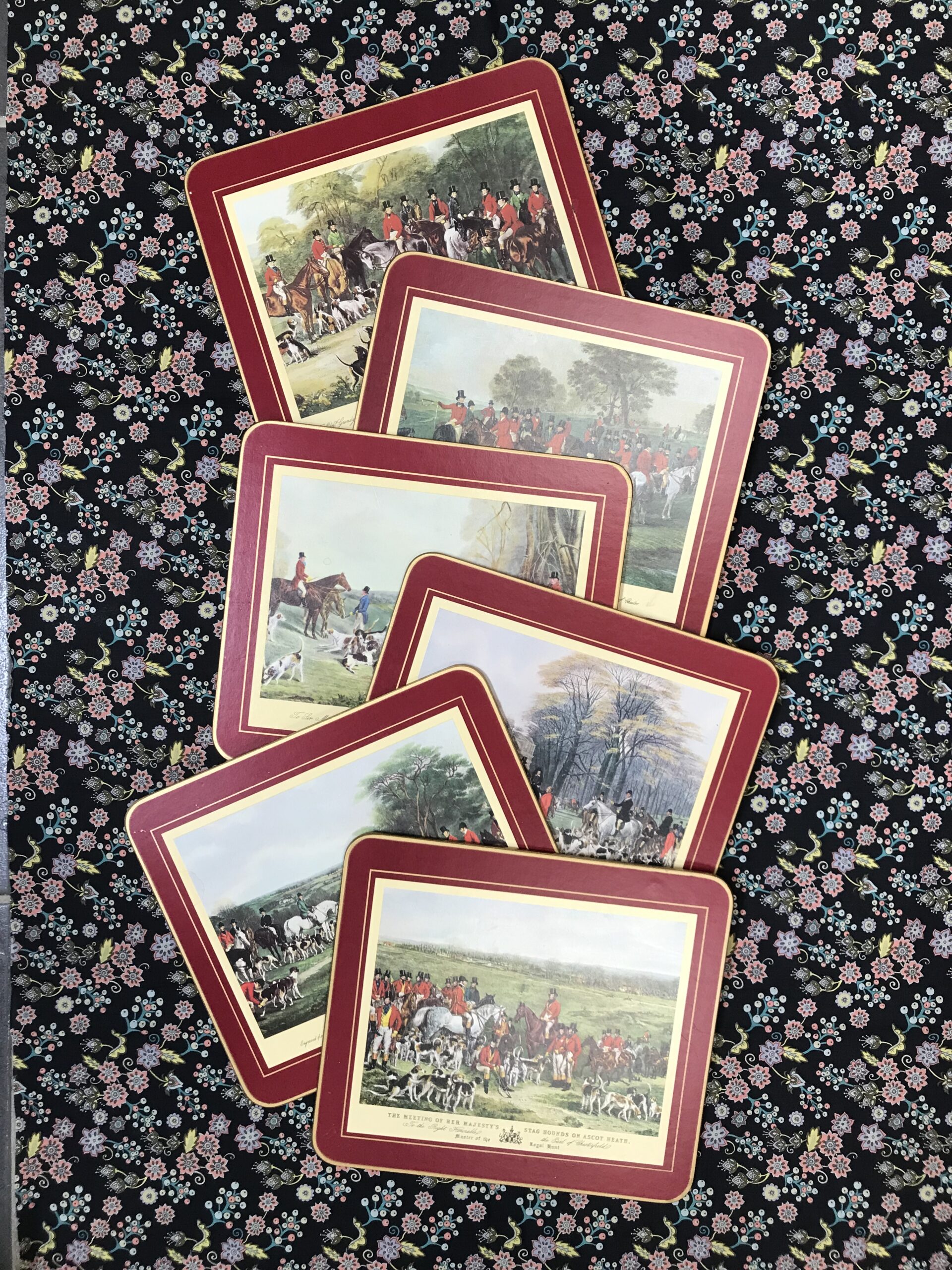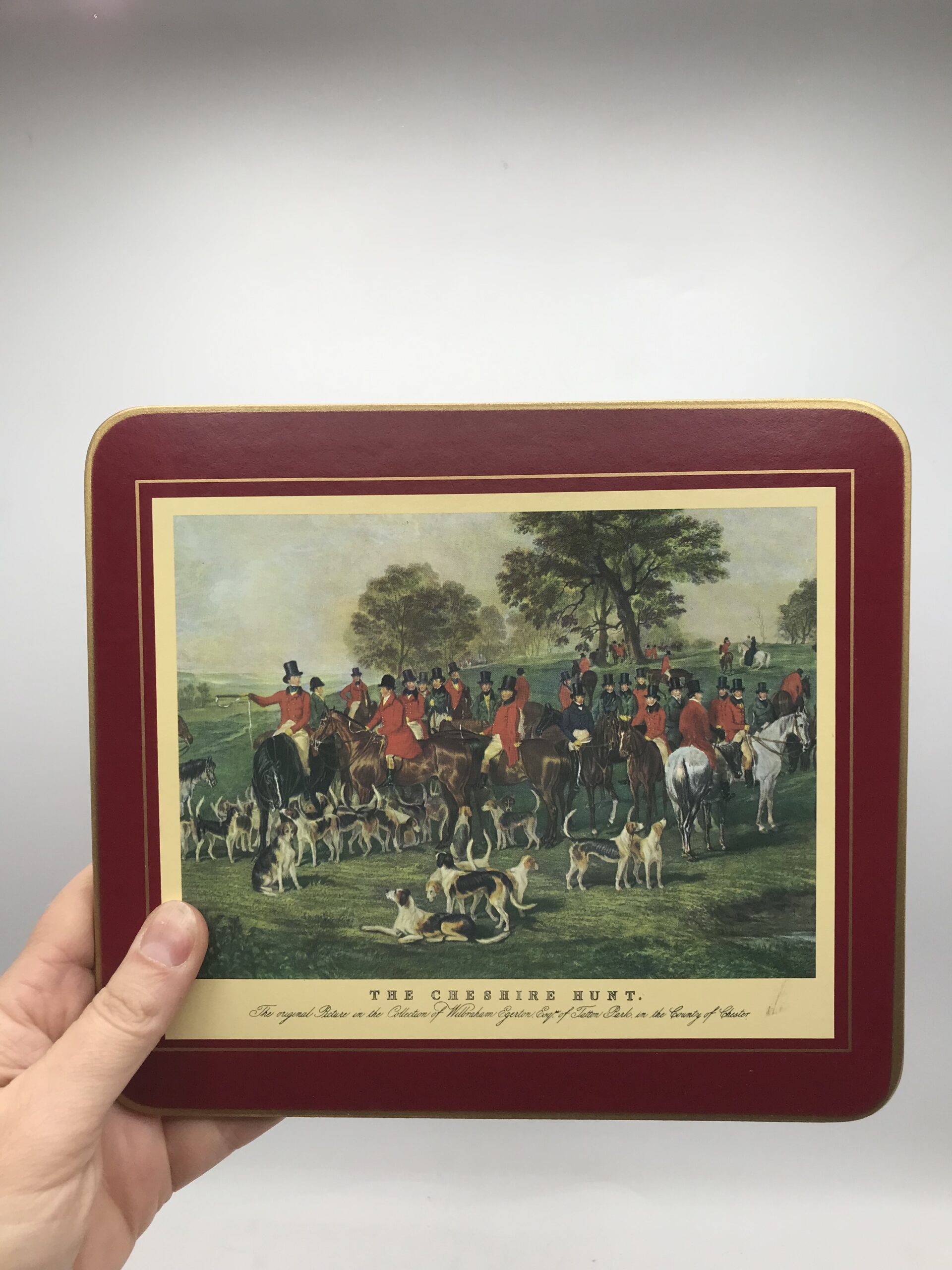 Lot 6 set de table « Clover Leaf ». Magnifique coffret de 6 set de table Clover Leaf. Les sets sont dans un très bon état mais la boite porte des marques d’usure (cf photos). Les sets ont une taille de 19 cm de hauteur par 21,5 cm. Les sets de table représentent des scènes de chasse, ils sont de couleur rouge bordeaux et doré, l’arrière est en liège. Idéal pour apporter une note vintage sur votre table, un air d’antan. Cassez les codes pour un style affirmé et décalé. Le charme du vintage, le charme des illustrations d’avant. Clover Leaf une marque anglaise chic et choc. Une belle idée cadeau pour les amateurs de représentations de chasse.