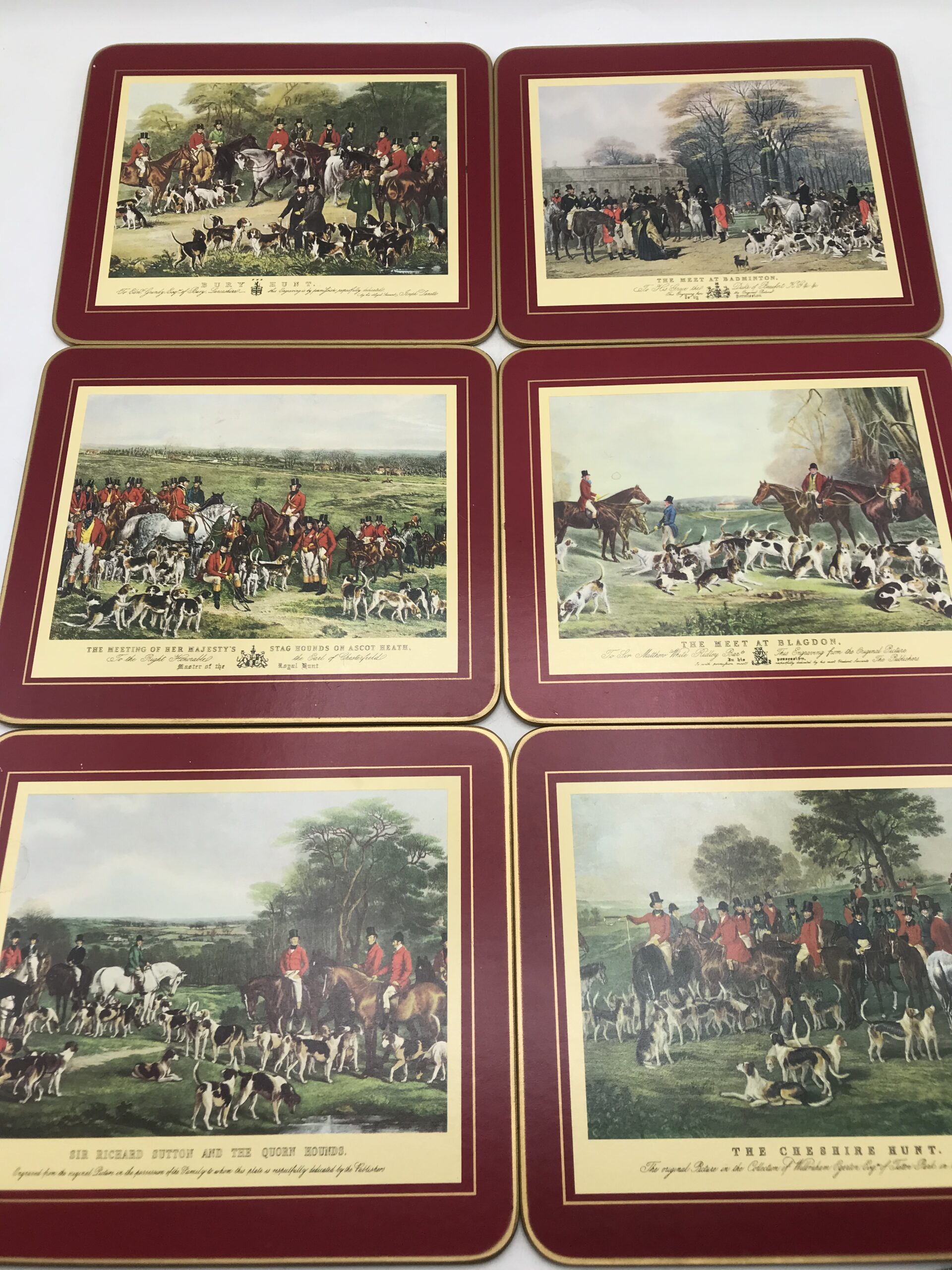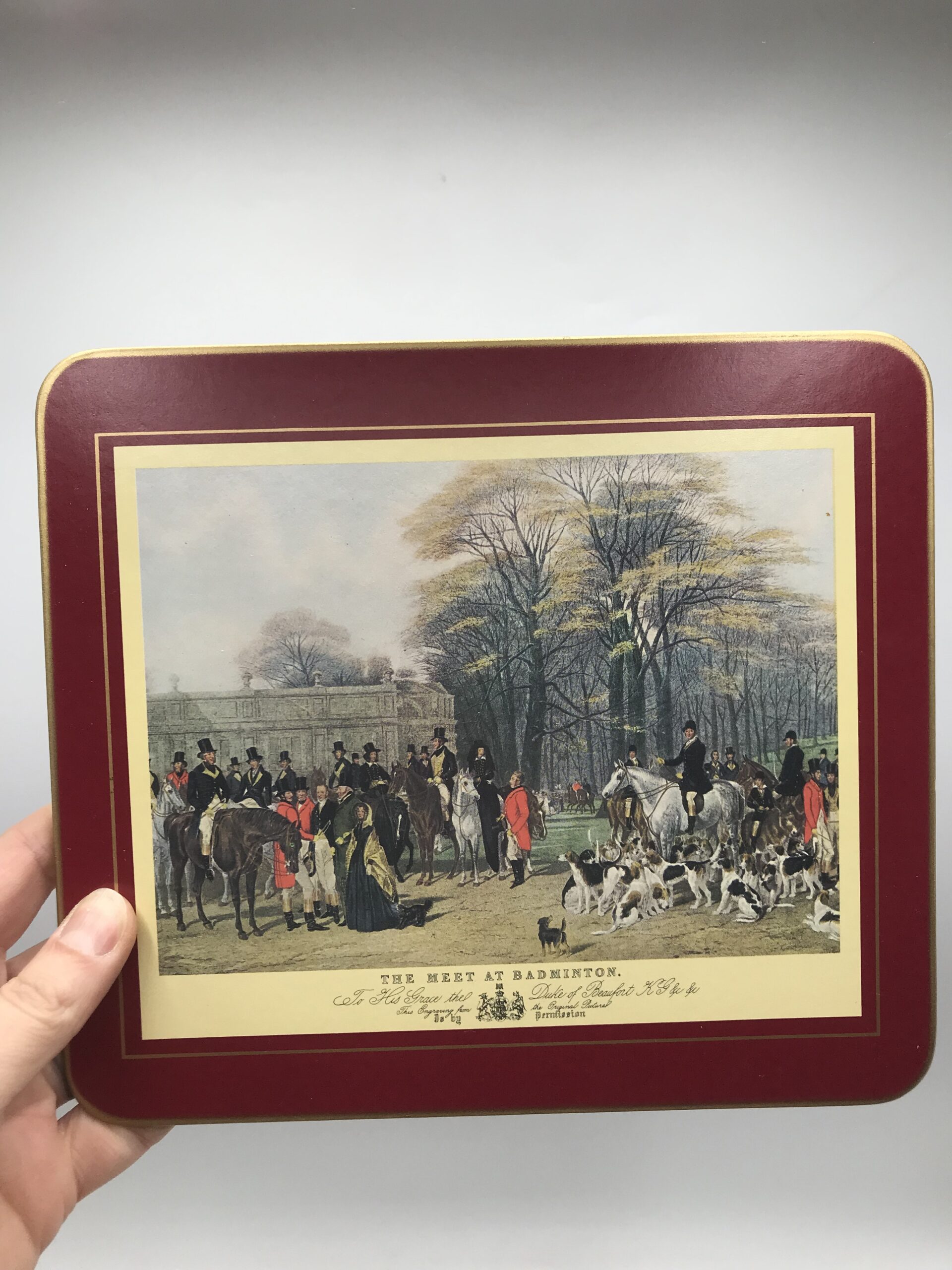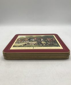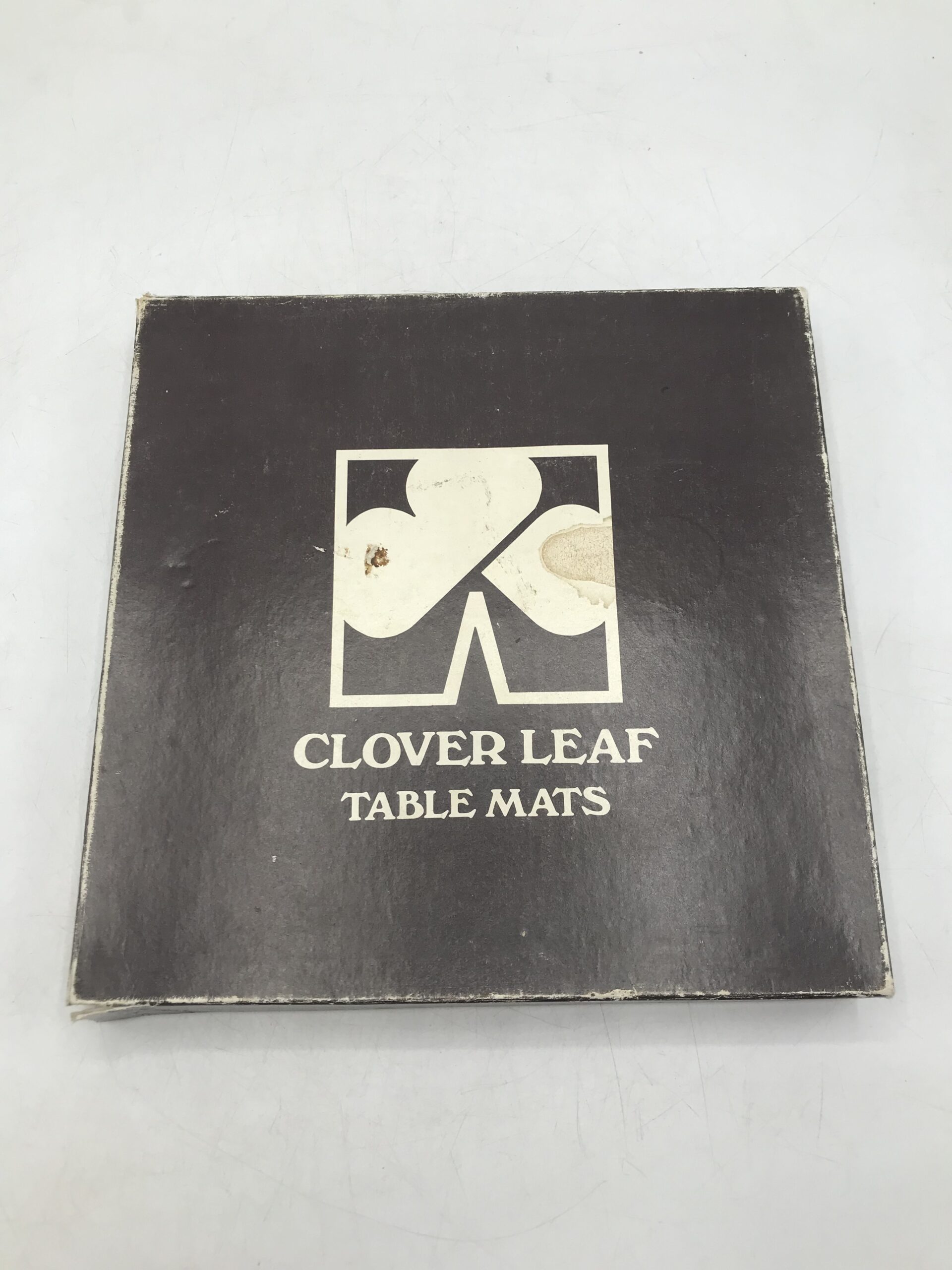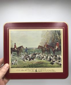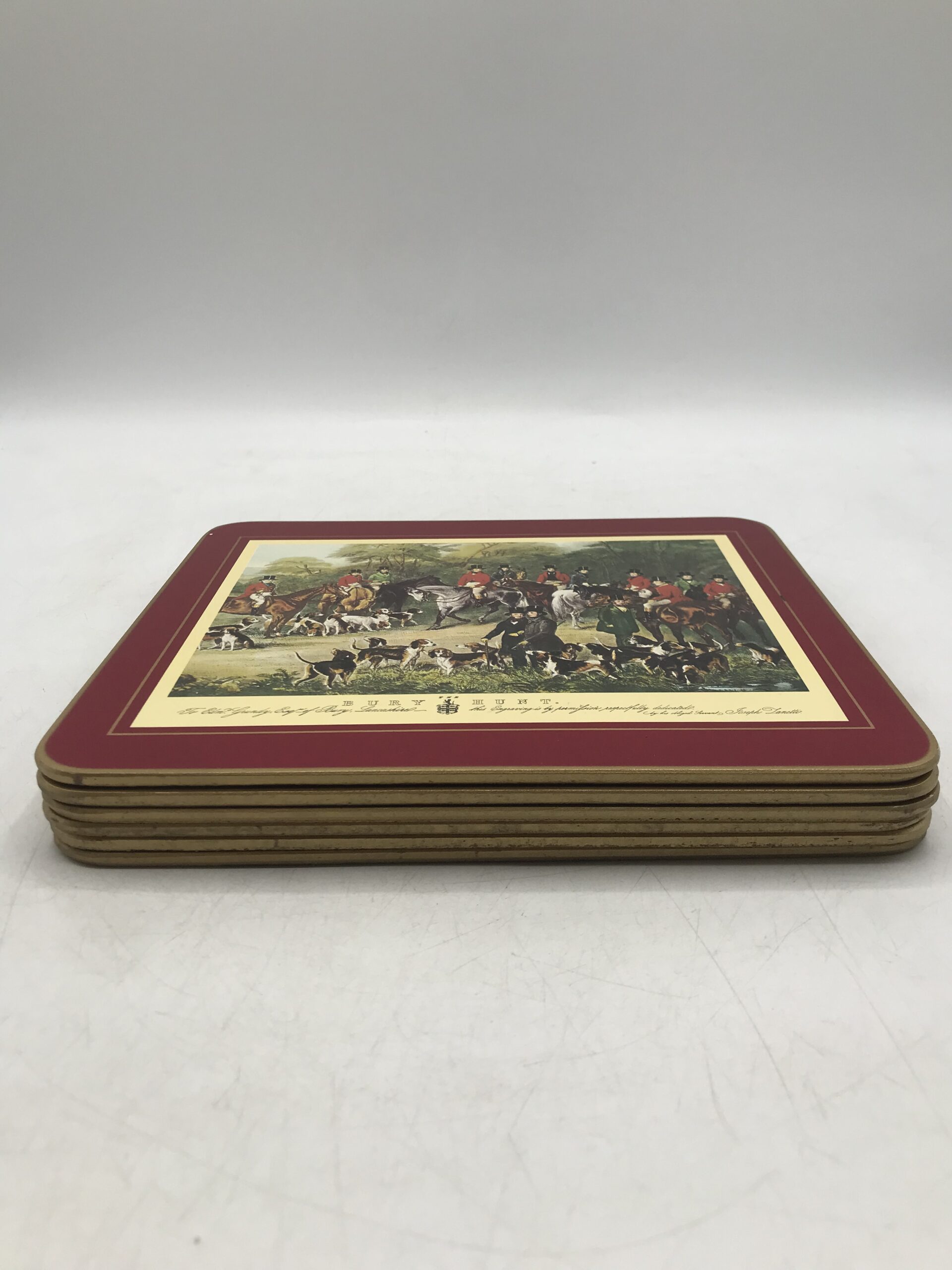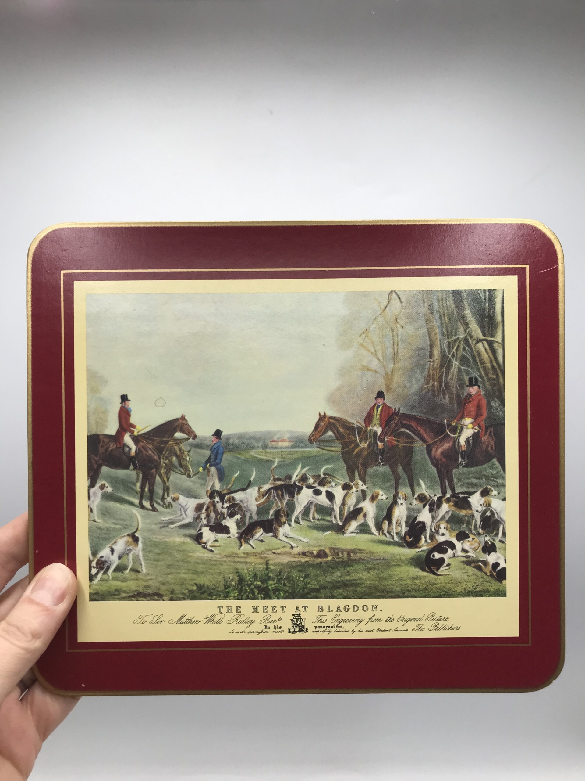Lot 6 set de table « Clover Leaf ». Magnifique coffret de 6 set de table Clover Leaf. Les sets sont dans un très bon état mais la boite porte des marques d’usure (cf photos). Les sets ont une taille de 19 cm de hauteur par 21,5 cm. Les sets de table représentent des scènes de chasse, ils sont de couleur rouge bordeaux et doré, l’arrière est en liège. Idéal pour apporter une note vintage sur votre table, un air d’antan. Cassez les codes pour un style affirmé et décalé. Le charme du vintage, le charme des illustrations d’avant. Clover Leaf une marque anglaise chic et choc. Une belle idée cadeau pour les amateurs de représentations de chasse.