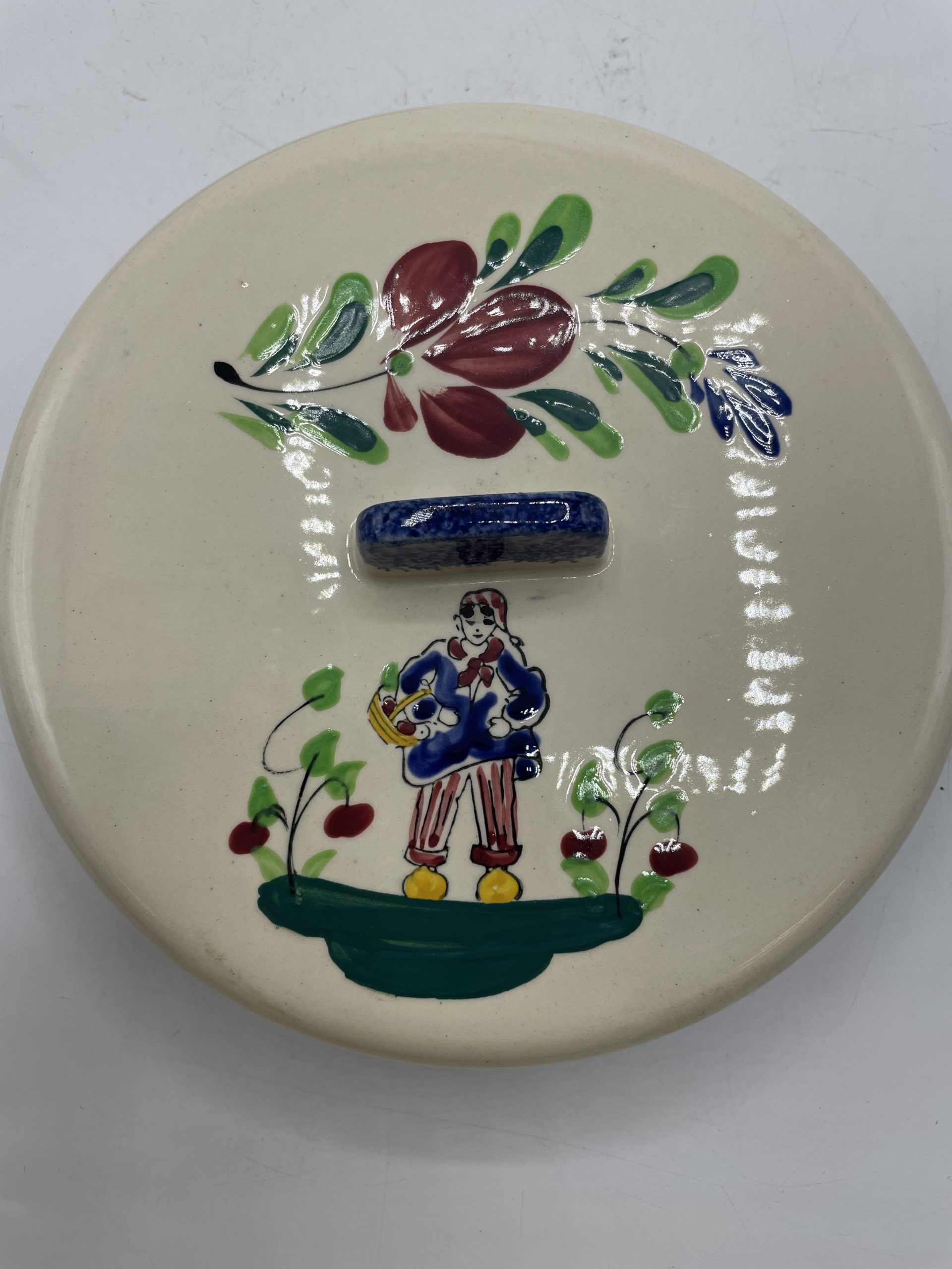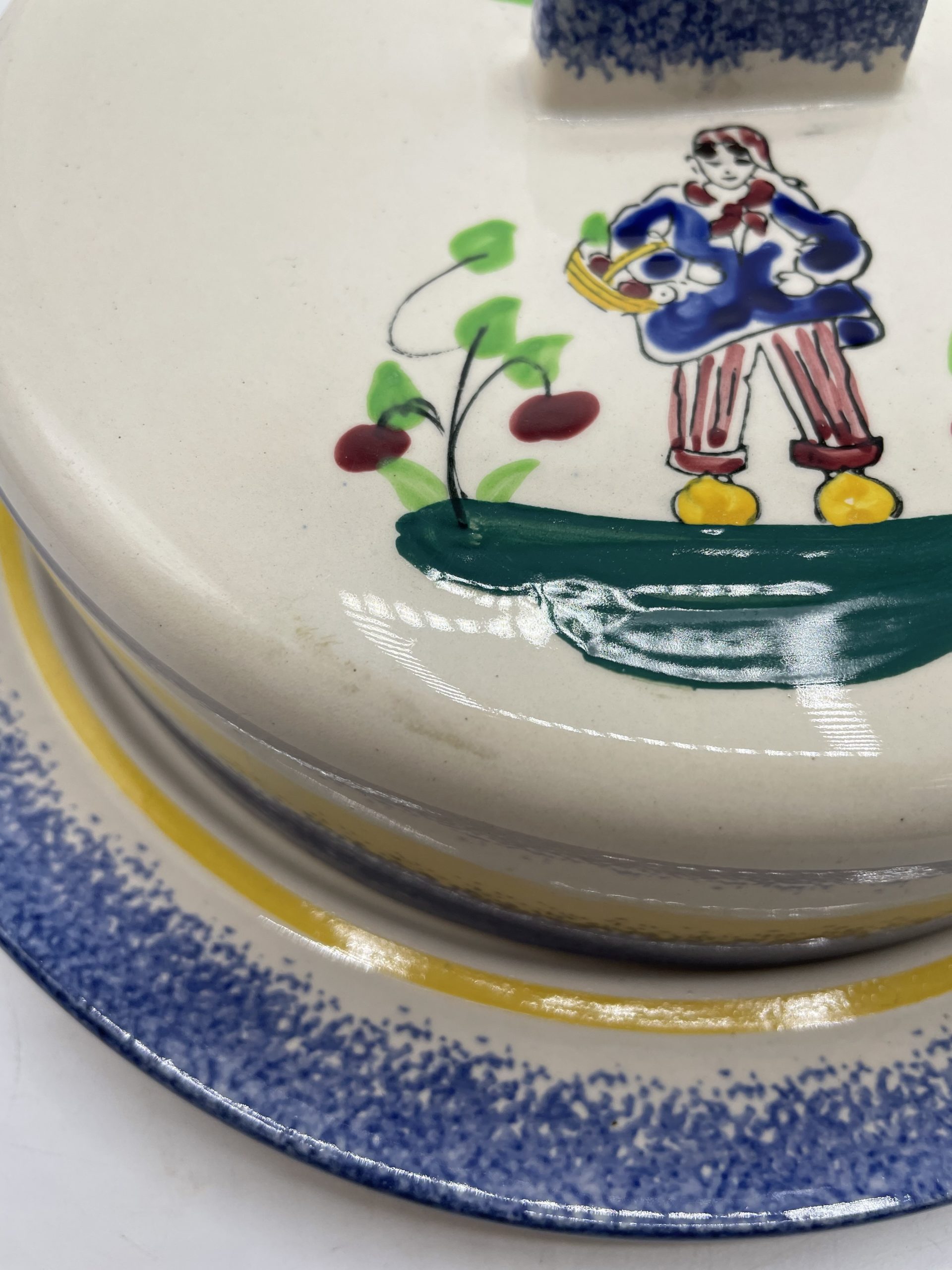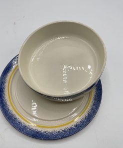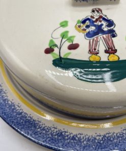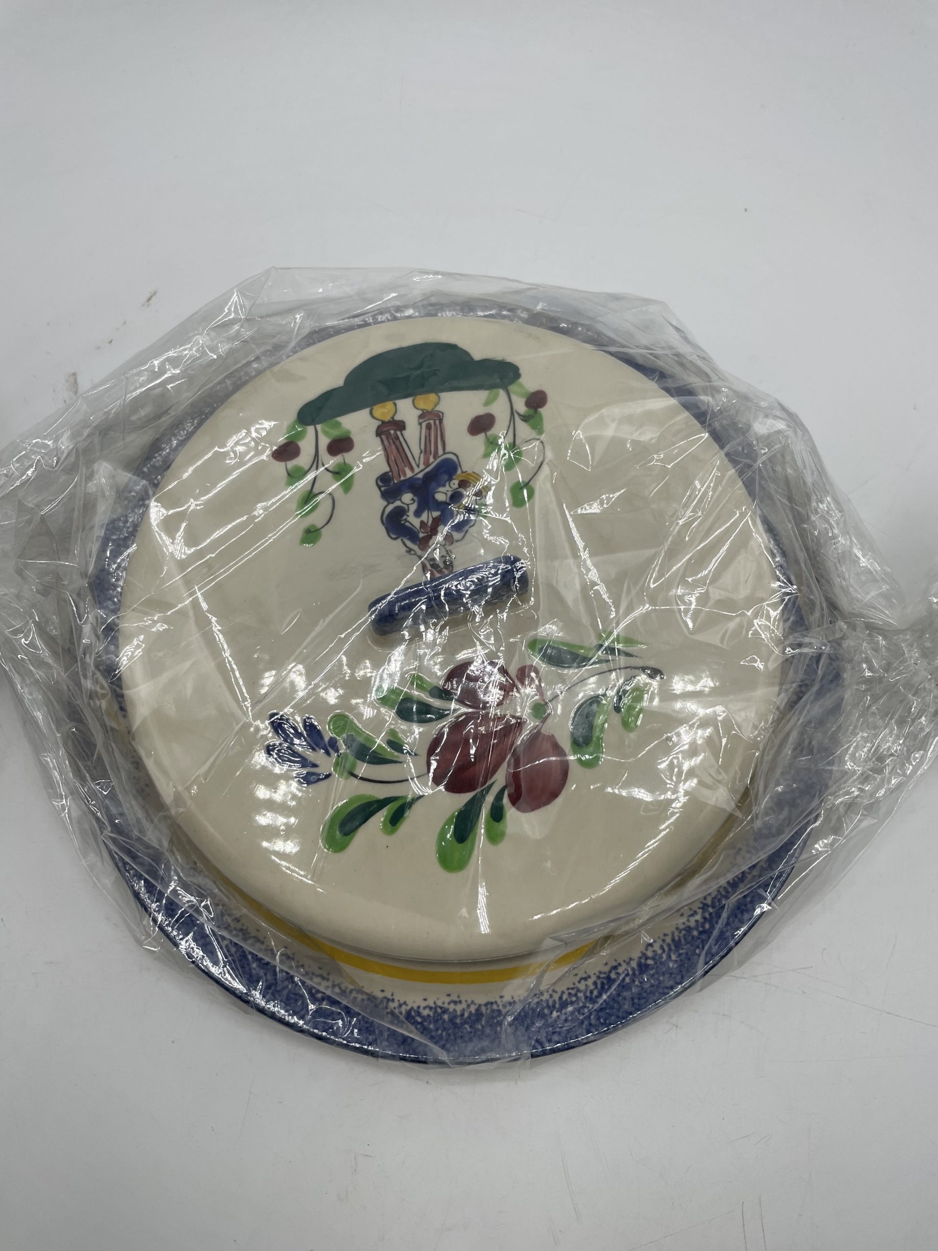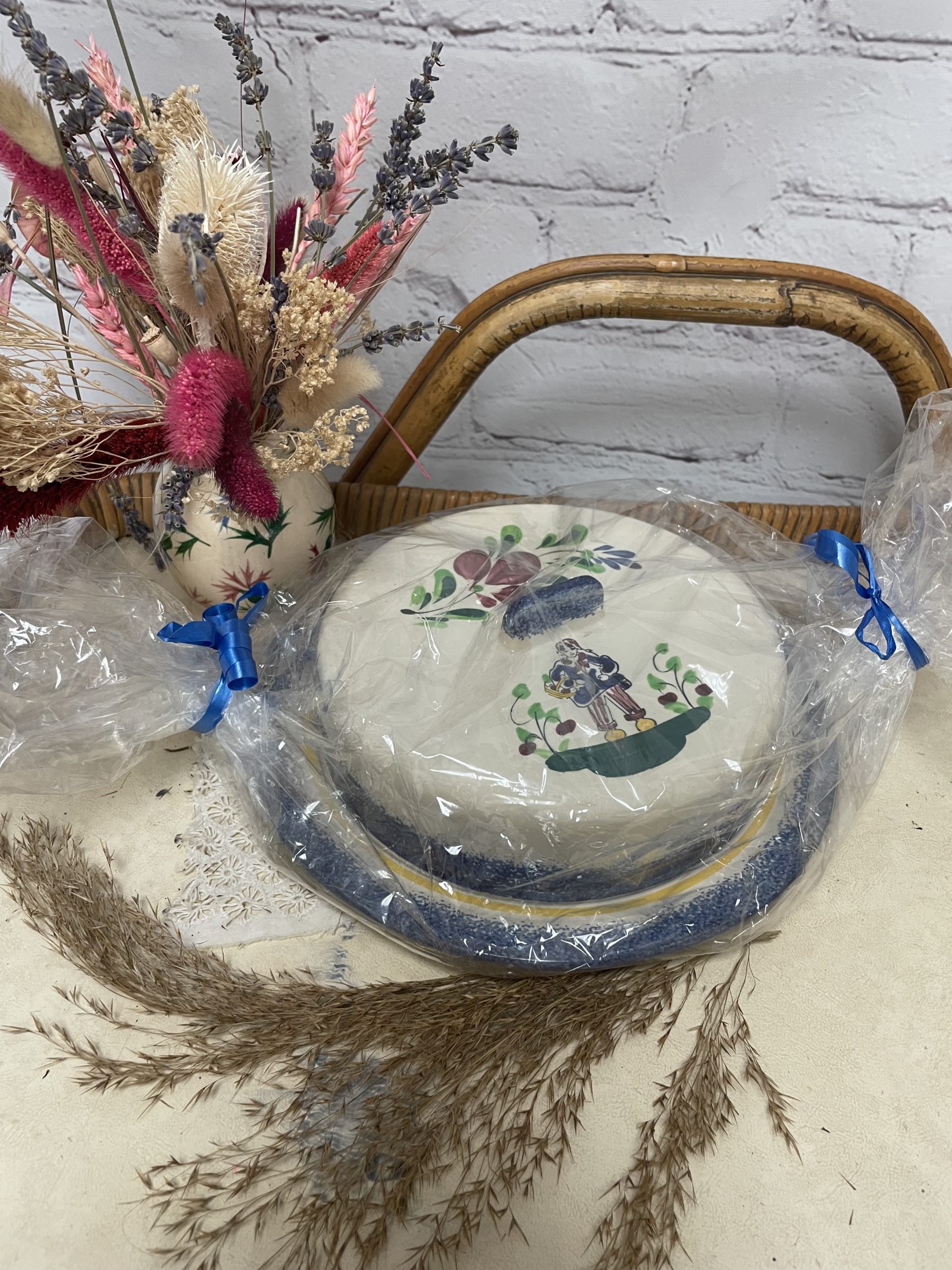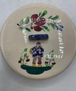 Ce joli lot se compose d’un assiette plate et de sa cloche individuelle. En céramique, l’assiette est la cloche de couleur beige sont décorées de frises bleues tachetées et d’un liseré jaune ainsi que de motifs de fleurs et d’un personnage en habits normands traditionnels qui tient un panier. Encore sous emballage, ce joli lot de vaisselle est marqué Honfleur, et il s’agit très certainement d’un cadeau souvenir de la commune située en Normandie. Un joli lot à collectionner.
