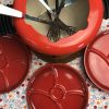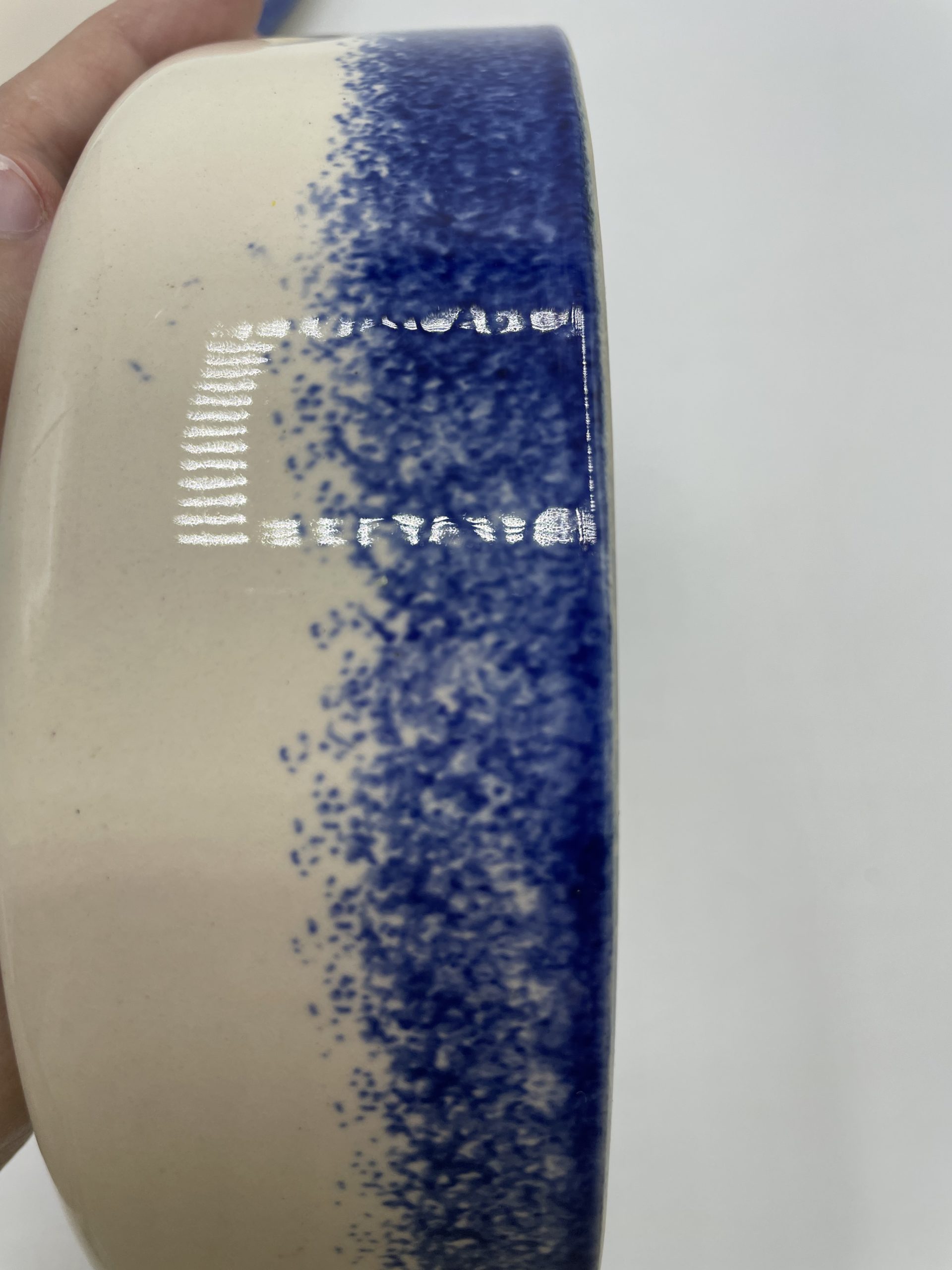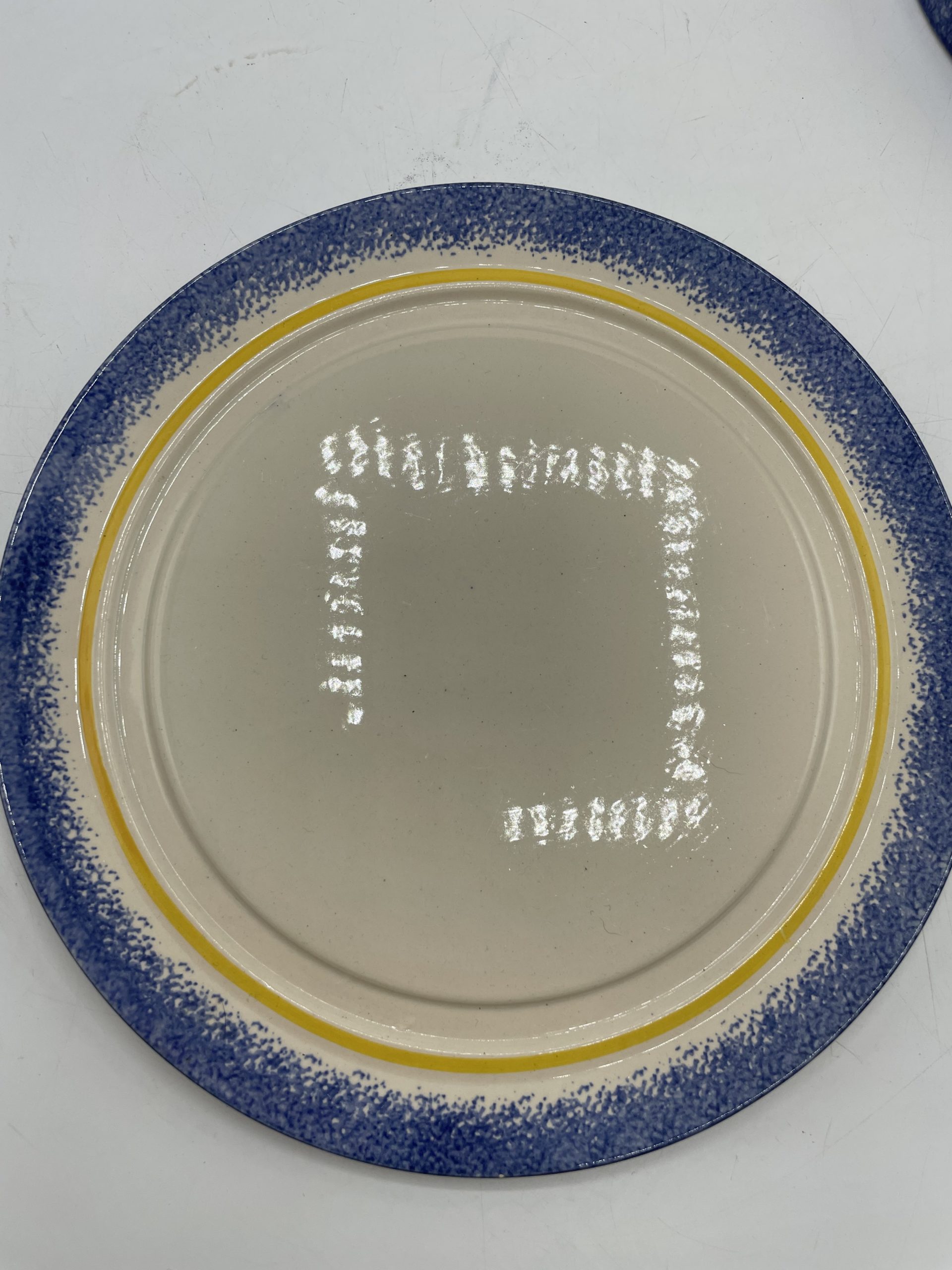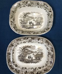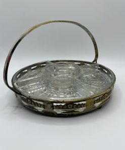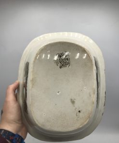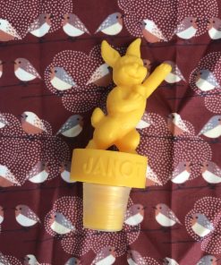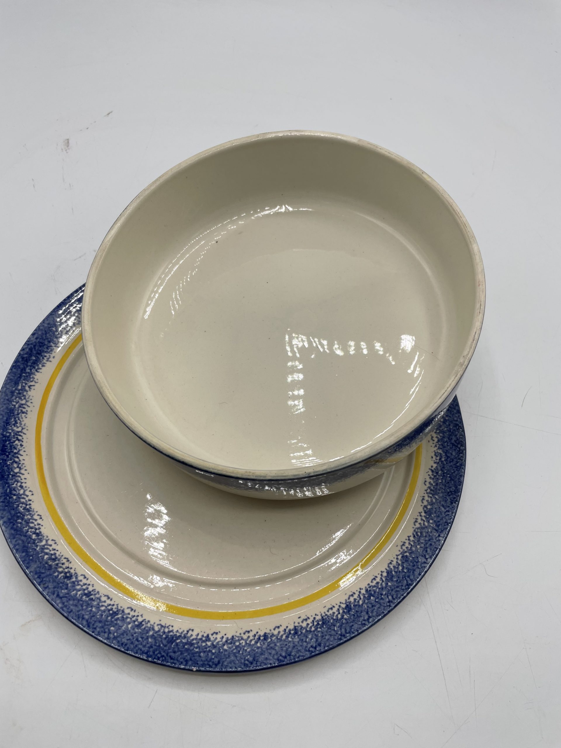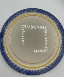 Ce joli lot se compose d’un assiette plate et de sa cloche individuelle. En céramique, l’assiette est la cloche de couleur beige sont décorées de frises bleues tachetées et d’un liseré jaune ainsi que de motifs de fleurs et d’un personnage en habits normands traditionnels qui tient un panier. Encore sous emballage, ce joli lot de vaisselle est marqué Honfleur, et il s’agit très certainement d’un cadeau souvenir de la commune située en Normandie. Un joli lot à collectionner.