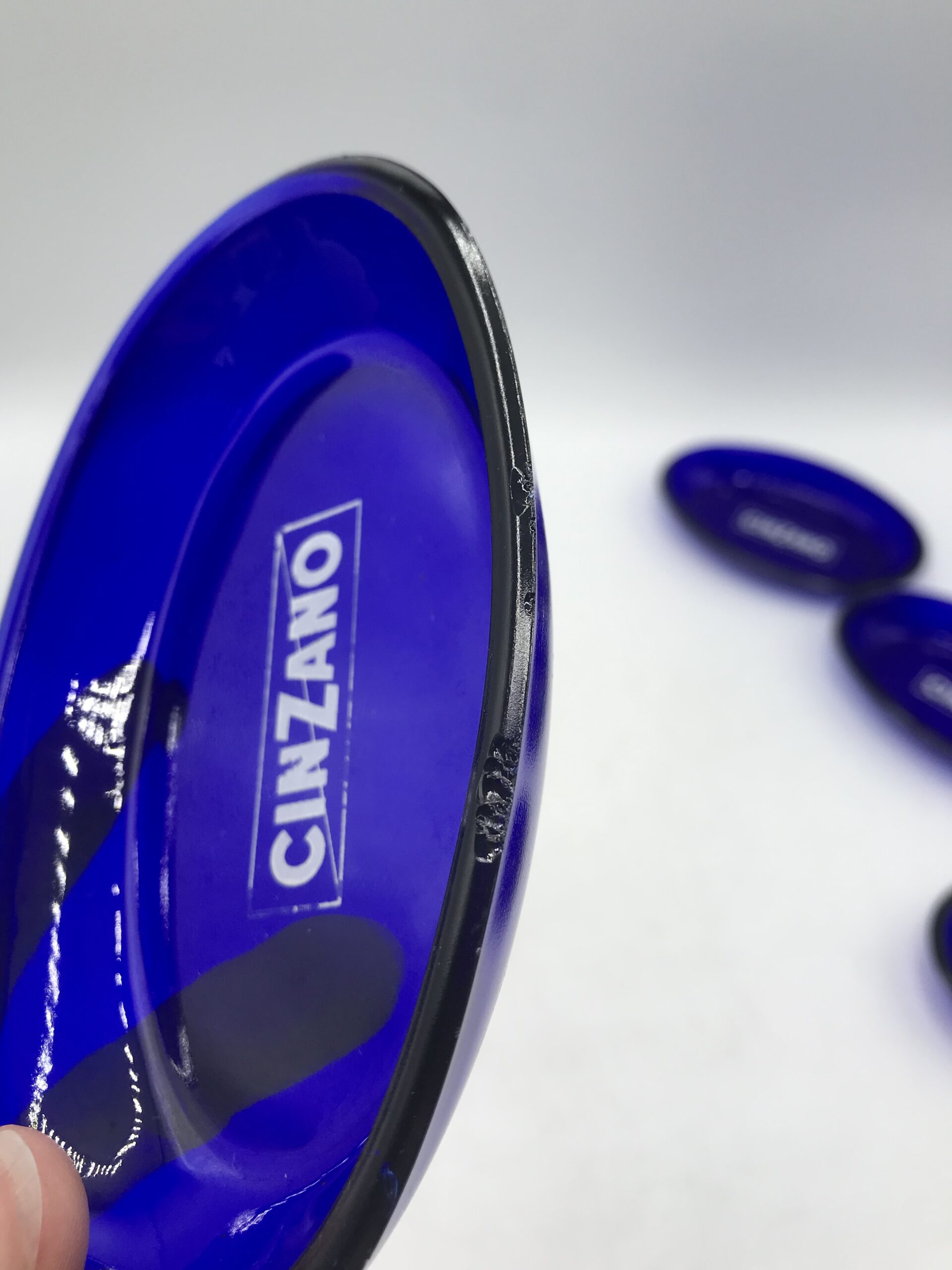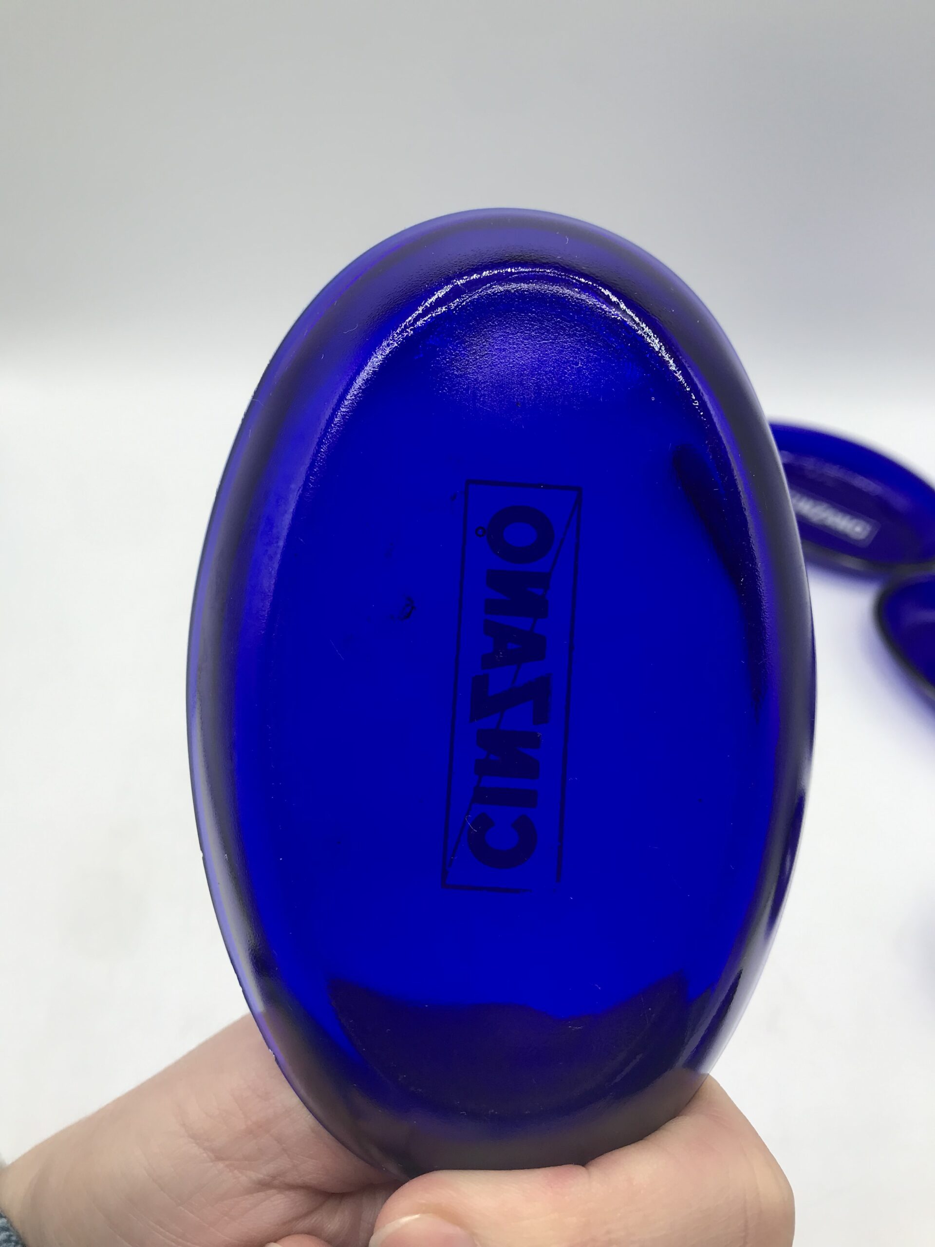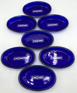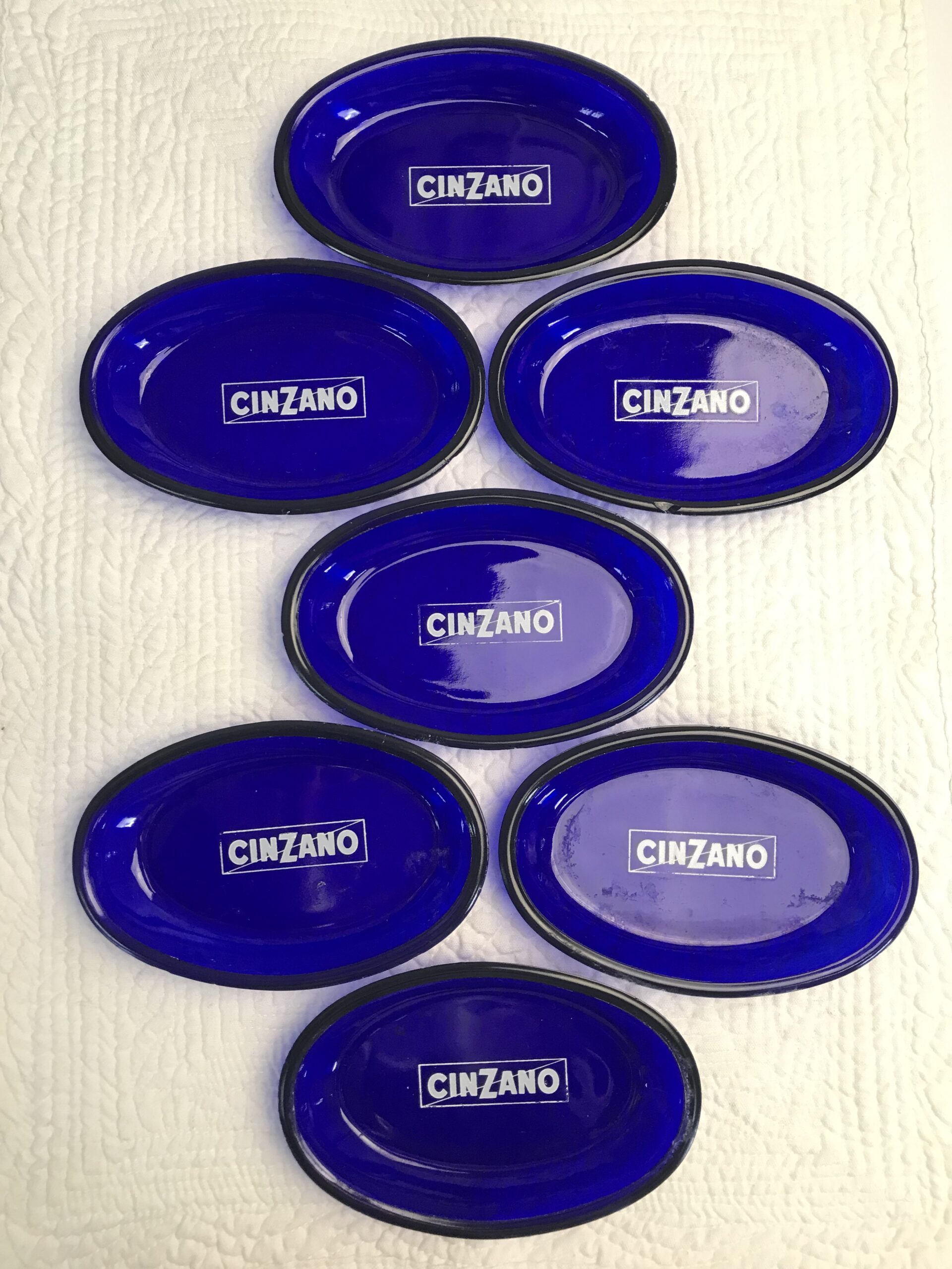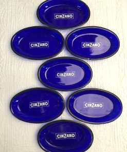 Lot de 7 cendriers Cinzano. Pour les collectionneurs de produits publicitaires, ou les fans de la marque, ou même les restaurateurs. Ces cendriers vont vous faire craquer. Ils peuvent également servir de ramasse monnaie ou vide poche. Ils sont en verre de couleur bleu. De forme ovale, ils ont une taille de 14 cm par 9 cm pour une hauteur de 2 cm. Certains ont des petits éclats sur les bords (cf photos). En bon état général, il sont prêt à fait éclater leur bleu électrique.