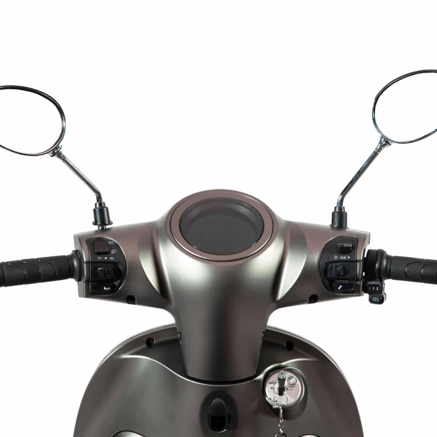 L’écran de bord de ce scooter électrique est très lisible. Blanc sur noir, il indique en son centre la vitesse instantanée, le mode de vitesse sélectionné. Également, un odomètre, l’heure, la température extérieure, clignotants, phares ou l’état de charge des batteries.