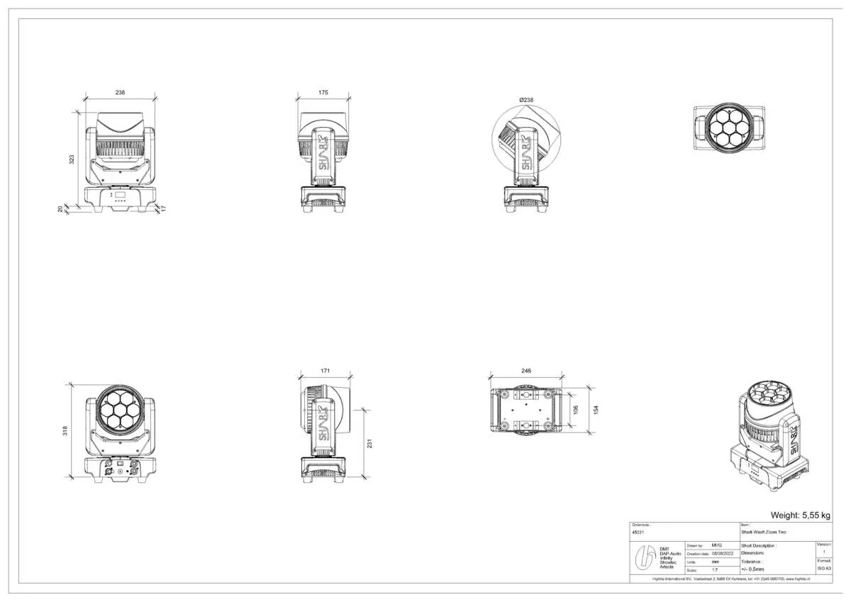 Caractéristiques et dimensions de la lyre Showtec Shark Wash Zoom Two :