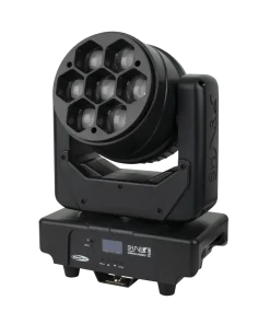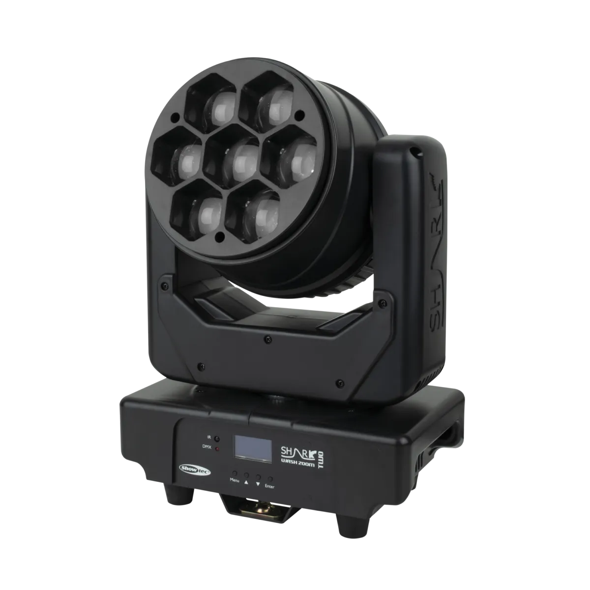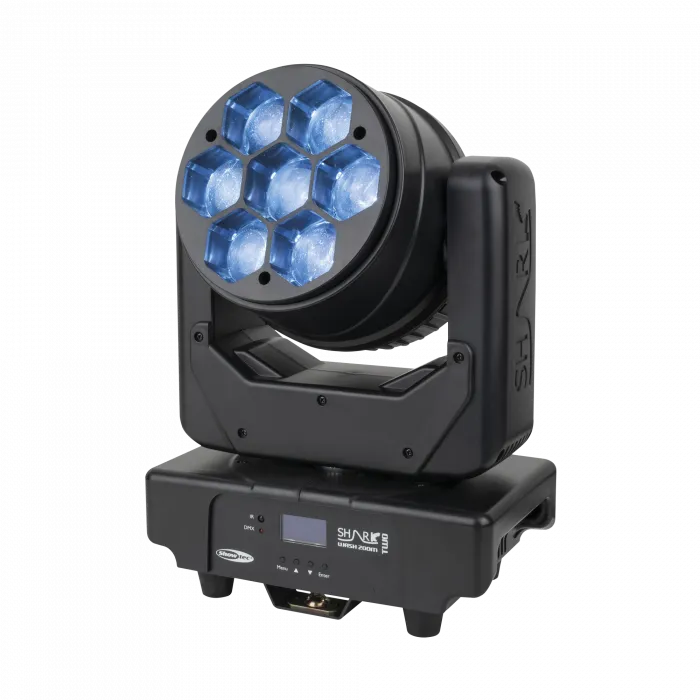 La Showtec Shark Wash Zoom Two est une lyre Wash, dotée de sept spots LED RGBW de 30 watts, qui s’utilise en intérieur. Grâce à son zoom motorisé, elle n’a aucun mal à produire un effet Wash classique, avec un angle de faisceau compris entre 6° et 38°. Les fonctions de gradation et lumière stroboscopique rendent cette lyre Wash encore plus polyvalente. La Shark Wash Zoom Two fonctionne en mode DMX, Auto ou Sound, en tant que maître ou esclave. Vous pouvez aussi utiliser la télécommande incluse.