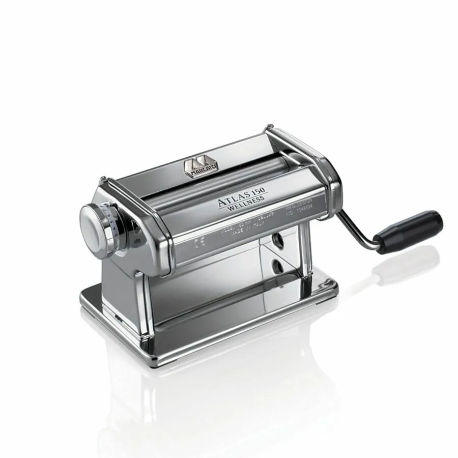 Machine à pâtes manuelle Marcato. Structure en acier chromé, rouleaux en aluminium anodisé, engrenages en acier trempé. Dimensions (cm) : 34 x 20.5 x 29.