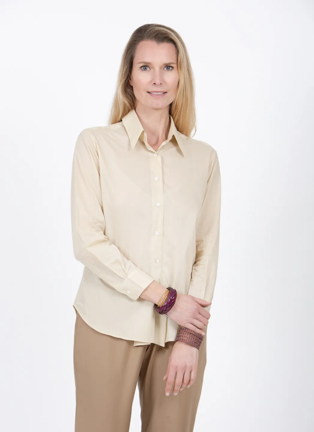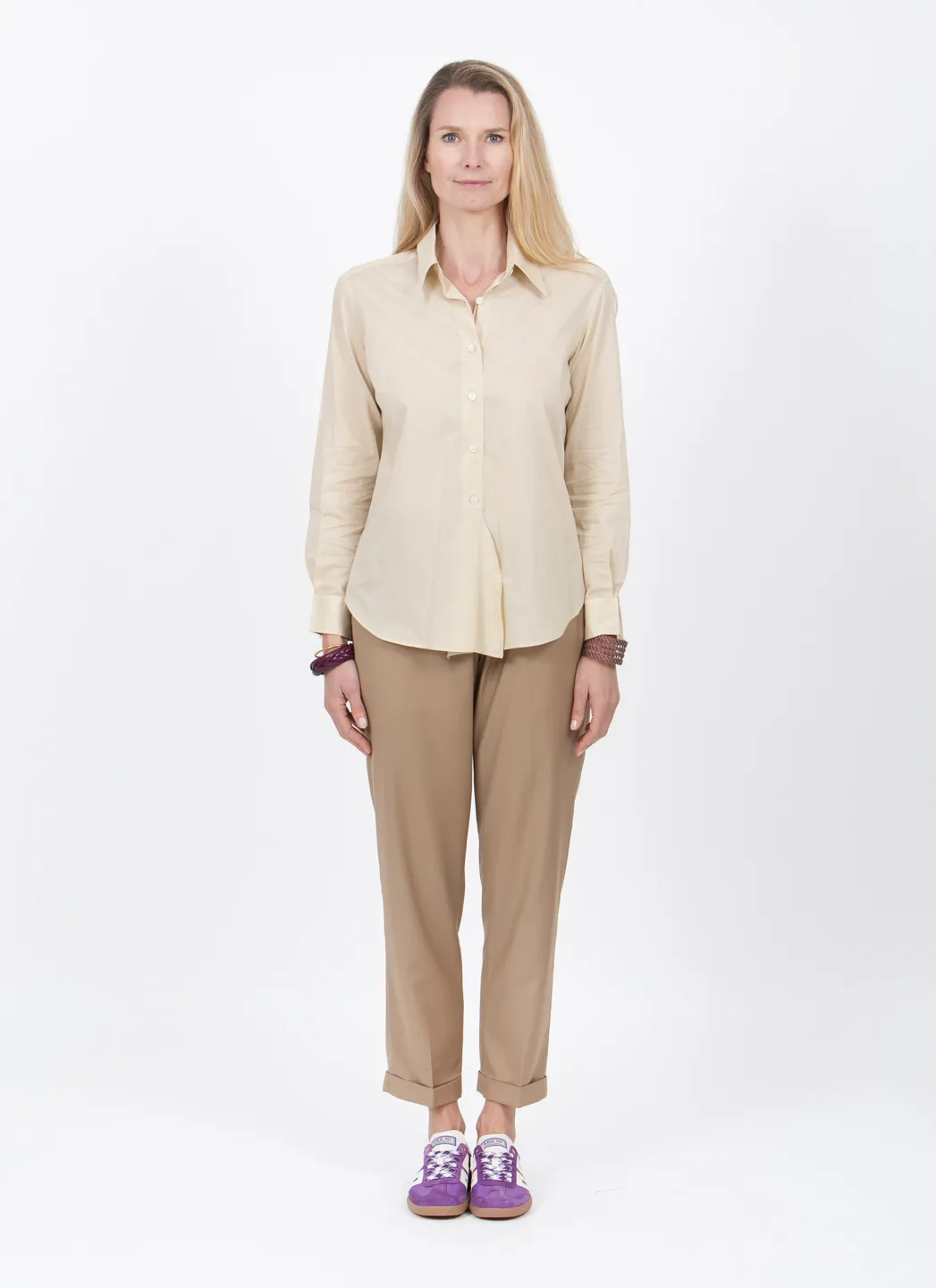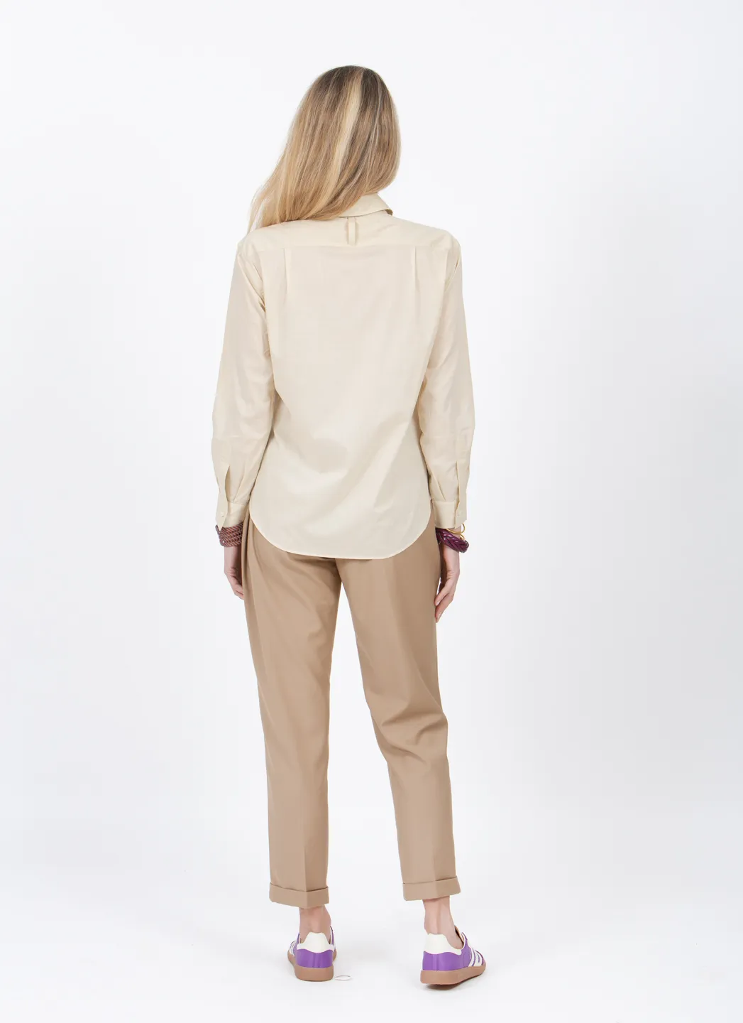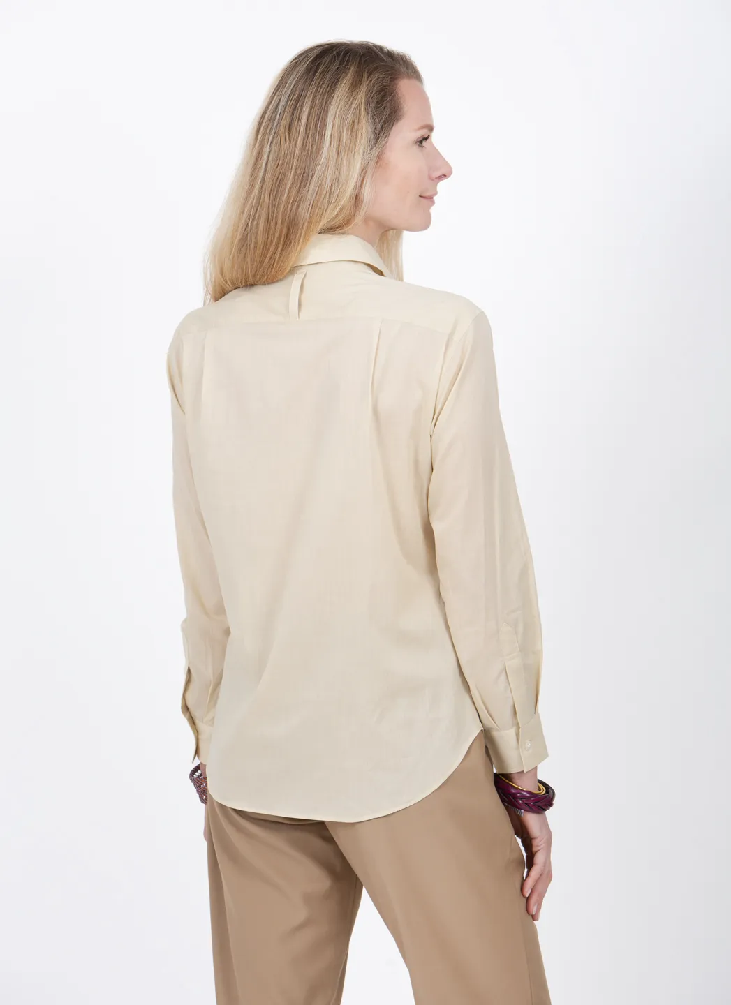 La chemise Marcel est notre version de la chemise classique, mais elle peut être portée de façon plus ou moins habillée. Nous avons opté pour un coton très léger qui se drape merveilleusement bien et offre un grand confort au contact de la peau.